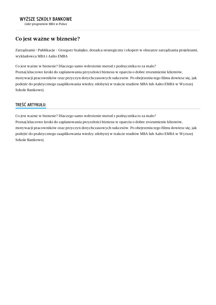 WYŻSZE SZKOŁY BANKOWE Lider programów MBA w Polsce Co jest ważne w biznesie? Zarządzanie | Publikacje / Grzegorz Szałajko, doradca strategiczny i ekspert w obszarze zarządzania projektami, wykładowca MBA i Aalto EMBA Co jest ważne w biznesie? Dlaczego samo wdrożenie metod z podręcznika to za mało? Poznaj kluczowe kroki do zaplanowania przyszłości biznesu w oparciu o dobre zrozumienie klientów, motywacji pracowników oraz przyczyn dotychczasowych sukcesów. Po obejrzeniu tego filmu dowiesz się, jak podejść do praktycznego zaaplikowania wiedzy zdobytej w trakcie studiów MBA lub Aalto EMBA w Wyższej Szkole Bankowej. TREŚĆ ARTYKUŁU: Co jest ważne w biznesie? Dlaczego samo wdrożenie metod z podręcznika to za mało? Poznaj kluczowe kroki do zaplanowania przyszłości biznesu w oparciu o dobre zrozumienie klientów, motywacji pracowników oraz przyczyn dotychczasowych sukcesów. Po obejrzeniu tego filmu dowiesz się, jak podejść do praktycznego zaaplikowania wiedzy zdobytej w trakcie studiów MBA lub Aalto EMBA w Wyższej Szkole Bankowej.