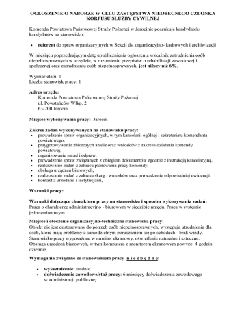 OGŁOSZENIE O NABORZE W CELU ZASTĘPSTWA NIEOBECNEGO CZŁONKA KORPUSU SŁUŻBY CYWILNEJ Komenda Powiatowa Państwowej Straży Pożarnej w Jarocinie poszukuje kandydatek/ kandydatów na stanowisko: referent do spraw organizacyjnych w Sekcji ds. organizacyjno- kadrowych i archiwizacji W miesiącu poprzedzającym datę upublicznienia ogłoszenia wskaźnik zatrudnienia osób niepełnosprawnych w urzędzie, w rozumieniu przepisów o rehabilitacji zawodowej i społecznej oraz zatrudnianiu osób niepełnosprawnych, jest niższy niż 6%. Wymiar etatu: 1 Liczba stanowisk pracy: 1 Adres urzędu: Komenda Powiatowa Państwowej Straży Pożarnej ul. Powstańców Wlkp. 2 63-200 Jarocin Miejsce wykonywania pracy: Jarocin Zakres zadań wykonywanych na stanowisku pracy: prowadzenie spraw organizacyjnych, w tym kancelarii ogólnej i sekretariatu komendanta powiatowego, przygotowywanie zbiorczych analiz oraz wniosków z zakresu działania komendy powiatowej, organizowanie narad i odpraw, prowadzenie spraw związanych z obiegiem dokumentów zgodnie z instrukcją kancelaryjną, realizowanie zadań z zakresu planowania pracy komendy, obsługa urządzeń biurowych, realizowanie zadań z zakresu skarg i wniosków oraz prowadzenie odpowiedniej ewidencji, kontakt z urzędami i instytucjami, Warunki pracy: Warunki dotyczące charakteru pracy na stanowisku i sposobu wykonywania zadań: Praca o charakterze administracyjno - biurowym w siedzibie urzędu. Praca w systemie jednozmianowym. Miejsce i otoczenie organizacyjno-techniczne stanowiska pracy: Obiekt nie jest dostosowany do potrzeb osób niepełnosprawnych, występują utrudnienia dla osób, które mają problemy z samodzielnym poruszaniem się po schodach - brak windy. Stanowisko pracy wyposażone w monitor ekranowy, oświetlenie naturalne i sztuczne. Obsługa urządzeń biurowych, w tym komputera z monitorem ekranowym powyżej 4 godzin dziennie. Wymagania związane ze stanowiskiem pracy n i e z b ę d n e: wykształcenie: średnie doświadczenie zawodowe/staż pracy: 6 miesięcy doświadczenia zawodowego w administracji publicznej pozostałe wymagania niezbędne: o znajomość przepisów: ustawa o PSP, ustawa o służbie cywilnej, kodeks postępowania administracyjnego, o biegła obsługa komputera i urządzeń biurowych, o zdolność analitycznego myślenia i formułowania wniosków, samodzielność, obowiązkowość, o umiejętność redagowania pism urzędowych, o znajomość zasad obiegu dokumentów w administracji, o wysoka kultura osobista. Wymagania dodatkowe: doświadczenie na stanowisku związanym z realizacją spraw organizacyjnych w jednostkach organizacyjnych Państwowej Straży Pożarnej, kurs obsługi komputera, umiejętność pracy pod presją czasu Wymagane dokumenty i oświadczenia: życiorys i list motywacyjny oświadczenie o wyrażeniu zgody na przetwarzanie danych osobowych do celów rekrutacji oświadczenie o korzystaniu z pełni praw publicznych oświadczenie o nieskazaniu prawomocnym wyrokiem za umyślne przestępstwo lub umyślne przestępstwo skarbowe kopie dokumentów potwierdzających wykształcenie kopia dokumentu potwierdzającego posiadanie polskiego obywatelstwa lub oświadczenie o posiadaniu obywatelstwa polskiego kopie dokumentów potwierdzających spełnienie wymagań niezbędnych i dodatkowych. Inne dokumenty i oświadczenia kopia dokumentu potwierdzającego niepełnosprawność - w przypadku kandydatek/kandydatów, zamierzających skorzystać z pierwszeństwa w zatrudnieniu w przypadku, gdy znajdą się w gronie najlepszych kandydatek/kandydatów kopie świadectw pracy. Termin składania dokumentów: 31-08-2015 Miejsce składania dokumentów: Komenda Powiatowa Państwowej Straży Pożarnej Powstańców Wlkp. 2 63-200 Jarocin Inne informacje: Oferty należy składać w zamkniętych kopertach z dopiskiem "Oferta pracy". Oferty otrzymane lub uzupełnione po terminie nie będą rozpatrywane (decyduje data stempla pocztowego). Dodatkowe informacje można uzyskać pod nr tel. 62 33 24 303 lub 62 33 24 300. Nasz urząd jest pracodawcą równych szans i wszystkie aplikacje są rozważane z równą uwagą bez względu na płeć, wiek, niepełnosprawność, rasę, narodowość, przekonania polityczne, przynależność związkową, pochodzenie etniczne, wyznanie, orientacje seksualną czy też jakąkolwiek inną cechę prawnie chronioną.