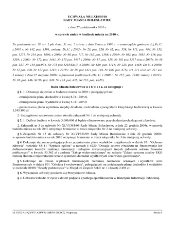 UCHWAŁA NR LXI/505/10 RADY MIASTA BOLESŁAWIEC z dnia 27 października 2010 r. w sprawie zmian w budżecie miasta na 2010 r. Na podstawie art. 18 ust. 2 pkt 4 art. 51 ust. 1 ustawy z dnia 8 marca 1990 r. o samorządzie gminnym (t.j.Dz.U. z 2001 r. Nr 142, poz. 1591; zmiany: Dz.U. z 2002r. Nr 23, poz. 220, Nr 62, poz. 558, Nr 113, poz. 984, Nr 153, poz. 1271, Nr 214, poz. 1806; z 2003r. Nr 80, poz. 717, Nr 162, poz. 1568; z 2004r. Nr 102, poz. 1055, Nr 116, poz. 1203; z 2005r. Nr 172, poz. 1441, Nr 175 poz. 1457 z 2006r. Nr 17, poz. 128, Nr 181 poz.1337 oraz z 2007r. Nr 48 poz. 327, Nr 138 poz.974, Nr 173 poz.1218;Dz.U. z 2008r. Nr 180, poz. 1111; Nr 223, poz. 1458; Dz.U. z 2009r. Nr 52 poz. 420, Nr 157 poz. 1241; z 2010 r. Nr 28, poz.142 i poz. 146, Nr 106, poz. 675), art. 211 oraz art. 217 ust. 1 ustawy z dnia 27 sierpnia 2009r. o finansach publicznych (Dz. U. z 2009 r. Nr 157, poz. 1240; zmiany z 2010 r. Nr 28, poz. 146, Nr 96, poz. 620, Nr 123, poz. 835, Nr 152, poz. 1020.) Rada Miasta Bolesławiec u c h w a l a, co następuje : § 1. 1. Dokonuje się zmian w budżecie miasta na 2010 r. polegających na: - zmniejszeniu planu dochodów o kwotę 8.311.789 zł, - zmniejszeniu planu wydatków o kwotę 5.311.789 zł - przeniesieniu planu wydatków między działami, rozdziałami i paragrafami klasyfikacji budżetowej w kwocie 1.545.800 zł. 2. Szczegółowe zestawienie zmian określa załącznik Nr 1 do niniejszej uchwały. § 2. 1. Deficyt budżetu w kwocie 3.000.000 zł będzie sfinansowany przychodami pochodzącymi z kredytu. 2. Załącznik nr 3 do uchwały Nr XLVI/383/09 Rady Miasta Boleslawiec z dnia 22 grudnia 2009r. w sprawie budżetu miasta na rok 2010 otrzymuje brzmienie w treści załącznika Nr 2 do niniejszej uchwały. § 3. Załącznik Nr 15 do uchwały Nr XLVI/383/09 Rady Miasta Bolesławiec z dnia 22 grudnia 2009r. w sprawie budżetu miasta na rok 2010 otrzymuje brzmienie w treści załącznika Nr 3 do niniejszej uchwały. § 4. Dokonuje się zmian polegających na przeniesieniu planu wydatków majątkowych w dziale 851 "Ochrona zdrowia" rozdziale 85111 "Szpitale ogólne" w ramach § 6220 "Dotacje celowe z budżetu na finansowanie lub dofinansowanie kosztów realizacji inwestycji i zakupów inwestycyjnych innych jednostek sektora finansów publicznych" w kwocie 53.362 zł z zadania "Zakup wideo-endoskopu" na zadanie "Zakup systemu analizy EKG metodą Holtera z rejestratorami wraz z systemem do badań wysiłkowych oraz wideo-gastroskopu". § 5. Dokonuje sie zmian w planach finansowych rachunku dochodów własnych i wydatków nimi finansowanych w dziale 801 "Oświata i wychowanie", polegających na zwiększeniu planu dochodów i wydatków w rozdziale 80101 "Szkoły podstawowe" w Miejskim Zespole Szkół nr 1 o kwotę 2.401 zł. § 6. Wykonanie uchwały powierza się Prezydentowi Miasta. § 7. Uchwała wchodzi w życie z dniem podjęcia i podlega opublikowaniu w Biuletynie Informacji Publicznej. Id: JXXCA-HQXWU-AJBWW-AIRFN-DZXCX. Podpisany Strona 1 Przewodnicząca Rady Miasta Janina Urszula PiestrakBabijczuk Id: JXXCA-HQXWU-AJBWW-AIRFN-DZXCX. Podpisany Strona 2 Uzasadnienie do uchwały Nr LXI/505/10 Rady Miasta Bolesławiec z dnia 27 października 2010r. w sprawie zmian w budżecie miasta na 2010r. Dokonuje się zmian w budzecie miasta na 2010r. polegających na: Dział 400 „Wytwarzanie i zaopatrzenie w energię elektryczną, gaz i wodę” Rozdział 40002 „Dostarczanie wody” – zmniejszeniu planu wydatków o kwotę 300.000zł na zadaniu ujętym w WPI „Uzbrojenie terenów w sieć wodociągową” w związku z przedłużającymi się pracami projektowymi. Dział 600 „Transport i łączność” Rozdział 60014 „Drogi publiczne powiatowe” – zwiększeniu planu wydatków o kwotę 257.800 zł z przeznaczeniem na roboty dodatkowe współfinansowanej przebudowy dróg powiatowych ”Przebudowa ulicy Karola Miarki i Żwirki i Wigury w Bolesławcu”. Rozdział 60016 „Drogi publiczne gminne” – zmniejszeniu planu wydatków o kwotę 4.659.800 zł, w tym: a) zmniejszeniu planu wydatków o kwotę 111.100 zł na zadaniach remontowych: - remont drogi, chodników i muru oporowego ul. Dzieci Wrześni - 9.300 zł, - remont drogi i chodników ul. Górników - 30.200 zł, - remont drogi ul. plac Wolności (chodnik i parking) - 45.000 zł, - remont chodnika ul. Kwiatowa - 3.600 zł, - remont nawierzchni parkingu ul. Pl. Piłsudskiego - 12.000 zł, - utwardzenie ciągu pieszego ul. Czerwonych Maków-Sadowa - 11.000 zł b) zmniejszeniu planu wydatków o kwotę 166.700 zł na zadaniach inwestycyjnych: - 112.900 zł na zadaniu „Budowa drogi ul. Staszica (za PZU)”, - 53.800 zł na zadaniu „Opracowanie projektu budowlanego oraz budowa drogi ul. Skwer Kard. Wyszyńskiego (roboty budowlane)”, c) zwiększeniu planu wydatków o kwotę 408.000 zł, na zadaniach inwestycyjnych: - 388.000 zł na zadaniu „Budowa drogi w BSAG – łącznika ul. Kościuszki – boczna i Przemysłowa”, - 20.000 zł na realizację nowego zadania "Opracowanie projektu przebudowy muru oporowego na ul. Bankowej", d) zmniejszeniu planu wydatków o kwotę 4.790.000 zł na zadaniu pn.: "Przebudowa ul. Zabobrze w Bolesławcu jako drogi alternatywnej w ciągu drogi krajowej nr 4" - urealnienie montażu finansowego zadania. Rozdział 60053 "Infrastruktura telekomunikacyjna" -zmniejszeniu planu dochodów o kwotę 433.777 zł oraz planu wydatków o kwotę 462.746 zł na zadaniu pn.: "Be Fair - Internet jako dobro wspólne" w związku z aktualizacją harmonogramu realizacji zadania. Dział 700 „Gospodarka mieszkaniowa” Rozdział 70004 „Różne jednostki obsługi gospodarki mieszkaniowej” – zwiększeniu planu wydatków o kwotę 422.000 zł na zadaniu „Modernizacja zapleczy w strefie zabudowy staromiejskiej” z przeznaczeniem na roboty dodatkowe . Rozdział 70005 "Gospodarka gruntami i nieruchomościami" - zwiększeniu planu wydatków o kwotę 3.185.000 zł z przeznaczeniem na zakup nieruchomości p
