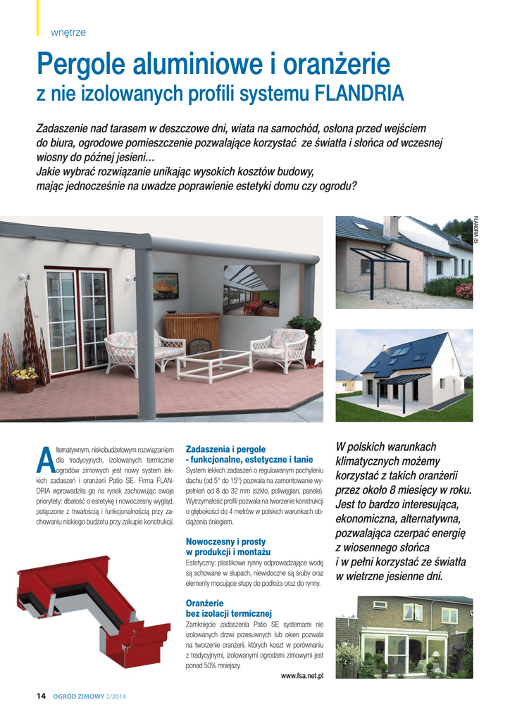 wnętrze Pergole aluminiowe i oranżerie z nie izolowanych profili systemu FLANDRIA Zadaszenie nad tarasem w deszczowe dni, wiata na samochód, osłona przed wejściem do biura, ogrodowe pomieszczenie pozwalające korzystać ze światła i słońca od wczesnej wiosny do późnej jesieni… Jakie wybrać rozwiązanie unikając wysokich kosztów budowy, mając jednocześnie na uwadze poprawienie estetyki domu czy ogrodu? FLANDRIA (5) A lternatywnym, niskobudżetowym rozwiązaniem dla tradycyjnych, izolowanych termicznie ogrodów zimowych jest nowy system lekkich zadaszeń i oranżerii Patio SE. Firma FLANDRIA wprowadziła go na rynek zachowując swoje priorytety: dbałość o estetykę i nowoczesny wygląd, połączone z trwałością i funkcjonalnością przy zachowaniu niskiego budżetu przy zakupie konstrukcji. Zadaszenia i pergole - funkcjonalne, estetyczne i tanie System lekkich zadaszeń o regulowanym pochyleniu dachu (od 5° do 15°) pozwala na zamontowanie wypełnień od 8 do 32 mm (szkło, poliwęglan, panele). Wytrzymałość profili pozwala na tworzenie konstrukcji o głębokości do 4 metrów w polskich warunkach obciążenia śniegiem. Nowoczesny i prosty w produkcji i montażu Estetyczny: plastikowe rynny odprowadzające wodę są schowane w słupach, niewidoczne są śruby oraz elementy mocujące słupy do podłoża oraz do rynny. Oranżerie bez izolacji termicznej Zamknięcie zadaszenia Patio SE systemami nie izolowanych drzwi przesuwnych lub okien pozwala na tworzenie oranżerii, których koszt w porównaniu z tradycyjnymi, izolowanymi ogrodami zimowymi jest ponad 50% mniejszy. www.fsa.net.pl 14 OGRÓD ZIMOWY 2/2014 W polskich warunkach klimatycznych możemy korzystać z takich oranżerii przez około 8 miesięcy w roku. Jest to bardzo interesująca, ekonomiczna, alternatywna, pozwalająca czerpać energię z wiosennego słońca i w pełni korzystać ze światła w wietrzne jesienne dni.
