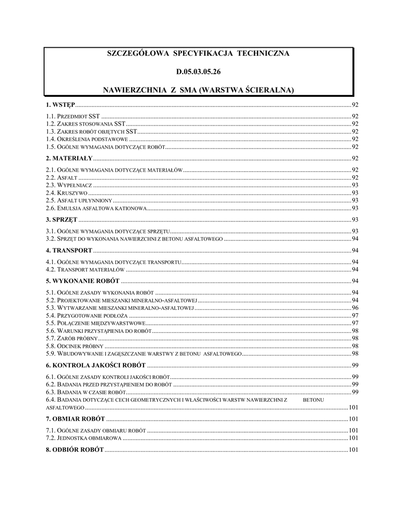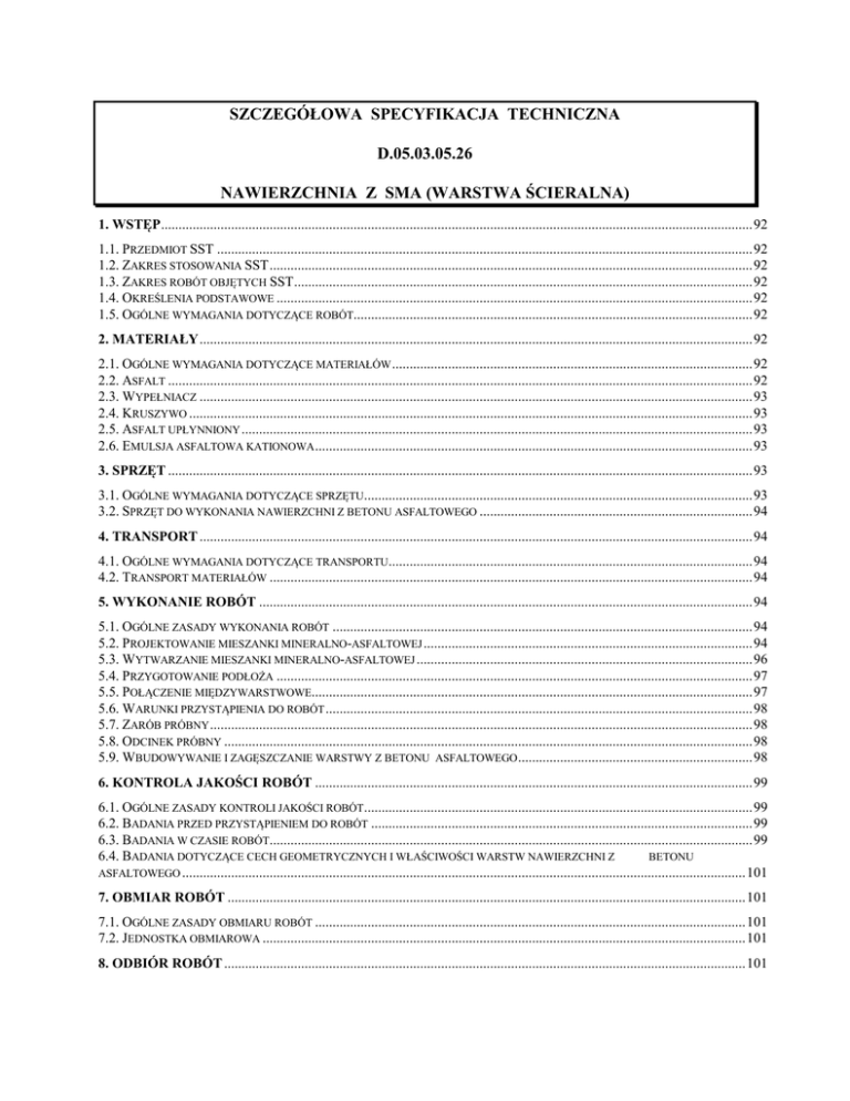 SZCZEGÓŁOWA SPECYFIKACJA TECHNICZNA D.05.03.05.26 NAWIERZCHNIA Z SMA (WARSTWA ŚCIERALNA) 1. WSTĘP......................................................................................................................................................................... 92 1.1. PRZEDMIOT SST ......................................................................................................................................................... 92 1.2. ZAKRES STOSOWANIA SST .......................................................................................................................................... 92 1.3. ZAKRES ROBÓT OBJĘTYCH SST ................................................................................................................................... 92 1.4. OKREŚLENIA PODSTAWOWE ........................................................................................................................................ 92 1.5. OGÓLNE WYMAGANIA DOTYCZĄCE ROBÓT.................................................................................................................. 92 2. MATERIAŁY .............................................................................................................................................................. 92 2.1. OGÓLNE WYMAGANIA DOTYCZĄCE MATERIAŁÓW ....................................................................................................... 92 2.2. ASFALT ....................................................................................................................................................................... 92 2.3. WYPEŁNIACZ .............................................................................................................................................................. 93 2.4. KRUSZYWO ................................................................................................................................................................. 93 2.5. ASFALT UPŁYNNIONY .................................................................................................................................................. 93 2.6. EMULSJA ASFALTOWA KATIONOWA ............................................................................................................................. 93 3. SPRZĘT ....................................................................................................................................................................... 93 3.1. OGÓLNE WYMAGANIA DOTYCZĄCE SPRZĘTU............................................................................................................... 93 3.2. SPRZĘT DO WYKONANIA NAWIERZCHNI Z BETONU ASFALTOWEGO .............................................................................. 94 4. TRANSPORT .............................................................................................................................................................. 94 4.1. OGÓLNE WYMAGANIA DOTYCZĄCE TRANSPORTU........................................................................................................ 94 4.2. TRANSPORT MATERIAŁÓW .......................................................................................................................................... 94 5. WYKONANIE ROBÓT ............................................................................................................................................. 94 5.1. OGÓLNE ZASADY WYKONANIA ROBÓT ........................................................................................................................ 94 5.2. PROJEKTOWANIE MIESZANKI MINERALNO-ASFALTOWEJ .............................................................................................. 94 5.3. WYTWARZANIE MIESZANKI MINERALNO-ASFALTOWEJ ................................................................................................ 96 5.4. PRZYGOTOWANIE PODŁOŻA ........................................................................................................................................ 97 5.5. POŁĄCZENIE MIĘDZYWARSTWOWE.............................................................................................................................. 97 5.6. WARUNKI PRZYSTĄPIENIA DO ROBÓT .......................................................................................................................... 98 5.7. ZARÓB PRÓBNY ........................................................................................................................................................... 98 5.8. ODCINEK PRÓBNY ....................................................................................................................................................... 98 5.9. WBUDOWYWANIE I ZAGĘSZCZANIE WARSTWY Z BETONU ASFALTOWEGO ................................................................... 98 6. KONTROLA JAKOŚCI ROBÓT ............................................................................................................................. 99 6.1. OGÓLNE ZASADY KONTROLI JAKOŚCI ROBÓT............................................................................................................... 99 6.2. BADANIA PRZED PRZYSTĄPIENIEM DO ROBÓT ............................................................................................................. 99 6.3. BADANIA W CZASIE ROBÓT.......................................................................................................................................... 99 6.4. BADANIA DOTYCZĄCE CECH GEOMETRYCZNYCH I WŁAŚCIWOŚCI WARSTW NAWIERZCHNI Z BETONU ASFALTOWEGO ................................................................................................................................................................. 101 7. OBMIAR ROBÓT .................................................................................................................................................... 101 7.1. OGÓLNE Z