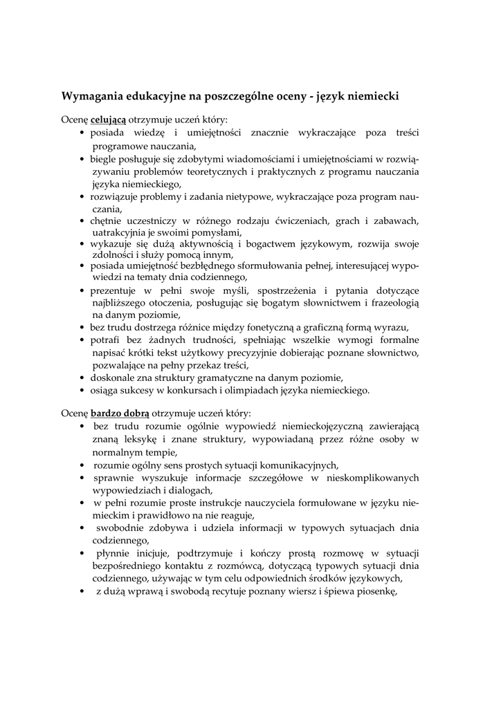 Wymagania edukacyjne na poszczególne oceny - język niemiecki Ocenę celującą otrzymuje uczeń który: • posiada wiedzę i umiejętności znacznie wykraczające poza treści programowe nauczania, • biegle posługuje się zdobytymi wiadomościami i umiejętnościami w rozwiązywaniu problemów teoretycznych i praktycznych z programu nauczania języka niemieckiego, • rozwiązuje problemy i zadania nietypowe, wykraczające poza program nauczania, • chętnie uczestniczy w różnego rodzaju ćwiczeniach, grach i zabawach, uatrakcyjnia je swoimi pomysłami, • wykazuje się dużą aktywnością i bogactwem językowym, rozwija swoje zdolności i służy pomocą innym, • posiada umiejętność bezbłędnego sformułowania pełnej, interesującej wypowiedzi na tematy dnia codziennego, • prezentuje w pełni swoje myśli, spostrzeżenia i pytania dotyczące najbliższego otoczenia, posługując się bogatym słownictwem i frazeologią na danym poziomie, • bez trudu dostrzega różnice między fonetyczną a graficzną formą wyrazu, • potrafi bez żadnych trudności, spełniając wszelkie wymogi formalne napisać krótki tekst użytkowy precyzyjnie dobierając poznane słownictwo, pozwalające na pełny przekaz treści, • doskonale zna struktury gramatyczne na danym poziomie, • osiąga sukcesy w konkursach i olimpiadach języka niemieckiego. Ocenę bardzo dobrą otrzymuje uczeń który: • bez trudu rozumie ogólnie wypowiedź niemieckojęzyczną zawierającą znaną leksykę i znane struktury, wypowiadaną przez różne osoby w normalnym tempie, • rozumie ogólny sens prostych sytuacji komunikacyjnych, • sprawnie wyszukuje informacje szczegółowe w nieskomplikowanych wypowiedziach i dialogach, • w pełni rozumie proste instrukcje nauczyciela formułowane w języku niemieckim i prawidłowo na nie reaguje, • swobodnie zdobywa i udziela informacji w typowych sytuacjach dnia codziennego, • płynnie inicjuje, podtrzymuje i kończy prostą rozmowę w sytuacji bezpośredniego kontaktu z rozmówcą, dotyczącą typowych sytuacji dnia codziennego, używając w tym celu odpowiednich środków językowych, • z dużą wprawą i swobodą recytuje poznany wiersz i śpiewa piosenkę, • jego wypowiedzi pod względem fonetycznym są całkowicie poprawne, bez błędów w wymowie i intonacji, • bezbłędnie stosuje poznane struktury gramatyczne, • sprawnie znajduje potrzebne informacje szczegółowe w tekście użytkowym, • swobodnie rozuntie ogólny sens prostych, adaptowanych tekstów oraz krótkich tekstów użytkowych, • bezbłędnie zapisuje większość poznanych słów i wyrażeń, • bez trudu pisze proste wypowiedzi pisemne, umiejętnie wykorzystując poznane środki językowe, a jego wypowiedź jest logiczna, harmonijna i spójna, zaś bardzo sporadyczne błędy w pisowni, błędy gramatyczne i leksykalne nie zakłócają komunikacji, • potrafi, spełniając wszelkie wymogi formalne, napisać krótki tekst użytkowy precyzyjnie dobierając poznane słownictwo, pozwalające na pełny przekaz treści. Ocenę dobrą otrzymuje uczeń który: • rozumie ogólnie większość wypowiedzi niemieckojęzycznych zawierających znaną leksykę i znane struktury, wypowiadanych przez różne osoby w normalnym tempie, • rozumie ogólny sens większości prostych sytuacji komunikacyjnych, • wyszukuje większość informacji szczegółowych w nieskomplikowanych wypowiedziach i dialogach, • rozumie większość prostych instrukcji nauczyciela formułowanych w języku niemieckim i prawidłowo na nie reaguje, • potrafi samodzielnie, bez pomocy nauczyciela, zdobywać i udzielać informacji w typowych sytuacjach dnia codziennego (zachodzi komunikacja pomimo drobnych usterek), • wyraża w prostych słowach myśli, spostrzeżenia i pytania dotyczące najbliższego otoczenia, przy czy wypowiedź jest zgodna z tematem i zawiera większość wymaganych informacji, • wykazując się dobrym poziomem znajomości słownictwa i struktur językowych, potrafi inicjować i podtrzymywać prostą rozmowę dotyczącą typowych sytuacji dnia codziennego, • z drobnymi pomyłkami, które jest w stanie samodzielnie poprawić, recytuje poznany wiersz i śpiewa piosenkę, • jego wypowiedzi są zasadniczo poprawne fonetycznie i intonacyjnie, zawierają nieliczne usterki, • poprawnie stosuje poznane struktury gramatyczne, • znajduje większość potrzebnych informacji szczegółowych w tekście użytkowym, • w zasadzie rozumie ogólny sens większości prostych, adaptowanych tekstów oraz krótkich tekstów użytkowych, • • poprawnie zapisuje większość poznanych słów i wyrażeń, pisze proste wypowiedzi pisemne wykorzystując większość poznanych środków językowych, a jego wypowiedź jest logiczna i spójna, zaś nieliczne błędy ortograficzne i leksykalne jedynie w nieznacznym stopniu zakłócają zrozumienie, • potrafi napisać prosty, w zasadzie zgodny z wymaganą formą tekst z jedynie niewielkimi uchybieniami w doborze poznanego słownictwa i struktur gramatycznych pozwalającymi na niemal pełny przekaz treści. Ocenę dostateczną otrzymuje uczeń który: • rozumie ogólnie dużą część wypowiedzi niemieckojęzycznych zawierających znaną leksykę i znane struktury, wypowiadanych przez różne osoby w normalnym tempie, • rozumie ogólny sens dużej części prostych sytuacji komunikacyjnych, —• wyszukuje dużą część informacji szczegółowych w nieskomplikowanych wypowiedziach i dialogach, • rozumie dużą część prostych instrukcji nauczyciela formułowanych w języku niemieckim i prawidłowo na nie reaguje, • przy pomocy nauczyciela zadaje proste pytania i udziela na nie odpowiedzi, • pomimo trudności w formułowaniu lub rozumieniu pytań i odpowiedzi udaje mu się przekazać najważniejsze informacje, w związku z czym dochodzi do komunikacji w podstawowym zakresie, • nawiązuje krótką rozmowę, nie zawsze jednak potrafi sam