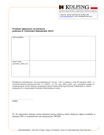 Aleja św. Jakuba Apostoła 25, 84-360 Łeba www.kolping.org.pl; e-mail: [email protected] Produkt zgłoszony na konkurs podczas 6. Festiwalu Rękodzieła 2015 Opis produktu Autor: Imię nazwisko, adres, tel. Niniejszym oświadczam, że na podstawie art. 23 ust. 1 pkt 1) ustawy z dnia 29 sierpnia 1997 r. o ochronie danych osobowych (Dz. U. z 2002 r., nr 101, poz. 926 z późn. zm.), wyrażam zgodę na przetwarzanie moich danych osobowych przez Dzieło Kolpinga Diecezji Pelplińskiej w celach związanych z organizacją Festiwalu Rękodziełą w Łebie. ...................................................... podpis Ps. Do zgłoszenia, którego można dokonać pocztą mailową należy dołączyć zdjęcie produktu w formacie JPG w rozdzielczości nie mniejszej niż 300 DPI KRS:0000396951 * NIP: 8411710405 * Regon: 221534816 * Konto: 61 9324 0008 0000 1906 2000 0010