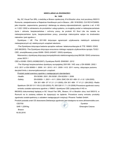 NDECLARACJA ZGODNOŚCI Nr. 1420 My, SC Visual Fan SRL z siedzibą w Brasov społecznej, 61st Brazilor ulica, kod pocztowy 500313 Rumunia, zarejestrowana w Rejestrze Handlowym pod nr Brasov. J08 / 818/2002, CUI RO14724950, jako importer, zapewnienia, gwarancji i deklarują na własną odpowiedzialność, zgodnie z art. 4 HG nr.1.022 / 2002 w odniesieniu do produktów i usług systemu, co mogłoby podać w niebezpieczeństwie życia i zdrowia, bezpieczeństwa i ochrony pracy, że produkt X3 Soul Lite nie naraża na niebezpieczeństwo życie, bezpieczeństwo pracy, powoduje niekorzystne wpływ na środowisko naturalne i jest zgodne z: Dyrektywa / UE -The 2011/65 dotyczące ograniczeń użytkowania niektórych substancji niebezpiecznych w] i elektrycznych urządzeń electonic. -The Dyrektywa dotycząca badania sprzętów radiowe i telekomunikacyjne & TTE 1999/5 / EWG (HG 88/2003) -The Dyrektywa dotycząca ensurance niskiego napięcia użytkowników sprzętu 73/32 / CEE, zmodyfikowany przez 93/68 / EWG (HG457 / 2003) dyrektywy. Mianowicie z dyrektywą dotyczącą kompatybilności elektromagnetycznej 89/336 / EWG zmieniona przez 92/31 / CEE si 93/68 / EWG (HG982/2007); Dyrektywa RoHS: EN50581: 2012 -The Wymogi bezpieczeństwa dyrektywy europejskiej 2001/95 / WE oraz z EN 60065: 2002 / A12: 2011 si EN 60950-1: 2006 / A1: 2010 / A11: 2009 / A12: 2011 normy, dotyczące poziomu decybeli limitu z skomercjalizowanych urządzeń. Produkt został oceniony zgodnie z następującymi standardami: -Health: EN 50360: 2001, EN 50361; EN 62209-1: 2006 -Safety: EN 60950- 1: 2001 + A11: 2004; EMC EN 301 489- 01 v1.6.1 (09-2005) EN 301 489- 07 V1.3.1 (11-2005); EN 301 489- 17 V1.2.1 (08-2002) -Radio Spektrum: EN 301 511 V9.0.2 (03-2003); PL 300 328 V1.7.1 (10-2006) Procedura zgodności oceny wniosku została wykonana zgodnie z 1999/5 / dyrektywa CEE (załącznika II HG nr. 88/2003) dokumentacji będącej w SC Visual Fan SRL, Brasov, 61-ci Brazilor ulica, kod 500313, w Rumunii na to zostaną oddane do dyspozycji na żądanie. Procedura oceny wniosku produkty zgodności został spełniony z udziałem następujących instytucji: Phoenix Testlab GmbH. Produkt posiada znak CE stosowane.Deklaracja zgodności jest dostępna na www.allviewmobile.com. CE0700 SAR 1.22W/kg Brasov 16.05.2016 Dyrektor Gheorghe Cotuna