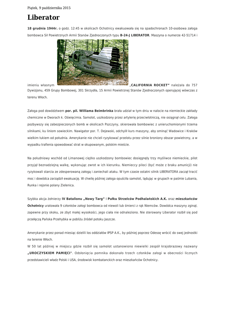 Piątek, 9 października 2015 Liberator 18 grudnia 1944r. o godz. 12:45 w okolicach Ochotnicy ewakuowała się na spadochronach 10-osobowa załoga bombowca Sił Powietrznych Armii Stanów Zjednoczonych typu B-24-J LIBERATOR. Maszyna o numerze 42-51714 i imieniu własnym „CALIFORNIA ROCKET” należała do 757 Dywizjonu, 459 Grupy Bombowej, 301 Skrzydła, 15 Armii Powietrznej Stanów Zjednoczonych operującej wówczas z terenu Włoch. Załoga pod dowództwem por. pil. Williama Beimbrinka brała udział w tym dniu w nalocie na niemieckie zakłady chemiczne w Dworach k. Oświęcimia. Samolot, uszkodzony przez artylerię przeciwlotniczą, nie osiągnął celu. Załoga pozbywszy się zabezpieczonych bomb w okolicach Pszczyny, skierowała bombowiec z unieruchomionymi trzema silnikami, ku liniom sowieckim. Nawigator por. T. Dejewski, odchylił kurs maszyny, aby ominąć Wadowice i Kraków wielkim łukiem od południa. Amerykanie nie chcieli ryzykować przelotu przez silnie broniony obszar powietrzny, a w wypadku trafienia spowodować strat w okupowanym, polskim mieście. Na południowy wschód od Limanowej ciężko uszkodzony bombowiec dosięgnęły trzy myśliwce niemieckie, pilot przyjął beznadziejną walkę, wykonując zwrot w ich kierunku. Niemieccy piloci (być może z braku amunicji) nie ryzykowali starcia ze zdesperowaną załogą i zaniechali ataku. W tym czasie ostatni silnik LIBERATORA zaczął tracić moc i dowódca zarządził ewakuację. W chwilę później załoga opuściła samolot, lądując w grupach w paśmie Lubania, Runka i rejonie polany Zielenica. Szybka akcja żołnierzy IV Batalionu „Nowy Targ” I Pułku Strzelców Podhalańskich A.K. oraz mieszkańców Ochotnicy uratowała 9 członków załogi bombowca od niewoli lub śmierci z rąk Niemców. Dowódca maszyny zginął, zapewne przy skoku, ze zbyt małej wysokości, jego ciała nie odnaleziono. Nie sterowany Liberator rozbił się pod przełęczą Pańska Przehybka w pobliżu źródeł potoku Jaszcze. Amerykanie przez ponad miesiąc dzielili los oddziałów IPSP A.K., by później poprzez Odessę wrócić do swej jednostki na terenie Włoch. W 50 lat później w miejscu gdzie rozbił się samolot ustanowiono niewielki zespół krajobrazowy nazwany „UROCZYSKIEM PAMIĘCI". Odsłonięcia pomnika dokonało trzech członków załogi w obecności licznych przedstawicieli władz Polski i USA, środowisk kombatanckich oraz mieszkańców Ochotnicy.