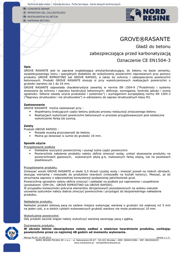 Technical data sheet - Scheda tecnica - Fiche tecnique - Karta danych technicznych CONCRETE REPAIR RIPRISTINO DEL CALCESTRUZZO RESTAURATION DU BÉTON NAPRAWA BETONU GROVE®RASANTE Gładź do betonu zabezpieczająca przed karbonatyzacją Oznaczenie CE EN1504-3 Opis GROVE RASANTE jest to zaprawa wygładzająca antykarbonatyzująca, do betonu na bazie cementu, wyselekcjowanego żwiru i specjalnych dodatków do wykończenia powierzchni naprawianych przy pomocy produktu GROVE RIPRISTINO lub GROVE RAPIDO, a także do ochrony i zabezpieczenia powierzchni betonowych. Produkt GROVE RASANTE stosuje si przy wykończeniowych realizacjach powierzchni o grubości warstwy od 1 do 10 mm. GROVE RASANTE odpowiada charakterystyce zawartej w normie EN 1504-9 (“Przedmioty i systemy stosowane do ochrony i naprawy konstrukcji betonowych: definicje, wymagania, kontrola jakości i ocena zgodności. Główne zasady użycia produktów i systemów”) i wymaganiom europejskiej normy EN 1504-3 (“Naprawy strukturalne i nie strukturalne”) w odniesieniu do zapraw strukturalnych klasy R3. Zastosowanie GROVE RASANTE można zastosować przy : • Wypełnianiu brakujących części betonu podczas procesu restauracji zniszczonego betonu • Realizacjach wykończeń powierzchni betonowych w procesie przygotowawczym pod ostateczne wykończenie farbą lub żywicą. Zalety Produkt GROVE RAPIDO : • Posiada wysoką przyczepność do betonu • Można go stosować w sumie do grubości 10 mm. Sposób użycia Przygotowanie podłoża • Dokładnie wyczyścić powierzchnię i usunąć luźne części powierzchni. • Powierzchnie nałożenia produktu należy obficie zmoczyć wodą; unikać stosowania produktu na powierzchniach gipsowych, wykonanych płytą g-k, malowanych farbą olejną, lub na powłokach plastikowych. Przygotowanie produktu Zmieszać worek GROVE RASANTE w około 5,5 litrach czystej wody i mieszać powoli na niskich obrotach, stosując wiertarkę i mieszadło do produktów twardych (mieszadło na kształt kotwicy). Mieszać, aż do otrzymania zaprawy o odpowiedniej konsystencji pozbawionej jakichkolwiek grud. Powierzchnię uprzednio należy obficie zmoczyć i nakładać na podłoże już naprawione i uzupełnione (produktami CEM-OX, GROVE RIPRISTINO lub GROVE RAPIDO). W przypadku konieczności pokrycia elementów zbrojeniowych pozostawionych na widoku wskutek usuwania szalunków należy dobrze zmoczyć powierzchnie i przystąpić do bezpośredniego nakładania produktu. Nakładanie produktu Nakładać produkt stalową pacą na zadane miejsce wykonując warstwę o grubości nie większej niż 5 mm na jeden cykl, a w dwóch cyklach wykonawczych grubość warstwy nie może przekroczyć 10 mm. Wykończenie powierzchni Gdy produkt zacznie wiązać należy wykończyć warstwę zacierając pacą z gąbką. Dojrzewanie produktu W okresie letnim obowiązkowo należy zadbać o właściwe twardnienie produktu, zwilżając powierzchnie przez co najmniej 48 godzin od momentu wykonania. Wersja PL/01-14.09.2012 strona 1 z 3 NORD RESINE POLSKA SP. z o.o. - ul. Rakowiecka 65-67 - 50-422 Wrocław - KRS: 0000431984 - NIP: 8943040425 www.nordresine.pl - [email protected] Technical data sheet - Scheda tecnica - Fiche tecnique - Karta danych technicznych CONCRETE REPAIR RIPRISTINO DEL CALCESTRUZZO RESTAURATION DU BÉTON NAPRAWA BETONU GROVE®RASANTE Gładź do betonu zabezpieczająca przed karbonatyzacją Oznaczenie CE EN1504-3 Zużycie Chcąc uzyskać warstwę o grubości 1 mm należy zastosować około 1,7 kg produktu na 1 m². Czyszczenie narzędzi • Świeży produkt czyścić za pomocą czystej wody; • Zaschnięty produkt czyścić jedynie mechanicznie. Ostrzeżenia i specjalne zalecenia • Stosować w temperaturze od +5 do +35 °C. • Unikać aplikowania produktu w pełnym słońcu. • Nie wykonywać powierzchni powyżej 1 cm grubości. • W okresach zimowych należy unikać stosowania produktu na powierzchnie zamrożone lub na powierzchnie które mogą być narażone na zamrożenie w przeciągu najbliższych 24 godzin. Kolor Produkt dostępny jest w kolorze białym i szarym. Specyfikacja techniczna DANE IDENTYFIKACYJNE PRODUKTU Klasa przynależności według EN 1504-3 Typologia Kolor Konsystencja Maksymalna granulometria (ziarnistość), EN 12192-1 zawartości chlorków rozpuszczalnych w wodzie- wymagane minimum ≤ 0,05%-EN 1015-17 DANE APLIKACYJNE (w 23 °C – 50 % wilgotności względnej) Wodny dodatek Gęstość dojrzałej zaprawy Pot-life, PN EN ISO 9514 Temperatura stosowania Możliwa grubość jednej warstwy Maksymalna możliwa grubość (w dwóch warstwach) WŁAŚCIWOŚCI GOTOWEJ POWŁOKI Odporność na ściskanie, EN 12190 po 7 dniach Odporność na ściskanie, EN 12190 po 28 dniach Odporność na zginanie, EN 196-1(*) po 28 dniach Moduł sprężystości przy ściskaniu, EN 13412 po 28 dniach Przyczepność do betonu (podłoże typu MC 0,40 – zgodnie po 28 dniach z EN1766); EN 1542 Odporność na karbonatyzację, EN 13295 Wchłanianie kapilarne, EN 13057 ------mm R2 CC Biały, szary sypka 0,315 % ≤0,05 % kg/cm min C° mm mm 21-23 3 1.600 120 Od +5 do +35 Od 1 do 5 10 MPa MPa MPa MPa ≥20 ≥25 6 9.700 MPa >2 --Kg/m2.h0.5 Przekroczona powierzchnia <0,5 Wersja PL/01-14.09.2012 strona 2 z 3 NORD RESINE POLSKA SP. z o.o. - ul. Rakowiecka 65-67 - 50-422 Wrocław - KRS: 0000431984 - NIP: 8943040425 www.nordresine.pl - [email protected] Technical data sheet - Scheda tecnica - Fiche tecnique - Karta danych technicznych CONCRETE REPAIR RIPRISTINO DEL CALCESTRUZZO RESTAURATION DU BÉTON NAPRAWA BETONU GROVE®RASANTE Gładź do betonu zabezpieczająca przed karbonatyzacją Oznaczenie CE EN1504-3 Kompatybilność termiczna mierzona jako przyczepność (EN 1542) MPa po 50 cyklach zamrażania- rozmrażania przy zanurzeniu w soli odladzającej, EN 13687/1 Cr(VI) rozpuszczalny w wodzie, EN 196-10 Mg/l Łatwopalność Euroklasa Nota: metodologia badań zgodna z oznaczonymi normami obok podanymi * próba niewymagana ze 