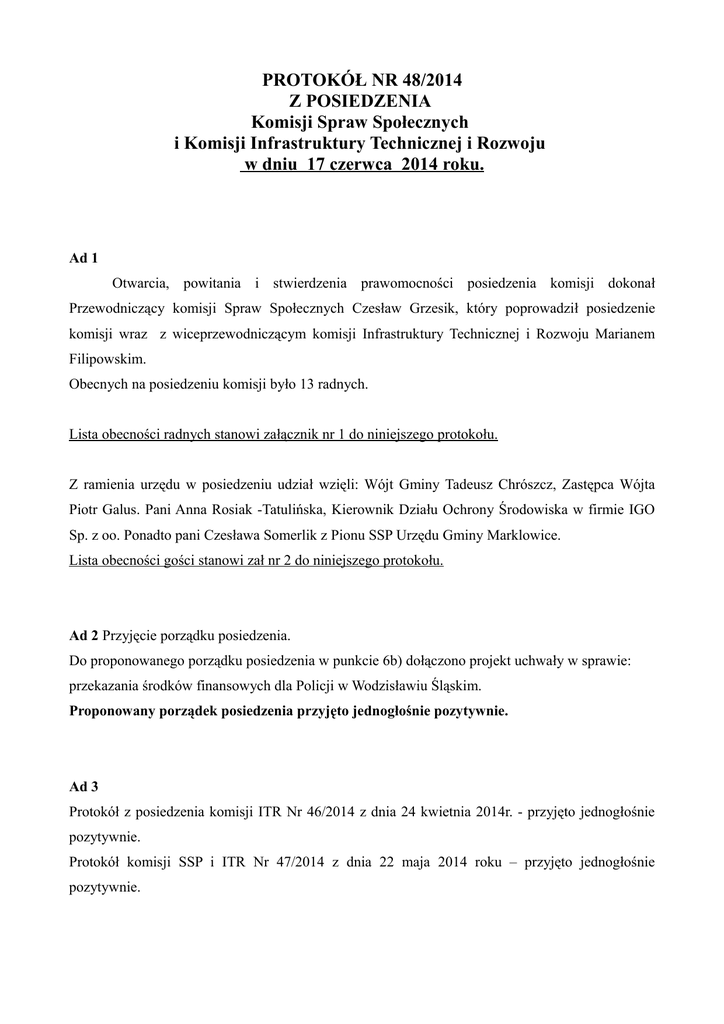 PROTOKÓŁ NR 48/2014 Z POSIEDZENIA Komisji Spraw Społecznych i Komisji Infrastruktury Technicznej i Rozwoju w dniu 17 czerwca 2014 roku. Ad 1 Otwarcia, powitania i stwierdzenia prawomocności posiedzenia komisji dokonał Przewodniczący komisji Spraw Społecznych Czesław Grzesik, który poprowadził posiedzenie komisji wraz z wiceprzewodniczącym komisji Infrastruktury Technicznej i Rozwoju Marianem Filipowskim. Obecnych na posiedzeniu komisji było 13 radnych. Lista obecności radnych stanowi załącznik nr 1 do niniejszego protokołu. Z ramienia urzędu w posiedzeniu udział wzięli: Wójt Gminy Tadeusz Chrószcz, Zastępca Wójta Piotr Galus. Pani Anna Rosiak -Tatulińska, Kierownik Działu Ochrony Środowiska w firmie IGO Sp. z oo. Ponadto pani Czesława Somerlik z Pionu SSP Urzędu Gminy Marklowice. Lista obecności gości stanowi zał nr 2 do niniejszego protokołu. Ad 2 Przyjęcie porządku posiedzenia. Do proponowanego porządku posiedzenia w punkcie 6b) dołączono projekt uchwały w sprawie: przekazania środków finansowych dla Policji w Wodzisławiu Śląskim. Proponowany porządek posiedzenia przyjęto jednogłośnie pozytywnie. Ad 3 Protokół z posiedzenia komisji ITR Nr 46/2014 z dnia 24 kwietnia 2014r. - przyjęto jednogłośnie pozytywnie. Protokół komisji SSP i ITR Nr 47/2014 z dnia 22 maja 2014 roku – przyjęto jednogłośnie pozytywnie. Ad 4 Akcja lato 2014. Tematykę przedstawiła inspektor Cz. Somerlik z Pionu SSO, która wskazała, że już od 29 czerwca rozpoczynają się tygodniowe kolonie w Szczyrku dla 45 dzieci. W wyborze dzieci uwzględniono kryterium dochodowe w rodzinie, trudną sytuację materialną, patologie, niebieska kartę wystawioną dla rodziny, czy problemy wychowawcze. Planowany jest także obóz harcerski od 14 lipca b.r. Proponowane są również półkolonie dla wszystkich zgłoszonych dzieci. Zaplanowane są 4 turnusy od 1 lipca b.r. Zajęte są już wszystkie miejsca. Schemat będzie następujący: wtorek: Żory + 2 godz. na basenie Aquarion. środa Gorzyce basen + zwiedzanie Powiatu Wodzisławskiego , czwartek Aquapark + zwiedzanie zamku w Raciborzu. Jeżeli wygospodarowane będą środki, to być może będzie jeszcze piąty turnus. Wychowawcy są czynnymi nauczycielami. Dzieci są ubezpieczone. Każde dziecko otrzyma czapeczkę od nas – takie są wymogi Kuratorium. W zeszłym roku wypoczynkiem zostało objętych 350 dzieci z Marklowic. W 2014 roku będzie trochę mniej dzieci, chyba że odbędzie się także piąty tydzień półkolonii. Ad 5. Profilaktyka zdrowotna mężczyzn – ref. insp. Cz. Somerlik. Pani Cz. Somerlik poinformowała, ze program powinien być napisany z uwzględnieniem skali wiekowej. Pani doktor Sikorowa proponowała wiek 65 – 100 i więcej. W Marklowicach jest 370 mężczyzn w wieku: 50-59 lat i 351 w wieku 60-65 lat. W tej chwili nie ma na terenie kraju żadnego programu dot. profilaktyki mężczyzn. Potrzebny byłby także program dla dzieci dot. meningokoki oraz program walki z otyłością. Radni proponowali, aby program rozszerzyć na więcej grup wiekowych i także na dzieci, ponieważ warto stosować profilaktykę zdrowotną zamiast leczyć. Wnioskowano o: Przygotowanie przez Pion SSP zarysu działań profilaktycznych dla mężczyzn na terenie gminy Marklowice. Powyższy wniosek przyjęto jednogłośnie pozytywnie. Ad 6. Zaopiniowanie projektów uchwał w sprawie: a) przyjęcia Programu Ochrony Środowiska dla Gminy Marklowice na lata 2014-2017 z uwzględnieniem perspektywy na lata 2018-2021 - ref. p. Anna Rosiak-Tatulińska, IGO Sp. z O.O. Zastępca wójta Piotr Galus wskazał, że program był poddany konsultacjom społecznym, został udostępniony radnym w wersji elektronicznej. W wersji papierowej jest dostępny w Biurze Rady. Pani mgr. inż. Anna Rosiak-Tatulińska poinformowała, że opracowanie jako aktualizacja została wykonana zgodnie z art. 17 ustawy z dnia 27 kwietnia 2001 r. Prawo ochrony środowiska (Dz. Ustaw z 2013 r. t.j. z późn. zmianami). Za dwa lata trzeba będzie wykonać raport z wykonania programu. Program zawiera ocenę stanu środowiska Gminy Marklowice z uwzględnieniem danych oraz wskaźników ilościowych charakteryzujących poszczególne komponenty środowiska. Wyznaczono w opracowaniu priorytety i cele oraz kierunki działań, dokonano ich klasyfikacji i hierarchizacji najważniejszych problemów środowiskowych. Program obejmuje : Ochronę powietrza – tutaj będą wprowadzane własne programy gminne i programy koordynowane z województwem śląskim i powiatem wodzisławskim. Ochrona wód – obejmować będzie zasoby wód podziemnych i powierzchniowych. Promowana będzie edukacja ekologiczna wśród mieszkańców w wyznaczonych latach. W tym zakresie organizowane mają być akcje typu: sprzątanie ziemi, sadzenie drzew itp.. Szkoły marklowickie mają ładnie opracowane programy działania w tym zakresie. Dobrze prowadzona jest edukacja najmłodszych dzieci w tym zakresie, w marklowickim przedszkolu. Według proponowanego programu Ochrony Środowiska - Prowadzona będzie właściwa gospodarka odpadami komunalnymi, w celu: - selektywnej zbiórki odpadów i odzyskania energii. Dużo zadań w tym zakresie spada na samorządy terytorialne – w tym na urzędy gminy. W ramach Programu Ochrony Środowiska - przewidziane będą także działania w zakresie: Ochrona dziedzictwa przyrodniczego: − w tym uwzględniono działania dot. zachowanie cennych obszarów przyrodniczych, pielęgnacji drzew, lasów i pomników przyrody. W zakresie ochrony lasów – preferowane jest zachowanie różnorodności przyrodniczej w charakterystycznych w poszczególnych regionach. Likwidacja dzikich wysypisk śmieci w lasach. Wycinka drzew – tylko w przypadkach uzasadnionych. Dążenie do pełnego wykorzystania zasobów glebowych. Tereny poprzemysłowe – zagospodarowywane zgodnie z zasadami zrównoważonego rozwoju. Kolejnym zadaniem będzie: Ochrona przed powodzią, w tym modernizacja 