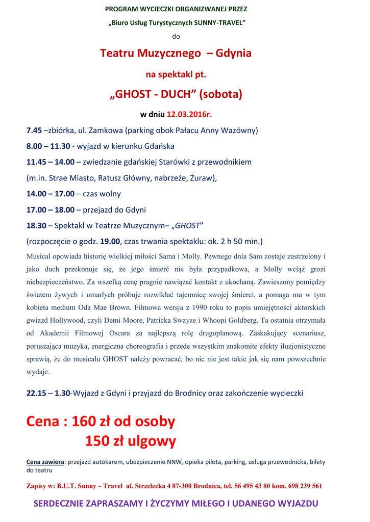 PROGRAM WYCIECZKI ORGANIZWANEJ PRZEZ „Biuro Usług Turystycznych SUNNY-TRAVEL” do Teatru Muzycznego – Gdynia na spektakl pt. „GHOST - DUCH” (sobota) w dniu 12.03.2016r. 7.45 –zbiórka, ul. Zamkowa (parking obok Pałacu Anny Wazówny) 8.00 – 11.30 - wyjazd w kierunku Gdańska 11.45 – 14.00 – zwiedzanie gdańskiej Starówki z przewodnikiem (m.in. Strae Miasto, Ratusz Główny, nabrzeże, Żuraw), 14.00 – 17.00 – czas wolny 17.00 – 18.00 – przejazd do Gdyni 18.30 – Spektakl w Teatrze Muzycznym– „GHOST” (rozpoczęcie o godz. 19.00, czas trwania spektaklu: ok. 2 h 50 min.) Musical opowiada historię wielkiej miłości Sama i Molly. Pewnego dnia Sam zostaje zastrzelony i jako duch przekonuje się, że jego śmierć nie była przypadkowa, a Molly wciąż grozi niebezpieczeństwo. Za wszelką cenę pragnie nawiązać kontakt z ukochaną. Zawieszony pomiędzy światem żywych i umarłych próbuje rozwikłać tajemnicę swojej śmierci, a pomaga mu w tym kobieta medium Oda Mae Brown. Filmowa wersja z 1990 roku to popis umiejętności aktorskich gwiazd Hollywood, czyli Demi Moore, Patricka Swayze i Whoopi Goldberg. Ta ostatnia otrzymała od Akademii Filmowej Oscara za najlepszą rolę drugoplanową. Zaskakujący scenariusz, poruszająca muzyka, energiczna choreografia i przede wszystkim znakomite efekty iluzjonistyczne sprawią, że do musicalu GHOST należy powracać, bo nic nie jest takie jak się nam powszechnie wydaje. 22.15 – 1.30-Wyjazd z Gdyni i przyjazd do Brodnicy oraz zakończenie wycieczki Cena : 160 zł od osoby 150 zł ulgowy Cena zawiera: przejazd autokarem, ubezpieczenie NNW, opieka pilota, parking, usługa przewodnicka, bilety do teatru Zapisy w: B.U.T. Sunny – Travel ul. Strzelecka 4 87-300 Brodnica, tel. 56 495 43 80 kom. 698 239 561 SERDECZNIE ZAPRASZAMY I ŻYCZYMY MIŁEGO I UDANEGO WYJAZDU