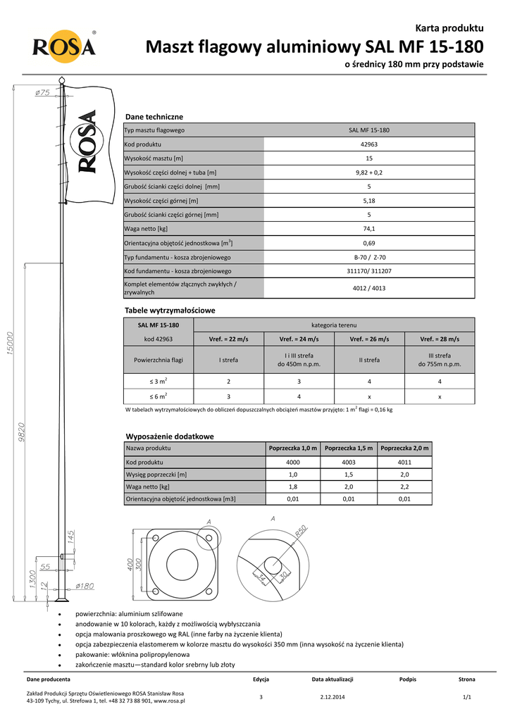 Karta produktu Maszt flagowy aluminiowy SAL MF 15-180 o średnicy 180 mm przy podstawie Dane techniczne Typ masztu flagowego SAL MF 15-180 Kod produktu 42963 Wysokośd masztu *m+ 15 Wysokośd części dolnej + tuba *m+ 9,82 + 0,2 Grubośd ścianki części dolnej *mm+ 5 Wysokośd części górnej *m+ 5,18 Grubośd ścianki części górnej *mm+ 5 Waga netto [kg] 74,1 Orientacyjna objętośd jednostkowa *m3] 0,69 Typ fundamentu - kosza zbrojeniowego B-70 / Z-70 Kod fundamentu - kosza zbrojeniowego 311170/ 311207 Komplet elementów złącznych zwykłych / zrywalnych 4012 / 4013 Tabele wytrzymałościowe kategoria terenu SAL MF 15-180 kod 42963 Vref. = 22 m/s Vref. = 24 m/s Vref. = 26 m/s Vref. = 28 m/s Powierzchnia flagi I strefa I i III strefa do 450m n.p.m. II strefa III strefa do 755m n.p.m. ≤ 3 m2 2 3 4 4 ≤ 6 m2 3 4 x x W tabelach wytrzymałościowych do obliczeo dopuszczalnych obciążeo masztów przyjęto: 1 m 2 flagi = 0,16 kg Wyposażenie dodatkowe Nazwa produktu Poprzeczka 1,0 m Poprzeczka 1,5 m Poprzeczka 2,0 m 4000 4003 4011 Wysięg poprzeczki *m+ 1,0 1,5 2,0 Waga netto [kg] 1,8 2,0 2,2 Orientacyjna objętośd jednostkowa *m3+ 0,01 0,01 0,01 Kod produktu powierzchnia: aluminium szlifowane anodowanie w 10 kolorach, każdy z możliwością wybłyszczania opcja malowania proszkowego wg RAL (inne farby na życzenie klienta) opcja zabezpieczenia elastomerem w kolorze masztu do wysokości 350 mm (inna wysokośd na życzenie klienta) pakowanie: włóknina polipropylenowa zakooczenie masztu—standard kolor srebrny lub złoty Dane producenta Zakład Produkcji Sprzętu Oświetleniowego ROSA Stanisław Rosa 43-109 Tychy, ul. Strefowa 1, tel. +48 32 73 88 901, www.rosa.pl Edycja Data aktualizacji 3 2.12.2014 Podpis Strona 1/1