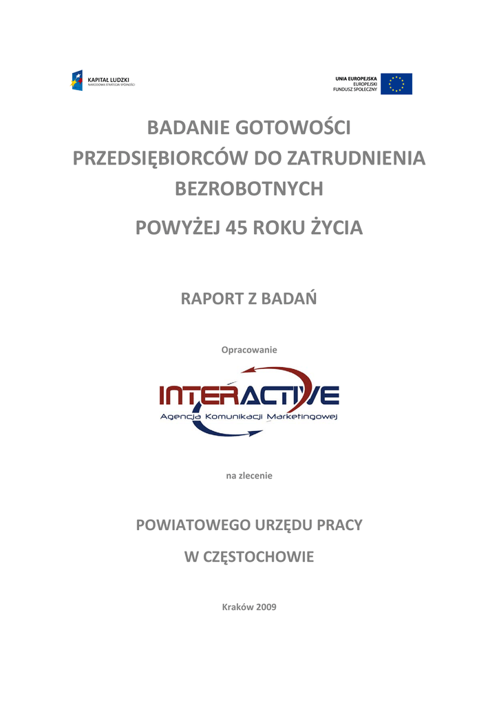 BADANIE GOTOWOŚCI PRZEDSIĘBIORCÓW DO ZATRUDNIENIA BEZROBOTNYCH POWYŻEJ 45 ROKU ŻYCIA RAPORT Z BADAŃ Opracowanie na zlecenie POWIATOWEGO URZĘDU PRACY W CZĘSTOCHOWIE Kraków 2009 Projekt współfinansowany przez Unię Europejską w ramach Europejskiego Funduszu Społecznego Spis treści Wstęp ...................................................................................................................................................... 3 Podsumowanie/Wnioski ......................................................................................................................... 5 I. CHARAKTERYSTYKA PRACODAWCÓW WYRAŻAJĄCYCH GOTOWOŚĆ DO ZATRUDNIENIA PRZESZKOLONYCH OSÓB BEZROBOTNYCH POWYŻEJ 45 ROKU ŻYCIA .................................................. 12 1.1. Charakterystyka społeczno-demograficzna respondentów biorących udział w badaniu .............. 12 1.2 Charakterystyka badanych podmiotów gospodarczych.................................................................. 16 1.3. Preferowane formy kontaktów z Powiatowym Urzędem Pracy .................................................... 38 II. ZAPOTRZEBOWANIE NA NOWYCH PRACOWNIKÓW ........................................................................ 41 2.1. Preferencje i oczekiwania pracodawców wobec kandydatów do zatrudnienia ............................ 45 2.2. Profile kandydatów do zatrudnienia wyróżnione ze względu na poziom oczekiwanych kwalifikacji ............................................................................................................................................................... 65 III. OCENA OFERTY ORAZ GOTOWOŚĆ DO WSPÓŁPRACY Z POWIATOWYM URZĘDEM PRACY............ 92 3.1. Korzystanie z oferty oraz gotowość do współpracy z PUP ............................................................. 92 3.2. Plany współpracy z Powiatowym Urzędem Pracy ........................................................................ 100 Spis wykresów ..................................................................................................................................... 107 Spis tabel ............................................................................................................................................. 109 2 | Badanie gotowości przedsiębiorców do zatrudnienia osób bezrobotnych powyżej 45 roku życia zrealizowane w ramach projektu „Aktywność –jakość – praca” Projekt współfinansowany przez Unię Europejską w ramach Europejskiego Funduszu Społecznego Wstęp Prezentowane w niniejszym raporcie badania zostały przeprowadzone wśród 205 prywatnych pracodawców z powiatu częstochowskiego i miasta Częstochowy na zlecenie Powiatowego Urzędu Pracy w Częstochowie w ramach projektu: „Aktywność – Jakość – Praca”, współfinansowanego przez Unię Europejską ze środków Europejskiego Funduszu Społecznego w ramach Programu Operacyjnego Kapitał Ludzki, Priorytet VI „Rynek pracy otwarty dla wszystkich”, Działanie 6.1. „Poprawa dostępu do zatrudnienia oraz wspierania aktywności zawodowej w regionie”, Poddziałania 6.1.2 „Wsparcie powiatowych i wojewódzkich urzędów pracy w realizacji zadań na rzecz aktywizacji zawodowej osób bezrobotnych w regionie”. Głównym celem badań była identyfikacja lokalnych pracodawców zainteresowanych zatrudnianiem osób bezrobotnych po 45 roku życia przeszkolonych pod kątem potrzeb przedsiębiorstwa. W niniejszym raporcie koncentrujemy się na odpowiedziach uzyskanych od tych właśnie podmiotów. Podkreślić jednak należy, że struktura firm objętych badaniem różni się od charakterystyki podmiotów gospodarczych działających na terenie Częstochowy i powiatu częstochowskiego, bowiem jedynie 17% pracodawców zadeklarowało gotowość zatrudnienia osób bezrobotnych powyżej 45 roku życia. W dalszej części rozważań, sformułowania „przebadane podmioty”, „respondenci” lub „zbiorowość”, będą dotyczyć grupy tych właśnie 205 podmiotów. Materiał empiryczny zebrano poprzez wywiady telefoniczne, w oparciu o specjalnie skonstruowany kwestionariusz wywiadu, które zostały przeprowadzone wśród szefów firm (właścicieli, prezesów, dyrektorów, kierowników), ich zastępców lub innych oddelegowanych osób (np. główny księgowy, specjalista ds. personalnych). W trakcie wywiadów zastosowano pytanie filtrujące o następującej treści: Proszę powiedzieć, czy byliby Państwo zainteresowani zatrudnieniem osób bezrobotnych po 45 roku życia przeszkolonych pod kątem potrzeb Państwa firmy? Wywiad telefoniczny był kontynuowany tylko w przypadku, gdy pracodawca wyraził gotowość do zatrudnienia takich osób bezrobotnych. W przeciwnym wypadku wywiad był zakończony. W wyniku przeprowadzonych badań zrealizowano cel nadrzędny: stworzenie bazy danych przedsiębiorców zainteresowanych zatrudnieniem przeszkolonych osób bezrobotnych powyżej 45 roku życia. Ponadto oszacowany został odsetek pracodawców zainteresowanych zatrudnieniem omawianej kategorii bezrobotnych w populacji generalnej. Dodatkowo scharakteryzowany został popyt na określone grupy zawodowe, gdzie poza wskazaniem 3 | Badanie gotowości przedsiębiorców do zatrudnienia osób bezrobotnych powyżej 45 roku życia zrealizowane w ramach projektu „Aktywność –jakość – praca” Projekt współfinansowany przez Unię Europejską w ramach Europejskiego Funduszu Społecznego ilościowym planowanych stanowisk pracy, doprecyzowano wymagania, co do kompetencji osób kandydujących do zatrudnienia, w tym: wymagany zawód, poziom oraz kierunek wykształcenia, umiejętności specjalistyczne, znajomość języków obcych, biegłość obsługi komputera, wymagane od kandydatów cechy osobowościowe. Ważnym aspektem badania było również przeanalizowano zapotrzebowanie firm na usługi Powiatowego Urzędu Pracy w Częstochowie wspierające zatrudnianie w/w osób bezrobotnych. Zide
