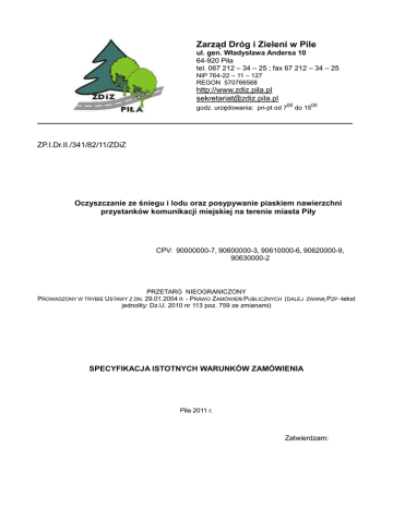 Zarząd Dróg i Zieleni w Pile ul. gen. Władysława Andersa 10 64-920 Piła tel. 067 212 – 34 – 25 ; fax 67 212 – 34 – 25 NIP 764-22 – 11 – 127 REGON 570766568 http://www.zdiz.pila.pl [email protected] 00 godz. urzędowania: pn-pt od 7 00 do 15 ______________________________________________________________________________ ZP.I.Dr.II./341/82/11/ZDiZ Oczyszczanie ze śniegu i lodu oraz posypywanie piaskiem nawierzchni przystanków komunikacji miejskiej na terenie miasta Piły CPV: 90000000-7, 90600000-3, 90610000-6, 90620000-9, 90630000-2 PRZETARG NIEOGRANICZONY PROWADZONY W TRYBIE USTAWY Z DN. 29.01.2004 R - PRAWO ZAMÓWIEŃ PUBLICZNYCH (DALEJ ZWANĄ PZP -tekst jednolity: Dz.U. 2010 nr 113 poz. 759 ze zmianami) SPECYFIKACJA ISTOTNYCH WARUNKÓW ZAMÓWIENIA Piła 2011 r. Zatwierdzam: Spis treści Część I Postanowienia ogólne 1. Informacja o zamawiającym 2. Osoby uprawnione do kontaktów z wykonawcami 3. Podstawa prawna 4. Generalne zasady uczestnictwa w postępowaniu 5. Oferty wariantowe, częściowe oraz równoważne 6. Pisemność postępowania 7. Podwykonawcy 8. Umowa ramowa 9. Aukcja elektroniczna 10. Forma wynagrodzenia. Część II Przedmiot zamówienia i termin jego realizacji 1. Przedmiot zamówienia 2. Zamówienie uzupełniające 3. Termin wykonania zamówienia Część III Warunki oraz dokumenty wymagane od wykonawcy 1. Warunki udziału w postępowaniu w oparciu o art. 22 ust. 1 pkt.2 ustawy Pz 2. Minimalne warunki udziału w postępowaniu określone w oparciu o art. 22 ust. 1 pkt.2 ustawy Pzp 3. Poleganie za zasobach innych podmiotów. 4. Wykaz dokumentów potwierdzających spełnianie warunków, o których mowa w art. 22 ust. 1 ustawy Pzp 5. Wykaz dokumentów świadczących o braku podstaw do wykluczenia z postępowania w okolicznościach, o których mowa w art. 24 ust. 1 ustawy Pzp 6. Inne dokumenty 7. Forma dokumentów 8. Zasady składania ofert wspólnych przez wykonawców Część IV Opis sposobu obliczania ceny oferty Część V Tryb i zasady wyboru najkorzystniejszej oferty 1. Tryb oceny ofert 2. Kryteria oceny ofert 3. Zasady oceny ofert według ustalonych kryteriów 2 Część VI Zasady przygotowania oferty 1. Wymogi formalne 2. Opakowanie oferty 3. Koszt przygotowania oferty 4. Wycofanie i zmiana oferty Część VII Informacje o trybie składania i otwarcia ofert 1. Miejsce i termin składania ofert 2. Miejsce i termin otwarcia ofert 3. Publiczne otwarcie ofert 4. Termin związania ofertą Część VIII Informacje o formalnościach po wyborze oferty Część IX Postanowienia końcowe 1. Ogłoszenie o wyniku postępowania 2. Pouczenie o środkach odwoławczych 3. Termin i miejsce podpisania umowy Część X Wykaz załączników 3 Część I Postanowienia ogólne 1. Informacja o zamawiającym Zamawiającym jest : Zarząd Dróg i Zieleni w Pile Adres: ul. gen. Władysława Andersa 10; 64 – 920 Piła Tel./fax.: 67 212 34 25 Regon: 570766568 NIP: 764-22-11-127 2. Osoby uprawnione do kontaktów z wykonawcami Osobami uprawnionymi do kontaktu z wykonawcami są: 1. W zakresie dotyczącym przedmiotu zamówienia: imię nazwisko: Małgorzata Pawłowska stanowisko służbowe: starszy specjalista w Dziale Dróg tel./fax: 67 212 34 25 wew. 18 imię nazwisko: Irena Zawal stanowisko służbowe: Kierownik Działu Dróg tel./fax: 67 212 34 25 wew. 18 2. W zakresie dotyczącym zagadnień formalno – prawnych: imię nazwisko: Piotr Ziółkowski stanowisko służbowe: Starszy referent prawny ds. zamówień publicznych tel./fax: 67 212 34 25 wew. 17 3. Podstawa prawna Postępowanie o udzielenie zamówienia publicznego prowadzone jest na podstawie przepisów ustawy z dnia 29 stycznia 2004 roku – Prawo zamówień publicznych (tekst jednolity: Dz.U. 2010 nr 113 poz. 759 ze zmianami). 4. Generalne zasady uczestnictwa w postępowaniu Ofertę może złożyć osoba fizyczna, osoba prawna lub jednostka organizacyjna nie posiadająca osobowości prawnej oraz podmioty te występujące wspólnie o ile spełniają warunki określone w ustawie – Prawo zamówień publicznych oraz w niniejszej specyfikacji. Każdy Wykonawca może złożyć tylko jedną ofertę. 5. Oferty wariantowe, częściowe oraz równoważne Zamawiający nie dopuszcza możliwości składania ofert wariantowych i częściowych. 6. Pisemność postępowania Oświadczenia, wnioski, zawiadomienia oraz informacje zamawiający i wykonawcy przekazują pisemnie, faksem lub drogą elektroniczną. Jeżeli zamawiający lub wykonawca przekazują oświadczenia, wnioski, zawiadomienia oraz informacje faksem lub drogą elektroniczną, każda ze stron na żądanie drugiej niezwłocznie potwierdza fakt ich otrzymania. 4 7. Podwykonawcy Zgodnie z art. 36 ust. 4 ustawy Prawo zamówień publicznych zamawiający wymaga wskazania przez wykonawcę w ofercie części zamówienia, której wykonanie zamierza powierzyć podwykonawcom. 8. Umowa ramowa Zamawiający nie przewiduje zawarcia umowy ramowej. 9. Aukcja elektroniczna Zamawiający nie przewiduje wykorzystania aukcji elektronicznej. 10. Forma wynagrodzenia. Wynagrodzenie kosztorysowe. Część II Przedmiot zamówienia i termin jego realizacji 1. Przedmiot zamówienia 1. Przedmiot zamówienia obejmuje zimowe utrzymanie przystanków komunikacji miejskiej na terenie miasta Piły polegające na: - oczyszczaniu ze śniegu lub lodu oraz posypywanie piaskiem nawierzchni - zamiataniu i sprzątaniu zanieczyszczeń na terenie przystanków. 2. Pod pojęciem przystanku autobusowego rozumie się miejsce przeznaczone do wsiadania lub i wysiadania pasażerów na danej linii komunikacyjnej, w którym umieszcza się informacje dotyczące w szczególności godzin odjazdu środków transportu, a ponadto, w transporcie drogowym , oznaczone zgodnie z przepisami ustawy z dnia 20 czerwca 1997 r.- Prawo o ruchu drogowym ( art. 4 ust.1 pkt13) ustawy o publicznym transporcie drogowym). 3. Dla potrzeb niniejszego zlecenia przyjmuje się, że teren przystanku obejmuje powierzchnię chodnika przylegającą bezp