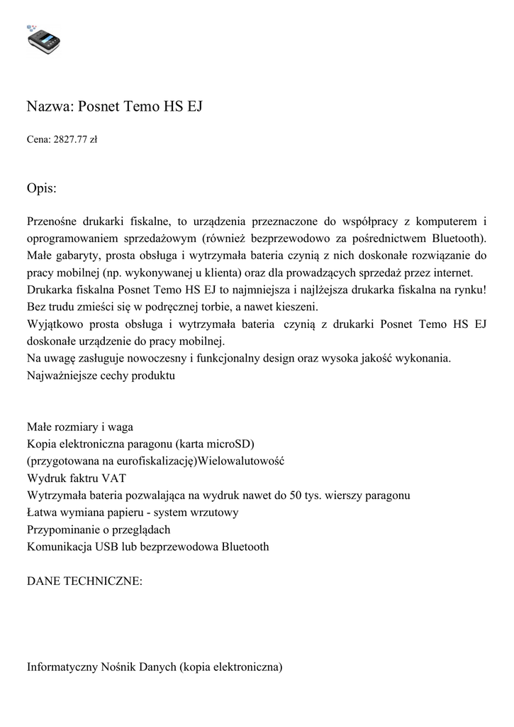Nazwa: Posnet Temo HS EJ Cena: 2827.77 zł Opis: Przenośne drukarki fiskalne, to urządzenia przeznaczone do współpracy z komputerem i oprogramowaniem sprzedażowym (również bezprzewodowo za pośrednictwem Bluetooth). Małe gabaryty, prosta obsługa i wytrzymała bateria czynią z nich doskonałe rozwiązanie do pracy mobilnej (np. wykonywanej u klienta) oraz dla prowadzących sprzedaż przez internet. Drukarka fiskalna Posnet Temo HS EJ to najmniejsza i najlżejsza drukarka fiskalna na rynku! Bez trudu zmieści się w podręcznej torbie, a nawet kieszeni. Wyjątkowo prosta obsługa i wytrzymała bateria czynią z drukarki Posnet Temo HS EJ doskonałe urządzenie do pracy mobilnej. Na uwagę zasługuje nowoczesny i funkcjonalny design oraz wysoka jakość wykonania. Najważniejsze cechy produktu Małe rozmiary i waga Kopia elektroniczna paragonu (karta microSD) (przygotowana na eurofiskalizację)Wielowalutowość Wydruk faktru VAT Wytrzymała bateria pozwalająca na wydruk nawet do 50 tys. wierszy paragonu Łatwa wymiana papieru - system wrzutowy Przypominanie o przeglądach Komunikacja USB lub bezprzewodowa Bluetooth DANE TECHNICZNE: Informatyczny Nośnik Danych (kopia elektroniczna) Karta microSD, microSDHC Eurofiskalizacja Możliwość zaprogramowania dowolnej waluty w jakiej moduł fiskalny będzie rejestrował sprzedaż. Mechanizm drukujący Jeden mechanizm termiczny Wrzutowy system wymiany papieru Szerokość papieru: 57mm Długość rolki: 14 metrów 40 znaków w wierszu Szybkość wydruku: 22 linie/s Wyświetlacz klienta Alfanumeryczny LCD z podświetleniem 2 x 16 znaków Wyświetlacz operatora Wspólny z wyświetlaczem klienta Komunikacja z PC 1 x USB Bluetooth (za pomoca dodatkowego modułu) Zgodność z protokołami komunikacyjnymi Posnet oraz Thermal Zasilanie / pobór mocy Wewnętrzny akumulator zapewniający wydruk 50 000 wierszy paragonu Zewnętrzny zasilacz 230V AC / 10-15V DC / 15W Wymiary i waga 86 x 46 x 128 mm (szer. x głęb. x wys.) ~ 380 g (z papierem) Zakres temperatur pracy 5 40oC Baza towarowa 100 000 nazw towarów Do 40 znaków nazwy towaru + dodatkowa linia opisu Stawki podatkowe 7 programowalnych stawek (A..G) Wyposażenie dodatkowe Ładowarka samochodowa 12V / 24V / 48V (opcja) Moduł Bluetooth (opcja) Ilość pozycji na paragonie do 255 Formy płatności Gotówka Karta (z dodatkowym opisem) Czek (z dodatkowym opisem) Bon (z dodatkowym opisem) Kredyt (z dodatkowym opisem) Waluta (z dodatkowym opisem) Rabaty Rabat kwotowy do pozycji paragonu Rabat procentowy do pozycji paragonu Rabat kwotowy do całego paragonu Rabat procentowy do całego paragonu Raporty fiskalne Raport dobowy Raport okresowy Raport okresowy miesięczny Raport okresowy rozliczeniowy Raporty niefiskalne Raport zmianowy Raport wpłaty do kasy Raport wypłaty z kasy Raport stanu kasy Raport kasy Podsumowanie sprzedaży Miesięczne podsumowanie sprzedaży Raport towarów zablokowanych Raport serwisowy Raport zmiany stawek PTU Raport zmiany czasu Raport kasjera Najważniejsze funkcje Kopia elektroniczna paragonu z możliwością zdalej archiwizacji (EJ) Zmiana waluty ewidencyjnej (eurofiskalizacja) Drukowanie faktur VAT (FV) Dodatkowa linia opisu dla każdej pozycji na paragonie Wydruk kodów kreskowych na paragonach (numer systemowy) Formatki wydruków m.in. do obsługi systemów lojalnosciowych i rabatowych System raportów i wydruków umożliwiający obsługę transakcji elektronicznych Przypominanie o obowiązkowym przeglądzie okresowym Wszystkie podane ceny, są cenami netto do których należy doliczyć podatek VAT. Cennik nie stanowi oferty handlowej w rozumieniu art. 66 par.1 Kodeksu Cywilnego