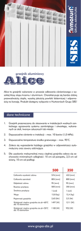 grzejnik aluminiowy Alice to grzejniki wykonane w procesie odlewania ciśnieniowego z wysokiej klasy stopu krzemu i aluminium. Charakteryzuje się bardzo dobrą przewodnością ciepła, wysoką jakością powłoki lakierniczej i odpornością na korozję. Produkt dostępny wyłącznie w Hurtowniach Grupy SBS! dane techniczne 1. Grzejnik przeznaczony do stosowania w instalacjach wodnych centralnego ogrzewania systemu zamkniętego i otwartego, wykonanych ze stali, tworzyw sztucznych lub miedzi. 2. Dopuszczalne ciśnienie w instalacji – max. 10 barów (1,0 MPa). 3. Dopuszczalna temperatura środka grzewczego – max. 95°C. 4. Zaleca się wyposażenie każdego grzejnika w odpowietrzacz automatyczny oraz zawory odcinające. 5. Dla uzyskania maksymalnej mocy cieplnej grzejnika zaleca się zachowanie minimalnych odległości: 10 cm od parapetu, 2,5 cm od ściany, 10 cm od podłogi. 500 350 Całkowita wysokość członu 576 [mm] 433 [mm] Całkowita szerokość 805 [mm] 800 [mm] Głębokość członu 95 [mm] 95 [mm] Rozstaw przyłączy 500 [mm] 350 [mm] Średnica przyłączy 1 [cal] 1 [cal] Waga 13,8 [kg] 12,4 [kg] Pojemność grzejnika 2,65 [litr] 3,5 [litr] Wydajność cieplna grzejnika dla Δt=60°C dla 10 elementów 1497 [W] 1211 [W] Wydajność cieplna grzejnika dla Δt=50°C dla 10 elementów 1180 [W] 952 [W] www.grupa-sbs.pl opis • trwałość i solidność wykonania dzięki długoletniemu doświadczeniu Armatury Kraków S.A. w produkcji grzejników i pełnej kontroli cyklu produkcyjnego od projektu po kontrolę jakości, • produkcja w nowoczesnym zakładzie ARMATOORA S.A. w Nisku, posiadającym certyfikat Systemu Zarządzania Jakością-ISO 9001, • grzejniki dostosowane do samodzielnych i centralnych instalacji grzewczych, • wysokie ciśnienie robocze 1,0 MPa (10 barów) umożliwia ich instalację w domach jednorodzinnych, • dzięki niskiemu ciężarowi grzejniki są lekkie i łatwe w transporcie i montażu, • montowane fabrycznie w zestawy składające się z 10 elementów połączonych ze sobą złączkami stalowymi i uszczelkami z fibry technicznej (istnieje możliwość rozbudowania o kolejne elementy), • całkowicie zautomatyzowany trójetapowy proces lakierowania grzejników, odbywający się w nowoczesnej lakierni gwarantuje wysoką jakość powłoki lakierniczej, odporność na korozję oraz zapobiega starzeniu i odbarwianiu się powłoki lakierniczej: »» I etap polega na pokryciu powłoką zapobiegającą korozji powierzchni zewnętrznych i wewnętrznych grzejnika, »» II etap to malowanie zanurzeniowe, »» III etap obejmuje proszkowe nanoszenie końcowej powłoki wykończeniowej (RAL 9010). 10 lat gwarancji SBS Sp. z o.o. ul. Aleksandrowska 67 / 93, 91-205 Łódź tel.: (42) 663 54 00, fax: (42) 663 54 02 www.grupa-sbs.pl