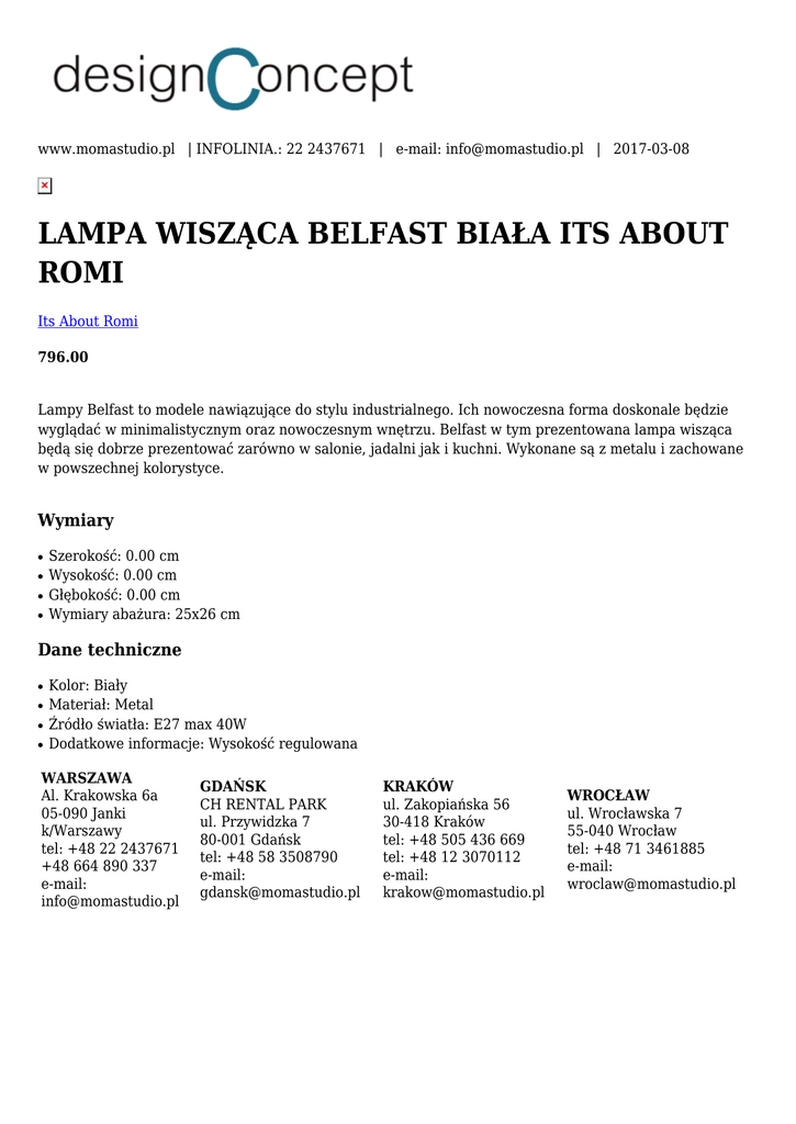 www.momastudio.pl | INFOLINIA.: 22 2437671 | e-mail: [email protected] | 2017-03-08 LAMPA WISZĄCA BELFAST BIAŁA ITS ABOUT ROMI Its About Romi 796.00 Lampy Belfast to modele nawiązujące do stylu industrialnego. Ich nowoczesna forma doskonale będzie wyglądać w minimalistycznym oraz nowoczesnym wnętrzu. Belfast w tym prezentowana lampa wisząca będą się dobrze prezentować zarówno w salonie, jadalni jak i kuchni. Wykonane są z metalu i zachowane w powszechnej kolorystyce. Wymiary ● ● ● ● Szerokość: 0.00 cm Wysokość: 0.00 cm Głębokość: 0.00 cm Wymiary abażura: 25x26 cm Dane techniczne ● ● ● ● Kolor: Biały Materiał: Metal Źródło światła: E27 max 40W Dodatkowe informacje: Wysokość regulowana WARSZAWA Al. Krakowska 6a 05-090 Janki k/Warszawy tel: +48 22 2437671 +48 664 890 337 e-mail: [email protected] GDAŃSK CH RENTAL PARK ul. Przywidzka 7 80-001 Gdańsk tel: +48 58 3508790 e-mail: [email protected] KRAKÓW ul. Zakopiańska 56 30-418 Kraków tel: +48 505 436 669 tel: +48 12 3070112 e-mail: [email protected] WROCŁAW ul. Wrocławska 7 55-040 Wrocław tel: +48 71 3461885 e-mail: [email protected]