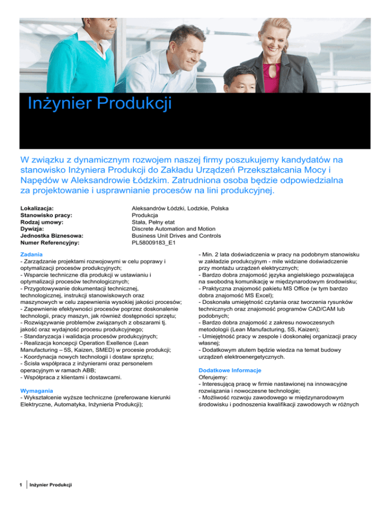 Inżynier Produkcji W związku z dynamicznym rozwojem naszej firmy poszukujemy kandydatów na stanowisko Inżyniera Produkcji do Zakładu Urządzeń Przekształcania Mocy i Napędów w Aleksandrowie Łódzkim. Zatrudniona osoba będzie odpowiedzialna za projektowanie i usprawnianie procesów na lini produkcyjnej. Lokalizacja: Stanowisko pracy: Rodzaj umowy: Dywizja: Jednostka Biznesowa: Numer Referencyjny: Aleksandrów Łódzki, Lodzkie, Polska Produkcja Stała, Pełny etat Discrete Automation and Motion Business Unit Drives and Controls PL58009183_E1 Zadania - Zarządzanie projektami rozwojowymi w celu poprawy i optymalizacji procesów produkcyjnych; - Wsparcie techniczne dla produkcji w ustawianiu i optymalizacji procesów technologicznych; - Przygotowywanie dokumentacji technicznej, technologicznej, instrukcji stanowiskowych oraz maszynowych w celu zapewnienia wysokiej jakości procesów; - Zapewnienie efektywności procesów poprzez doskonalenie technologii, pracy maszyn, jak również dostępności sprzętu; - Rozwiązywanie problemów związanych z obszarami tj. jakość oraz wydajność procesu produkcyjnego; - Standaryzacja i walidacja procesów produkcyjnych; - Realizacja koncepcji Operation Exellence (Lean Manufacturing – 5S, Kaizen, SMED) w procesie produkcji; - Koordynacja nowych technologii i dostaw sprzętu; - Ścisła współpraca z inżynierami oraz personelem operacyjnym w ramach ABB; - Współpraca z klientami i dostawcami. Wymagania - Wykształcenie wyższe techniczne (preferowane kierunki Elektryczne, Automatyka, Inżynieria Produkcji); 1 Inżynier Produkcji - Min. 2 lata doświadczenia w pracy na podobnym stanowisku w zakładzie produkcyjnym - mile widziane doświadczenie przy montażu urządzeń elektrycznych; - Bardzo dobra znajomość języka angielskiego pozwalająca na swobodną komunikację w międzynarodowym środowisku; - Praktyczna znajomość pakietu MS Office (w tym bardzo dobra znajomość MS Excel); - Doskonała umiejętność czytania oraz tworzenia rysunków technicznych oraz znajomość programów CAD/CAM lub podobnych; - Bardzo dobra znajomość z zakresu nowoczesnych metodologii (Lean Manufacturing, 5S, Kaizen); - Umiejętność pracy w zespole i doskonałej organizacji pracy własnej; - Dodatkowym atutem będzie wiedza na temat budowy urządzeń elektroenergetycznych. Dodatkowe Informacje Oferujemy: - Interesującą pracę w firmie nastawionej na innowacyjne rozwiązania i nowoczesne technologie; - Możliwość rozwoju zawodowego w międzynarodowym środowisku i podnoszenia kwalifikacji zawodowych w różnych obszarach; - Stabilność zatrudnienia w firmie o ugruntowanej pozycji rynkowej; - Atrakcyjne warunki zatrudnienia uzależnione od doświadczenia i posiadanych umiejętności; - Miłą atmosferę pracy. Informacje dodatkowe: Osoby zainteresowane prosimy o przesyłanie CV za pośrednictwem naszej strony klikając na przycisk „Aplikuj”. Zastrzegamy sobie prawo odpowiedzi wyłącznie na wybrane oferty. Wszystkie oferty powinny zawierać klauzulę: „Wyrażam zgodę na przetwarzanie moich danych osobowych zawartych w ofercie pracy zgodnie z Ustawą z dnia 29 sierpnia 1997 o ochronie danych osobowych (tekst jednolity Dz. U. 2002.101.926. z późn. zm.) dla potrzeb niezbędnych do realizacji procesu rekrutacji”. ABB (www.abb.com) jest liderem w technologiach dla energetyki i automatyki, które pozwalają klientom przemysłowym oraz zakładom użyteczności publicznej zwiększyć swoją efektywność, jednocześnie minimalizując oddziaływanie na środowisko naturalne. Grupa ABB zatrudnia około 140 000 pracowników w blisko 100 krajach świata. Our ambition. Your legacy. 2 Inżynier Produkcji