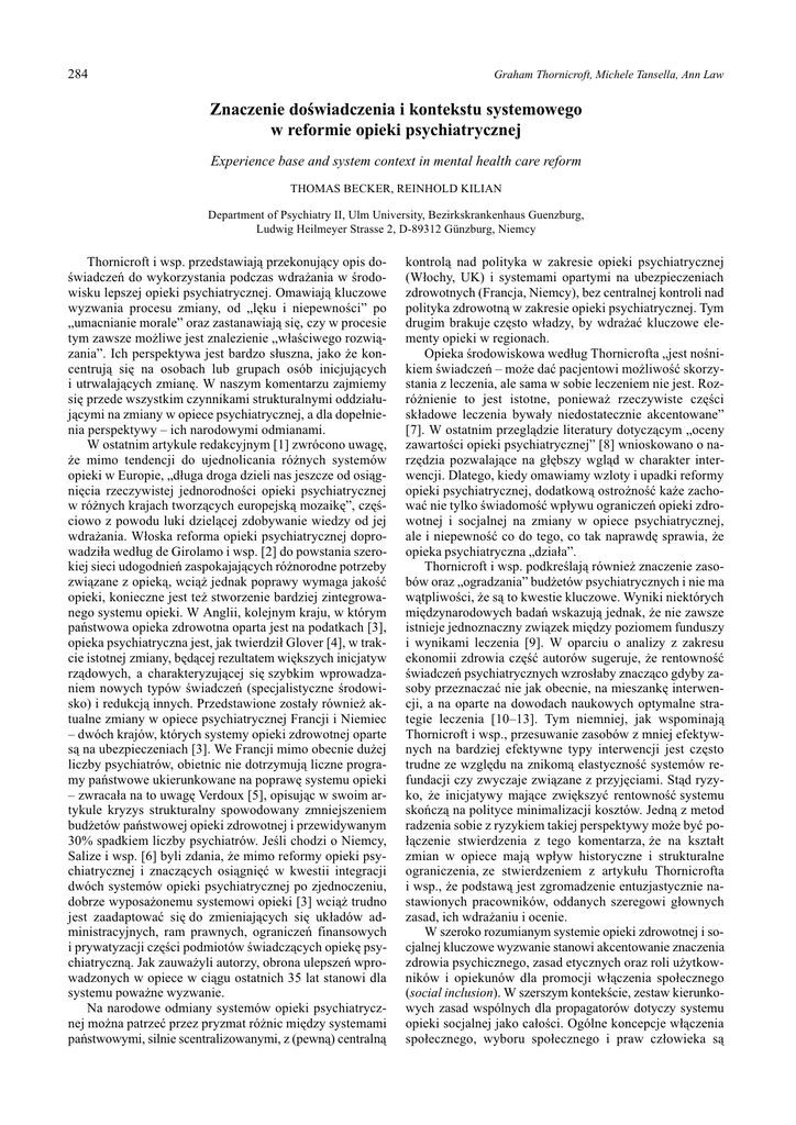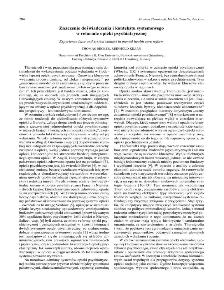 284 Graham Thornicroft, Michele Tansella, Ann Law Znaczenie dowiadczenia i kontekstu systemowego w reformie opieki psychiatrycznej Experience base and system context in mental health care reform THOMAS BECKER, REINHOLD KILIAN Department of Psychiatry II, Ulm University, Bezirkskrankenhaus Guenzburg, Ludwig Heilmeyer Strasse 2, D-89312 Günzburg, Niemcy Thornicroft i wsp. przedstawiaj¹ przekonuj¹cy opis dowiadczeñ do wykorzystania podczas wdra¿ania w rodowisku lepszej opieki psychiatrycznej. Omawiaj¹ kluczowe wyzwania procesu zmiany, od lêku i niepewnoci po umacnianie morale oraz zastanawiaj¹ siê, czy w procesie tym zawsze mo¿liwe jest znalezienie w³aciwego rozwi¹zania. Ich perspektywa jest bardzo s³uszna, jako ¿e koncentruj¹ siê na osobach lub grupach osób inicjuj¹cych i utrwalaj¹cych zmianê. W naszym komentarzu zajmiemy siê przede wszystkim czynnikami strukturalnymi oddzia³uj¹cymi na zmiany w opiece psychiatrycznej, a dla dope³nienia perspektywy ich narodowymi odmianami. W ostatnim artykule redakcyjnym [1] zwrócono uwagê, ¿e mimo tendencji do ujednolicania ró¿nych systemów opieki w Europie, d³uga droga dzieli nas jeszcze od osi¹gniêcia rzeczywistej jednorodnoci opieki psychiatrycznej w ró¿nych krajach tworz¹cych europejsk¹ mozaikê, czêciowo z powodu luki dziel¹cej zdobywanie wiedzy od jej wdra¿ania. W³oska reforma opieki psychiatrycznej doprowadzi³a wed³ug de Girolamo i wsp. [2] do powstania szerokiej sieci udogodnieñ zaspokajaj¹cych ró¿norodne potrzeby zwi¹zane z opiek¹, wci¹¿ jednak poprawy wymaga jakoæ opieki, konieczne jest te¿ stworzenie bardziej zintegrowanego systemu opieki. W Anglii, kolejnym kraju, w którym pañstwowa opieka zdrowotna oparta jest na podatkach [3], opieka psychiatryczna jest, jak twierdzi³ Glover [4], w trakcie istotnej zmiany, bêd¹cej rezultatem wiêkszych inicjatyw rz¹dowych, a charakteryzuj¹cej siê szybkim wprowadzaniem nowych typów wiadczeñ (specjalistyczne rodowisko) i redukcj¹ innych. Przedstawione zosta³y równie¿ aktualne zmiany w opiece psychiatrycznej Francji i Niemiec dwóch krajów, których systemy opieki zdrowotnej oparte s¹ na ubezpieczeniach [3]. We Francji mimo obecnie du¿ej liczby psychiatrów, obietnic nie dotrzymuj¹ liczne programy pañstwowe ukierunkowane na poprawê systemu opieki zwraca³a na to uwagê Verdoux [5], opisuj¹c w swoim artykule kryzys strukturalny spowodowany zmniejszeniem bud¿etów pañstwowej opieki zdrowotnej i przewidywanym 30% spadkiem liczby psychiatrów. Jeli chodzi o Niemcy, Salize i wsp. [6] byli zdania, ¿e mimo reformy opieki psychiatrycznej i znacz¹cych osi¹gniêæ w kwestii integracji dwóch systemów opieki psychiatrycznej po zjednoczeniu, dobrze wyposa¿onemu systemowi opieki [3] wci¹¿ trudno jest zaadaptowaæ siê do zmieniaj¹cych siê uk³adów administracyjnych, ram prawnych, ograniczeñ finansowych i prywatyzacji czêci podmiotów wiadcz¹cych opiekê psychiatryczn¹. Jak zauwa¿yli autorzy, obrona ulepszeñ wprowadzonych w opiece w ci¹gu ostatnich 35 lat stanowi dla systemu powa¿ne wyzwanie. Na narodowe odmiany systemów opieki psychiatrycznej mo¿na patrzeæ przez pryzmat ró¿nic miêdzy systemami pañstwowymi, silnie scentralizowanymi, z (pewn¹) centraln¹ kontrol¹ nad polityka w zakresie opieki psychiatrycznej (W³ochy, UK) i systemami opartymi na ubezpieczeniach zdrowotnych (Francja, Niemcy), bez centralnej kontroli nad polityka zdrowotn¹ w zakresie opieki psychiatrycznej. Tym drugim brakuje czêsto w³adzy, by wdra¿aæ kluczowe elementy opieki w regionach. Opieka rodowiskowa wed³ug Thornicrofta jest nonikiem wiadczeñ mo¿e daæ pacjentowi mo¿liwoæ skorzystania z leczenia, ale sama w sobie leczeniem nie jest. Rozró¿nienie to jest istotne, poniewa¿ rzeczywiste czêci sk³adowe leczenia bywa³y niedostatecznie akcentowane [7]. W ostatnim przegl¹dzie literatury dotycz¹cym oceny zawartoci opieki psychiatrycznej [8] wnioskowano o narzêdzia pozwalaj¹ce na g³êbszy wgl¹d w charakter interwencji. Dlatego, kiedy omawiamy wzloty i upadki reformy opieki psychiatrycznej, dodatkow¹ ostro¿noæ ka¿e zachowaæ nie tylko wiadomoæ wp³ywu ograniczeñ opieki zdrowotnej i socjalnej na zmiany w opiece psychiatrycznej, ale i niepewnoæ co do tego, co tak naprawdê sprawia, ¿e opieka psychiatryczna dzia³a. Thornicroft i wsp. podkrelaj¹ równie¿ znaczenie zasobów oraz ogradzania bud¿etów psychiatrycznych i nie ma w¹tpliwoci, ¿e s¹ to kwestie kluczowe. Wyniki niektórych miêdzynarodowych badañ wskazuj¹ jednak, ¿e nie zawsze istnieje jednoznaczny zwi¹zek miêdzy poziomem funduszy i wynikami leczenia [9]. W oparciu o analizy z zakresu ekonomii zdrowia czêæ autorów sugeruje, ¿e rentownoæ wiadczeñ psychiatrycznych wzros³aby znacz¹co gdyby zasoby przeznaczaæ nie jak obecnie, na mieszankê interwencji, a na oparte na dowodach naukowych optymalne strategie leczenia [1013]. Tym niemniej, jak wspominaj¹ Thornicroft i wsp., przesuwanie zasobów z mniej efektywnych na bardziej efektywne typy interwencji jest czêsto trudne ze wzglêdu na znikom¹ elastycznoæ systemów refundacji czy zwyczaje zwi¹zane z przyjêciami. St¹d ryzyko, ¿e inicjatywy maj¹ce zwiêkszyæ rentownoæ systemu skoñcz¹ na polityce minimalizacji kosztów. Jedn¹ z metod radzenia sobie z ryzykiem takiej perspektywy mo¿e byæ po³¹czenie stwierdzenia z tego komentarza, ¿e na kszta³t zmian w opiece maj¹ wp³yw historyczne i strukturalne ograniczenia, ze stwierdzeniem z artyku³u Thornicrofta i wsp., ¿e podstaw¹ jest zgromadzenie entuzjastycznie nastawionych pracowników, oddanych szeregowi g³ownych zasad, ich wdra¿aniu i ocenie. W szeroko rozumianym systemie opieki zdrowotnej i socjalnej kluczowe wyzwanie stanowi akcentowanie znaczenia zdrowia psychicznego, zasad etycznych oraz roli u¿ytkowników i opiekunów dla promocji w³¹czenia spo³ecznego (social inclusion). W szerszym kontekcie, zestaw kierunkowych zasad wspólnych dla propaga
