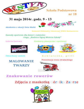 Szkoła Podstawowa nr 18 31 maja 2014r. godz. 9 - 13 Akademia z okazji Dnia Matki Koncert Orkiestry Górniczej KWK Bielszowice Zawody sportowe dla dzieci i rodziców: ringo, „Rodzicu Ograj Mistrza Szkoły” Loteria fantowa Dmuchany zamek MALOWANIE TWARZY Konkursy plastyczne i sportowe K a w i a r e n k a , g r i l l Prezentacja wozu strażackiego Znakowanie rowerów Zdjęcia z maskotką Górnika Zabrze