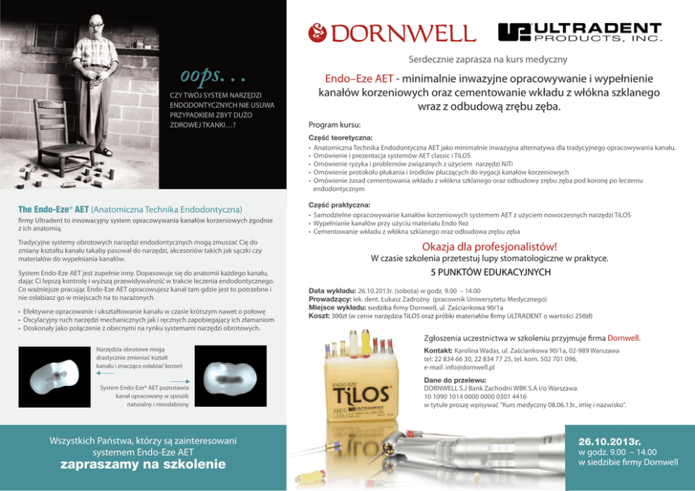oops. . . CZY TWÓJ SYSTEM NARZĘDZI ENDODONTYCZNYCH NIE USUWA PRZYPADKIEM ZBYT DUŻO ZDROWEJ TKANKI…? Serdecznie zaprasza na kurs medyczny Endo–Eze AET - minimalnie inwazyjne opracowywanie i wypełnienie kanałów korzeniowych oraz cementowanie wkładu z włókna szklanego wraz z odbudową zrębu zęba. Program kursu: Część teoretyczna: • Anatomiczna Technika Endodontyczna AET jako minimalnie inwazyjna alternatywa dla tradycyjnego opracowywania kanału. • Omówienie i prezentacja systemów AET classic i TiLOS • Omówienie ryzyka i problemów związanych z użyciem narzędzi NiTi • Omówienie protokołu płukania i środków płuczących do irygacji kanałów korzeniowych • Omówienie zasad cementowania wkładu z włókna szklanego oraz odbudowy zrębu zęba pod koronę po leczeniu endodontycznym The Endo-Eze® AET (Anatomiczna Technika Endodontyczna) z ich anatomią. Tradycyjne systemy obrotowych narzędzi endodontycznych mogą zmuszać Cię do zmiany kształtu kanału takaby pasował do narzędzi, akcesoriów takich jak sączki czy materiałów do wypełniania kanałów. System Endo-Eze AET jest zupełnie inny. Dopasowuje się do anatomii każdego kanału, dając Ci lepszą kontrolę i wyższą przewidywalność w trakcie leczenia endodontycznego. Co ważniejsze pracując Endo-Eze AET opracowujesz kanał tam gdzie jest to potrzebne i nie osłabiasz go w miejscach na to narażonych. • Efektywne opracowanie i ukształtowanie kanału w czasie krótszym nawet o połowę • Oscylacyjny ruch narzędzi mechanicznych jak i ręcznych zapobiegający ich złamaniom • Doskonały jako połączenie z obecnymi na rynku systemami narzędzi obrotowych. Część praktyczna: • Samodzielne opracowywanie kanałów korzeniowych systemem AET z użyciem nowoczesnych narzędzi TiLOS • Wypełnianie kanałów przy użyciu materiału Endo Rez • Cementowanie wkładu z włókna szklanego oraz odbudowa zrębu zęba Okazja dla profesjonalistów! W czasie szkolenia przetestuj lupy stomatologiczne w praktyce. 5 PUNKTÓW EDUKACYJNYCH Data wykładu: 26.10.2013r. (sobota) w godz. 9.00 – 14.00 Prowadzący: lek. dent. Łukasz Zadrożny (pracownik Uniwersytetu Medycznego) Miejsce wykładu: Koszt: Dornwell. Narzędzia obrotowe mogą drastycznie zmieniać kształt kanału i znacząco osłabiać korzeń System Endo-Eze® AET pozostawia kanał opracowany w sposób naturalny i nieosłabiony Wszystkich Państwa, którzy są zainteresowani systemem Endo-Eze AET zapraszamy na szkolenie Kontakt: Karolina Wadas, ul. Zaściankowa 90/1a, 02-989 Warszawa tel: 22 834 66 30, 22 834 77 25, tel. kom. 502 701 096, e-mail: [email protected] Dane do przelewu: DORNWELL S.J Bank Zachodni WBK S.A I/o Warszawa 10 1090 1014 0000 0000 0301 4416 w tytule proszę wpisywać "Kurs medyczny 08.06.13r., imię i nazwisko". 26.10.2013r. w godz. 9.00 – 14.00