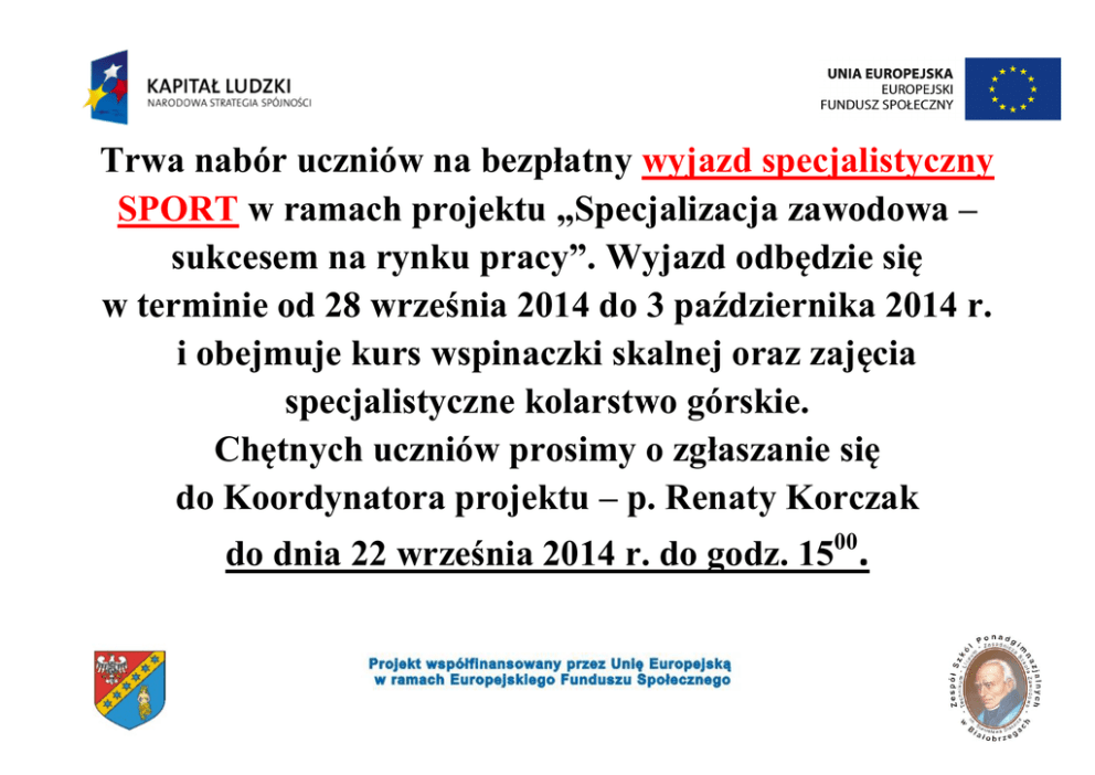 Trwa nabór uczniów na bezpłatny wyjazd specjalistyczny SPORT w ramach projektu „Specjalizacja zawodowa – sukcesem na rynku pracy”. Wyjazd odbędzie się w terminie od 28 września 2014 do 3 października 2014 r. i obejmuje kurs wspinaczki skalnej oraz zajęcia specjalistyczne kolarstwo górskie. Chętnych uczniów prosimy o zgłaszanie się do Koordynatora projektu – p. Renaty Korczak do dnia 22 września 2014 r. do godz. 1500.