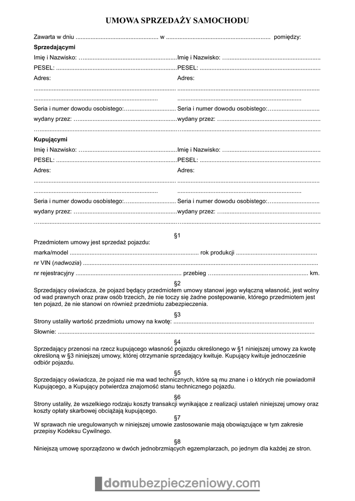 UMOWA SPRZEDAŻY SAMOCHODU Zawarta w dniu .................................................. w ............................................................... pomiędzy: Sprzedającymi Imię i Nazwisko: …........................................................ Imię i Nazwisko: …........................................................ PESEL: ......................................................................... PESEL: ......................................................................... Adres: Adres: ...................................................................................... ...................................................................................... ........................................................................... ........................................................................... Seria i numer dowodu osobistego:…............................ Seria i numer dowodu osobistego:…............................ wydany przez: …........................................................... wydany przez: …........................................................... …................................................................................... …................................................................................... Kupującymi Imię i Nazwisko: …........................................................ Imię i Nazwisko: …........................................................ PESEL: ......................................................................... PESEL: ......................................................................... Adres: Adres: ...................................................................................... ...................................................................................... ........................................................................... ........................................................................... Seria i numer dowodu osobistego:…............................ Seria i numer dowodu osobistego:…............................ wydany przez: …........................................................... wydany przez: …........................................................... …................................................................................... …................................................................................... §1 Przedmiotem umowy jest sprzedaż pojazdu: marka/model .............................................................................. rok produkcji ................................................. nr VIN (nadwozia) .............................................................................................................................................. nr rejestracyjny ................................................................ przebieg …......................................................... km. §2 Sprzedający oświadcza, że pojazd będący przedmiotem umowy stanowi jego wyłączną własność, jest wolny od wad prawnych oraz praw osób trzecich, że nie toczy się żadne postępowanie, którego przedmiotem jest ten pojazd, że nie stanowi on również przedmiotu zabezpieczenia. §3 Strony ustaliły wartość przedmiotu umowy na kwotę: ..................................................................................... Słownie: ........................................................................................................................................................... §4 Sprzedający przenosi na rzecz kupującego własność pojazdu określonego w §1 niniejszej umowy za kwotę określoną w §3 niniejszej umowy, której otrzymanie sprzedający kwituje. Kupujący kwituje jednocześnie odbiór pojazdu. §5 Sprzedający oświadcza, że pojazd nie ma wad technicznych, które są mu znane i o których nie powiadomił Kupującego, a Kupujący potwierdza znajomość stanu technicznego pojazdu. §6 Strony ustaliły, że wszelkiego rodzaju koszty transakcji wynikające z realizacji ustaleń niniejszej umowy oraz koszty opłaty skarbowej obciążają kupującego. §7 W sprawach nie uregulowanych w niniejszej umowie zastosowanie mają obowiązujące w tym zakresie przepisy Kodeksu Cywilnego. §8 Niniejszą umowę sporządzono w dwóch jednobrzmiących egzemplarzach, po jednym dla każdej ze stron. Sprzedający Kupujący