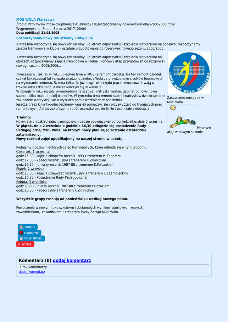 MOS WOLA Warszawa Źródło: http://www.moswola.pl/mos/aktualnosci/720,Rozpoczynamy-nowy-rok-szkolny-20052006.html Wygenerowano: Środa, 8 marca 2017, 20:04 Data publikacji 31.08.2005 Rozpoczynamy nowy rok szkolny 2005/2006 1 września rozpoczyna się nowy rok szkolny. Po letnim odpoczynku i szkoleniu siatkarskim na obozach, rozpoczynamy zajęcia treningowe w klubie i ostatnie przygotowania do rozgrywek nowego sezonu 2005/2006... 1 września rozpoczyna się nowy rok szkolny. Po letnim odpoczynku i szkoleniu siatkarskim na obozach, rozpoczynamy zajęcia treningowe w klubie i końcowy etap przygotowań do rozgrywek nowego sezonu 2005/2006... Tymczasem , tak jak w roku ubiegłym trwa w MOS-ie remont ośrodka. Na ten remont ośrodek czekał kilkadziesiąt lat i chwała władzom dzielnicy Wola za przydzielenie środków finansowych na wykonanie remontu. Szkoda tylko, że już drugi rok z rzędu prace remontowe trwają w trakcie roku szkolnego, a nie zakończyły się w wakacje. W ubiegłym roku zostały wyremontowane szatnie i natryski męskie, gabinet odnowy,nowa sauna , kilka toalet i pokój trenerów. W tym roku trwa remont szatni i natrysków dziewcząt oraz Zaczynamu nowy rok w zakładanie wentylacji we wszystkich pomieszczeniach w podziemiu. MOS Wola Jeszcze przez kilka tygodni będziemy musieli pomęczyć się i przyzwyczaić do trwających prac remontowych. Ale po zakończeniu robót wszystko będzie lśniło i pachniało świeżością ! Treningi Nowy, stały rozkład zajęć treningowych będzie obowiązywał od poniedziałku, dnia 5 września. W piątek, dnia 2 września o godzinie 16,30 odbędzie się posiedzenie Rady Pedagogicznej MOS Wola, na którym nowy plan zajęć zostanie ostatecznie zatwierdzony. Nowy rozkład zajęć opublikujemy na naszej stronie w sobotę. Podajemy godziny niektórych zajęć treningowych, które odbedą się w tym tygodniu: Czwartek, 1 września: godz.15,30 - zajęcia chłopców rocznik 1993 z trenerem P. Taborem godz.17,30 - kadeci rocznik 1989 z trenerem K.Zimnickim godz.19,30 - juniorzy rocznik 1987-88 z trenerem K.Felczakiem Piątek, 2 września godz.15,30 - zajęcia dziewcząt rocznik 1992 z trenerem K.Czarnołęckim godz.16,30 - Posiedzenie Rady Pedagogicznej Sobota, 3 września: godz.9,00 - juniorzy rocznik 1987-88 z trenerem Felczakiem godz.10,30 - kadeci 1989 z trenerem K.Zimnickim Wszystkie grupy trenują od poniedziałku według nowego planu. Powodzenia w nowym roku szkolnym i doskonałych wyników sportowych wszystkim zawodniczkom, zawodnikom i trenerom życzy Zarząd MOS Wola. Komentarz (0) dodaj komentarz Brak komentarzy dodaj komentarz Pięknych akcji w nowym sezonie