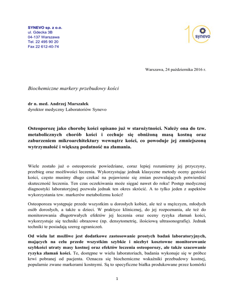 SYNEVO sp. z o.o. ul. Gdecka 3B 04-137 Warszawa Tel. 22 495 90 20 Fax 22 612-40-74 Warszawa, 24 października 2016 r. Biochemiczne markery przebudowy kości dr n. med. Andrzej Marszałek dyrektor medyczny Laboratoriów Synevo Osteoporozę jako chorobę kości opisano już w starożytności. Należy ona do tzw. metabolicznych chorób kości i cechuje się obniżoną masą kostną oraz zaburzeniem mikroarchitektury wewnątrz kości, co powoduje jej zmniejszoną wytrzymałość i większą podatność na złamania. Wiele zostało już o osteoporozie powiedziane, coraz lepiej rozumiemy jej przyczyny, przebieg oraz możliwości leczenia. Wykorzystując jednak klasyczne metody oceny gęstości kości, często musimy długo czekać na pojawienie się zmian pozwalających potwierdzić skuteczność leczenia. Ten czas oczekiwania może sięgać nawet do roku! Postęp medycznej diagnostyki laboratoryjnej pozwala jednak ten okres skrócić. A to tylko jeden z aspektów wykorzystania tzw. markerów metabolizmu kości! Osteoporoza występuje przede wszystkim u dorosłych kobiet, ale też u mężczyzn, młodych osób dorosłych, a także u dzieci. W praktyce klinicznej, do jej rozpoznania, ale też do monitorowania długotrwałych efektów jej leczenia oraz oceny ryzyka złamań kości, wykorzystuje się techniki obrazowe (np. densytometrię, ilościową ultrasonografię). Jednak techniki te posiadają szereg ograniczeń. Od wielu lat możliwe jest dodatkowe zastosowanie prostych badań laboratoryjnych, mających na celu przede wszystkim szybkie i niezbyt kosztowne monitorowanie szybkości utraty masy kostnej oraz efektów leczenia osteoporozy, ale także szacowanie ryzyka złamań kości. Te, dostępne w wielu laboratoriach, badania wykonuje się w próbce krwi pobranej od pacjenta. Oznacza się biochemiczne wskaźniki przebudowy kostnej, popularnie zwane markerami kostnymi. Są to specyficzne białka produkowane przez komórki 1 kości lub powstające w wyniku resorpcji kości, stąd nazywane markerami kościotworzenia lub markerami resorpcji. Zgodnie ze światowymi zaleceniami powinno się wykonywać oznaczenia w próbce krwi jednego markera kościotworzenia (N-końcowego propeptydu kolagenu typu I, P1NP) oraz jednego markera resorpcji kości (C-końcowego usieciowanego telopeptydu kolagenu typu I, CTx). Zazwyczaj do pakietu badań dołącza się ocenę stężenia witaminy D. Stosowanie tych wskaźników także ma swoje ograniczenia: zmienność dobową, biologiczną (np. sezonowość, płeć, wiek, występowanie niektórych chorób czy przewlekłe stosowanie leków). Świadomość tych ograniczeń pozwala na właściwą interpretację wyników badań laboratoryjnych markerów kostnych i zwiększa ich optymalne zastosowanie w praktyce klinicznej. Ponieważ żyjemy coraz dłużej, wszystkim – nam samym, ubezpieczycielom, organizatorom ochrony zdrowia – zależy na utrzymaniu sprawności do jak najpóźniejszego wieku. By rozpowszechnić wiedzę o możliwości zastosowania markerów metabolizmu kostnego, współpracując w zespole interdyscyplinarnym i wykorzystując chęć współpracy ze strony dostawcy aparatury i odczynników do badań, postanowiliśmy przeprowadzić badania u około 100 pacjentek z Polski. Badania te zostaną przeprowadzone w układzie dynamicznym, z zachowaniem możliwości oceny postępowania terapeutycznego. Takie podejście – połączenie pracy specjalistów różnych dziedzin medycyny, klinicystów, diagnostów laboratoryjnych – to podstawa sukcesu. Hasło: „Kobieto, nie łam się!” musi przybrać praktyczny wydźwięk. 2