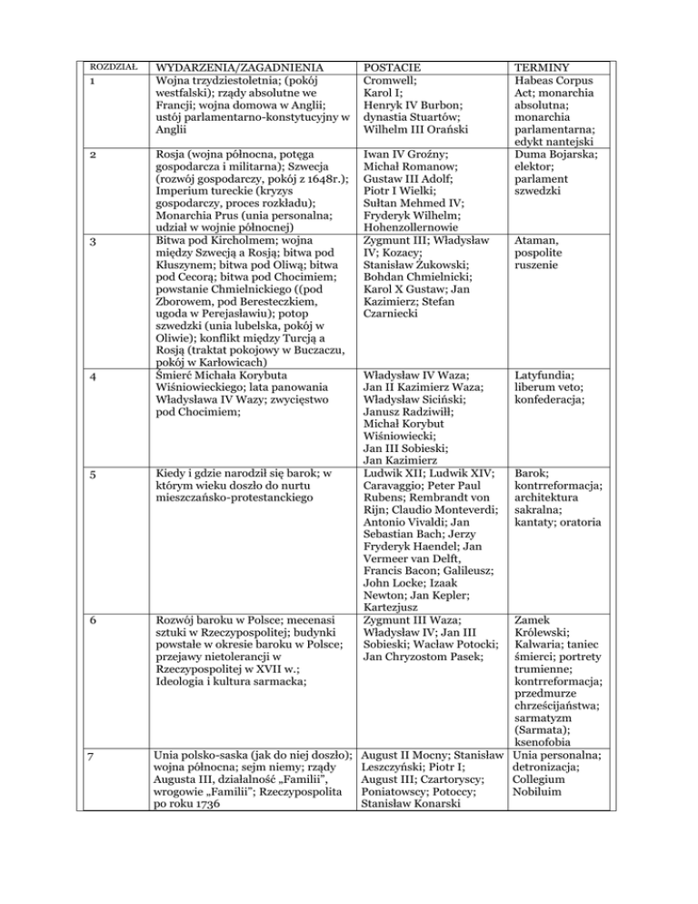 ROZDZIAŁ 1 2 3 4 WYDARZENIA/ZAGADNIENIA Wojna trzydziestoletnia; (pokój westfalski); rządy absolutne we Francji; wojna domowa w Anglii; ustój parlamentarno-konstytucyjny w Anglii POSTACIE Cromwell; Karol I; Henryk IV Burbon; dynastia Stuartów; Wilhelm III Orański Rosja (wojna północna, potęga gospodarcza i militarna); Szwecja (rozwój gospodarczy, pokój z 1648r.); Imperium tureckie (kryzys gospodarczy, proces rozkładu); Monarchia Prus (unia personalna; udział w wojnie północnej) Bitwa pod Kircholmem; wojna między Szwecją a Rosją; bitwa pod Kłuszynem; bitwa pod Oliwą; bitwa pod Cecorą; bitwa pod Chocimiem; powstanie Chmielnickiego ((pod Zborowem, pod Beresteczkiem, ugoda w Perejasławiu); potop szwedzki (unia lubelska, pokój w Oliwie); konflikt między Turcją a Rosją (traktat pokojowy w Buczaczu, pokój w Karłowicach) Śmierć Michała Korybuta Wiśniowieckiego; lata panowania Władysława IV Wazy; zwycięstwo pod Chocimiem; Iwan IV Groźny; Michał Romanow; Gustaw III Adolf; Piotr I Wielki; Sułtan Mehmed IV; Fryderyk Wilhelm; Hohenzollernowie Zygmunt III; Władysław IV; Kozacy; Stanisław Żukowski; Bohdan Chmielnicki; Karol X Gustaw; Jan Kazimierz; Stefan Czarniecki 5 Kiedy i gdzie narodził się barok; w którym wieku doszło do nurtu mieszczańsko-protestanckiego 6 Rozwój baroku w Polsce; mecenasi sztuki w Rzeczypospolitej; budynki powstałe w okresie baroku w Polsce; przejawy nietolerancji w Rzeczypospolitej w XVII w.; Ideologia i kultura sarmacka; 7 Władysław IV Waza; Jan II Kazimierz Waza; Władysław Siciński; Janusz Radziwiłł; Michał Korybut Wiśniowiecki; Jan III Sobieski; Jan Kazimierz Ludwik XII; Ludwik XIV; Caravaggio; Peter Paul Rubens; Rembrandt von Rijn; Claudio Monteverdi; Antonio Vivaldi; Jan Sebastian Bach; Jerzy Fryderyk Haendel; Jan Vermeer van Delft, Francis Bacon; Galileusz; John Locke; Izaak Newton; Jan Kepler; Kartezjusz Zygmunt III Waza; Władysław IV; Jan III Sobieski; Wacław Potocki; Jan Chryzostom Pasek; TERMINY Habeas Corpus Act; monarchia absolutna; monarchia parlamentarna; edykt nantejski Duma Bojarska; elektor; parlament szwedzki Ataman, pospolite ruszenie Latyfundia; liberum veto; konfederacja; Barok; kontrreformacja; architektura sakralna; kantaty; oratoria Zamek Królewski; Kalwaria; taniec śmierci; portrety trumienne; kontrreformacja; przedmurze chrześcijaństwa; sarmatyzm (Sarmata); ksenofobia Unia polsko-saska (jak do niej doszło); August II Mocny; Stanisław Unia personalna; wojna północna; sejm niemy; rządy Leszczyński; Piotr I; detronizacja; Augusta III, działalność „Familii”, August III; Czartoryscy; Collegium wrogowie „Familii”; Rzeczypospolita Poniatowscy; Potoccy; Nobiluim po roku 1736 Stanisław Konarski