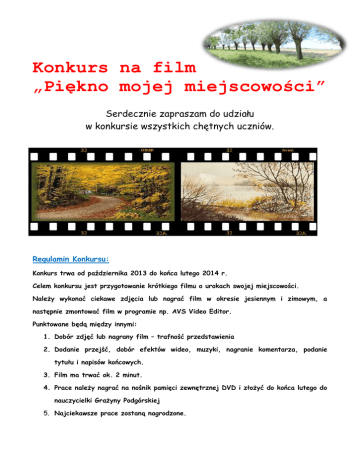Konkurs na film „Piękno mojej miejscowości” Serdecznie zapraszam do udziału w konkursie wszystkich chętnych uczniów. Regulamin Konkursu: Konkurs trwa od października 2013 do końca lutego 2014 r. Celem konkursu jest przygotowanie krótkiego filmu o urokach swojej miejscowości. Należy wykonać ciekawe zdjęcia lub nagrać film w okresie jesiennym i zimowym, a następnie zmontować film w programie np. AVS Video Editor. Punktowane będą między innymi: 1. Dobór zdjęć lub nagrany film – trafność przedstawienia 2. Dodanie przejść, dobór efektów wideo, muzyki, nagranie komentarza, podanie tytułu i napisów końcowych. 3. Film ma trwać ok. 2 minut. 4. Prace należy nagrać na nośnik pamięci zewnętrznej DVD i złożyć do końca lutego do nauczycielki Grażyny Podgórskiej 5. Najciekawsze prace zostaną nagrodzone.