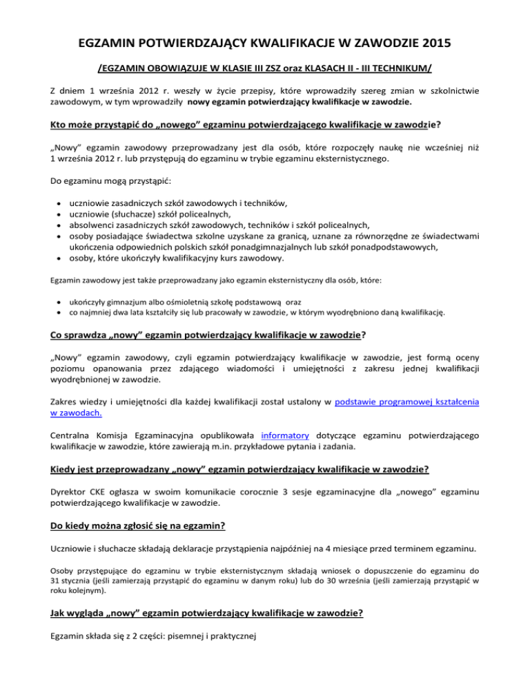 EGZAMIN POTWIERDZAJĄCY KWALIFIKACJE W ZAWODZIE 2015 EGZAMIN OBOWIĄZUJE W KLASIE III ZSZ oraz KLASACH II - III TECHNIKUM/ w szkolnictwie nowy zawodzie. K ie? N 1 oraz kwalifika C ? N jednej zawodzie. pr ia w zawodach. C K informatory potwierdza zadania. K CK w swoim komunikacie corocznie 3 sesje egzaminacyjne dla . egzaminu D O 31 J Egzam dopuszczenie do egzaminu do C 60 minut cztery odpowiedzi do wyboru C C przeprowadzana w formie zadania egzaminacyjnego zawartego egzaminacyjnym. C jest w informatorze w Do z zawodowego. C E W t pobi W 171 przypadku trzecie egzaminu eksternistycznego C L z Czy osobom ze specjalnymi potrzebami edukacyjnymi ? dostosowanie Tak. m, z niewidomym A , S komunikacie dyrektora CKE. J z cz Wynik egzaminu zawodowego ustala i przekazuje OKE. J potwie N S Europass K w dyplomie i ma S W roku 2014, po raz kolejny, absolwenci Technikum w Zespole Szk J I wS Z EGZAMINU POTWIERDZAJĄCEGO KWALIFIKACJE W ZAWODZIE DLA POSZCZEGÓLNYCH KWALIFIKACJI w sesji 25 maja - 6 lipca 2014r, w A . /PLIK Analiza egzaminu i kwalifikacje w zawodzie 2014/