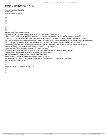 Środowiskowy Dom Samopomocy w Myśliborzu DZIEŃ RODZINY 2016 Autor: Małgosia Kępińska 13.06.2016. Zmieniony 24.08.2016. W tradycji ŚDS od kilku lat zapisane są obchody Dnia Rodziny. W tym roku również z okazji tego święta gościliśmy w naszym Domu rodziców i opiekunów uczestników ŚDS. Tym razem zależało nam na tym aby rodziny naszych uczestników zostały w pełni do nas „wciągnięte”. Stąd pomysł aby członkowie rodzin doświadczyli tego czego na co dzień doświadczają nasi uczestnicy. Mamy nadzieję, że pozwoliło to poznać charakter Domu jak również dowiedzieć się ile wysiłku i umiejętności wymaga wspólna praca w ŚDS. Po wykonaniu swoich zadań przyszedł czas na wspólne biesiadowanie. Za codzienną troskę i wsparcie nasi uczestnicy w dowód wdzięczność podarowali swoim opiekunom wyhodowane zioła w pięknie zdobionych skrzyneczkach wykonanych podczas terapii zajęciowej. Impreza była wspaniałą okazją do spotkania się rodzin i wspólnej integracji. Wszystkim przybyłym gościom serdecznie dziękujemy. Zapraszamy do galerii zdjęć http://starastrona.sdsmysliborz.pl Kreator PDF Utworzono 8 March, 2017, 20:04