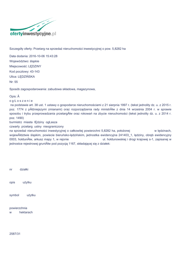 Szczegóły oferty: Przetarg na sprzedaż nieruchomości inwestycyjnej o pow. 5,8282 ha Data dodania: 2016-10-06 15:43:28 Województwo: śląskie Miejscowość: LĘDZINY Kod pocztowy: 43-143 Ulica: LĘDZIŃSKA Nr: 55 Sposób zagospodarowania: zabudowa składowa, magazynowa, Opis:  ogŁoszenie na podstawie art. 38 ust. 1 ustawy o gospodarce nieruchomościami z 21 sierpnia 1997 r. (tekst jednolity dz. u. z 2015 r. poz. 1774 z pĂłźniejszymi zmianami) oraz rozporządzenia rady ministrĂłw z dnia 14 września 2004 r. w sprawie sposobu i trybu przeprowadzania przetargĂłw oraz rokowań na zbycie nieruchomości (tekst jednolity dz. u. z 2014 r. poz. 1490) burmistrz miasta lĘdziny ogŁasza czwarty przetarg ustny nieograniczony na sprzedaż nieruchomości inwestycyjnej o całkowitej powierzchni 5,8282 ha, położonej w lędzinach, wojewĂłdztwie śląskim, powiecie bieruńsko-lędzińskim, jednostka ewidencyjna 241403_1, lędziny, obręb ewidencyjny 0003, hołdunĂłw, arkusz mapy 1, w rejonie ul. hołdunowskiej i drogi krajowej s-1, zapisanej w jednostce rejestrowej gruntĂłw pod pozycją 1167, składającej się z działek: nr działki opis symbol użytku użytku powierzchnia w hektarach 2587/31 grunty orne łąki trwałe drogi nieużytki rv Łv dr n 0,2122 0,0220 0,0035 0,0360 2588/31 grunty drogi nieużytki orne rv dr n 0,2195 0,0035 0,0120 2589/31 grunty orne łąki trwałe łąki trwałe łąki trwałe drogi rowy nieużytki rv Łiv Łv Łvi dr w n 1,3567 0,9214 0,9437 1,2925 0,1674 0,0345 0,6033  własność ww. nieruchomości wpisana jest - na rzecz gminy lędziny - w księdze wieczystej ka1t/00039163/2 prowadzonej przez sąd rejonowy w tychach, ul. budowlanych 33, wydział v ksiąg wieczystych. w dziale i-sp wpisane jest uprawnienie wynikające z prawa ujawnionego w dziale iii innej księgi wieczystej - prawo służebności gruntowej nie dotyczące nieruchomości przeznaczonej do sprzedaży. działy iii i iv księgi wieczystej wolne są od wpisĂłw. zapisy działu i-sp zostaną przeniesione do księgi wieczystej nabywcy nieruchomości. przedmiotowa nieruchomość nie jest przedmiotem praw i zobowiązań względem osĂłb trzecich. nieruchomość położona jest w pĂłłnocno-wschodniej części miasta lędziny, w rejonie drogi krajowej s-1 i ul. hołdunowskiej. posiada kształt zbliżony do trĂłjkąta. od pĂłłnocy przylega do drogi publicznej biegnącej rĂłwnolegle do drogi krajowej, komunikującej tereny przemysłowe z ul. hołdunowską, od wschodu grunt ogranicza skarpa czynnego nasypu kolejowego, od południa przylega do gruntĂłw z bocznicą kolejową kwk â??ziemowitâ??, od zachodu sąsiaduje z gruntami niezabudowanymi o przeznaczeniu przemysłowym. dojazd do nieruchomości odbywa się od ul. hołdunowskiej drogą publiczną klasy dojazdowej (symbol planu kdd1/2) o nawierzchni gruntowej utwardzonej kruszywem, żwirem i żużlem, biegnącą wzdłuż drogi krajowej s-1, zakończoną pętlą do zawracania. nieruchomość jest nieuzbrojona, częściowo ogrodzona ogrodzeniem z płyt betonowych prefabrykowanych, porośnięta trawą oraz drzewami i krzakami samosiejkami. według ustaleń planu miejscowego przyłącza wody i kanalizacji są możliwe z ul. gwarkĂłw, zaś energia elektryczna możliwa jest z istniejącej stacji transformatorowej w ul. hołdunowskiej, po wybudowaniu nowej stacji transformatorowej. szczegĂłłowe warunki zasilania należy uzyskać od dostawcĂłw mediĂłw. przez nieruchomość â?? w kierunku pĂłłnoc-południe - przebiega rĂłw otwarty. na terenie nieruchomości są miejsca utwardzone kamieniami i kruszywem, zwałki ziemi i skupiska gruzu. dla celĂłw inwestycyjnych wymagane jest uzyskanie danych o warunkach geologiczno-gĂłrniczych. przedmiotowa nieruchomość objęta jest miejscowym planem zagospodarowania przestrzennego miasta lędziny zatwierdzonym przez radę miasta lędziny uchwałą nr lxii/421/10 z dnia 30 czerwca 2010 r., ktĂłry wyznacza następujące przeznaczenie: - działka nr 2587/31- teren drogi wewnętrznej, symbol planu kdw. przeznaczeniem podstawowym jest obsługa komunikacyjna. przeznaczenie dopuszczalne obejmuje sieci i urządzenia infrastruktury technicznej. - działka nr 2588/31 - teren zieleni izolacyjnej, symbol planu zi. przeznaczeniem podstawowym jest zieleń izolacyjna. przeznaczenie dopuszczalne obejmuje sieci i urządzenia infrastruktury technicznej. - działka nr 2589/31 - teren obiektĂłw produkcyjnych, składĂłw i magazynĂłw oraz zabudowy usługowej, symbol planu pu. przeznaczeniem podstawowym są: 1) obiekty produkcyjne, składy i magazyny z zakazem lokalizacji: a) przedsięwzięć mogących zawsze znacząco oddziaływać na środowisko w myśl obowiązujących przepisĂłw, b) przedsięwzięć mogących potencjalnie znacząco oddziaływać na środowisko w myśl obowiązujących przepisĂłw, obejmujących: instalacje do przetwarzania lub przechowywania odpadĂłw promieniotwĂłrczych, instalacje do wytłaczania eksplozyjnego, instalacje do produkcji betonu, cementu i wapna, instalacje do produkcji mas bitumicznych, instalacje do czyszczenia, odtłuszczania lub farbowania włĂłkien lub instalacje do garbowania lub uszlachetniania skĂłr, instalacje do produkcji paliw z produktĂłw roślinnych, instalacje do spopielania zwłok - krematoria, instalacje do odzysku odpadĂłw i unieszkodliwiania odpadĂłw, w tym składowiska materiałĂłw włĂłkienniczych, odpadĂłw, c) produkcji i przetwĂłrstwa materiałĂłw ropopochodnych, d) baz transportowo-spedycyjnych, 2) zabudowa usługowa i handel z zakazem lokalizacji: a) handlu detalicznego o powierzchni sprzedaży powyżej 2000 m2, b) usług zdrowia i oświaty, 3) miejsca postojowe. przeznaczenie dopuszczalne obejmuje zaplecze biurowo-socjalne, zieleń urządzoną, wewnętrzną obsługę komunikacyjną, sieci i urządzenia infrastruktury technicznej oraz zbiorniki retencyjne i zbiorniki p.poż. na sprzedaż przedmiotowej nieruchomości zost