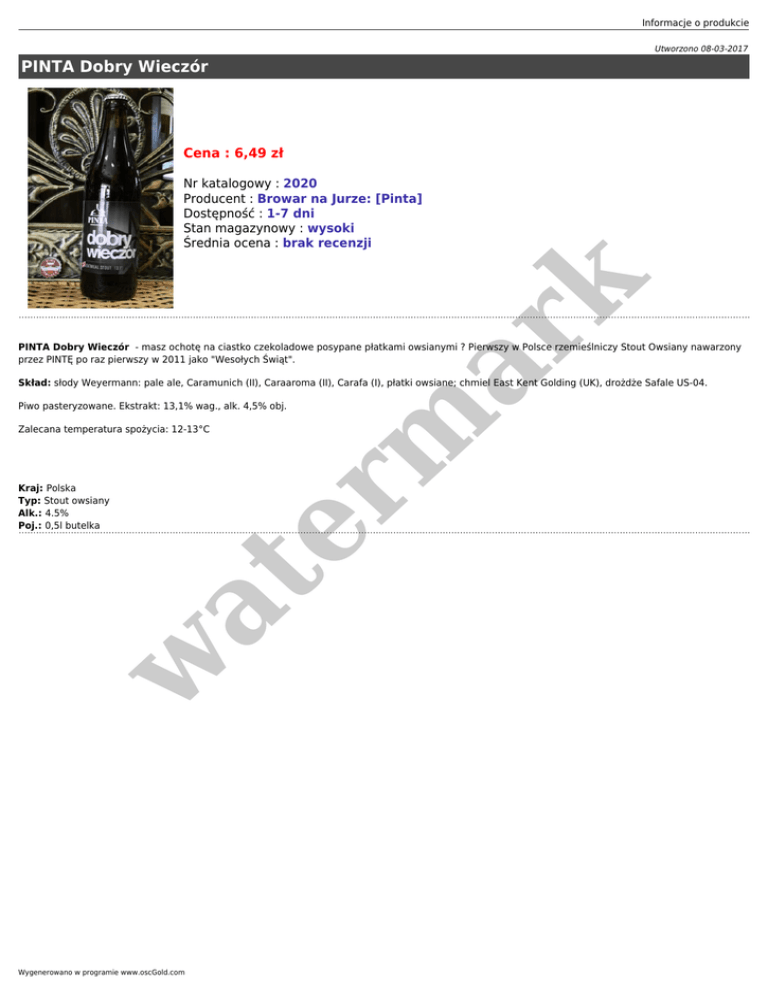 Informacje o produkcie Utworzono 08-03-2017 PINTA Dobry Wieczór Cena : 6,49 zł er m ar k Nr katalogowy : 2020 Producent : Browar na Jurze: [Pinta] Dostępność : 1-7 dni Stan magazynowy : wysoki Średnia ocena : brak recenzji PINTA Dobry Wieczór - masz ochotę na ciastko czekoladowe posypane płatkami owsianymi ? Pierwszy w Polsce rzemieślniczy Stout Owsiany nawarzony przez PINTĘ po raz pierwszy w 2011 jako "Wesołych Świąt". Skład: słody Weyermann: pale ale, Caramunich (II), Caraaroma (II), Carafa (I), płatki owsiane; chmiel East Kent Golding (UK), drożdże Safale US-04. Piwo pasteryzowane. Ekstrakt: 13,1% wag., alk. 4,5% obj. Zalecana temperatura spożycia: 12-13°C w at Kraj: Polska Typ: Stout owsiany Alk.: 4.5% Poj.: 0,5l butelka Wygenerowano w programie www.oscGold.com