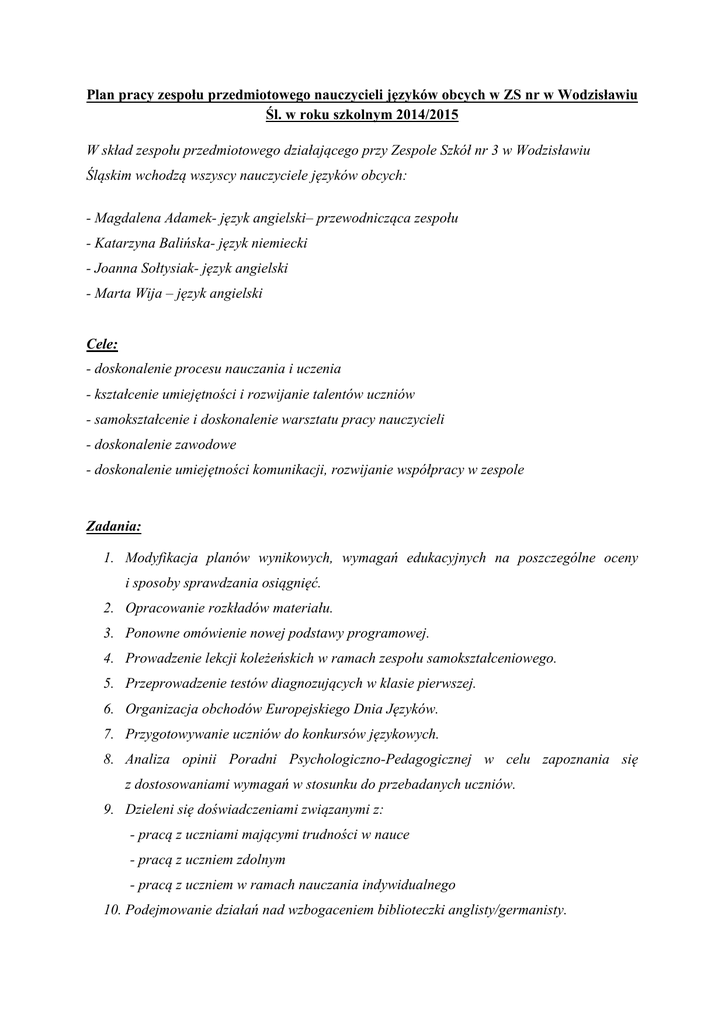 Plan pracy zespołu przedmiotowego nauczycieli języków obcych w ZS nr w Wodzisławiu Śl. w roku szkolnym 2014/2015 W skład zespołu przedmiotowego działającego przy Zespole Szkół nr 3 w Wodzisławiu Śląskim wchodzą wszyscy nauczyciele języków obcych: - Magdalena Adamek- język angielski– przewodnicząca zespołu - Katarzyna Balińska- język niemiecki - Joanna Sołtysiak- język angielski - Marta Wija – język angielski Cele: - doskonalenie procesu nauczania i uczenia - kształcenie umiejętności i rozwijanie talentów uczniów - samokształcenie i doskonalenie warsztatu pracy nauczycieli - doskonalenie zawodowe - doskonalenie umiejętności komunikacji, rozwijanie współpracy w zespole Zadania: 1. Modyfikacja planów wynikowych, wymagań edukacyjnych na poszczególne oceny i sposoby sprawdzania osiągnięć. 2. Opracowanie rozkładów materiału. 3. Ponowne omówienie nowej podstawy programowej. 4. Prowadzenie lekcji koleżeńskich w ramach zespołu samokształceniowego. 5. Przeprowadzenie testów diagnozujących w klasie pierwszej. 6. Organizacja obchodów Europejskiego Dnia Języków. 7. Przygotowywanie uczniów do konkursów językowych. 8. Analiza opinii Poradni Psychologiczno-Pedagogicznej w celu zapoznania się z dostosowaniami wymagań w stosunku do przebadanych uczniów. 9. Dzieleni się doświadczeniami związanymi z: - pracą z uczniami mającymi trudności w nauce - pracą z uczniem zdolnym - pracą z uczniem w ramach nauczania indywidualnego 10. Podejmowanie działań nad wzbogaceniem biblioteczki anglisty/germanisty. 11. Przeprowadzenie próbnych egzaminów gimnazjalnych (ogólnoszkolnych i wewnątrzklasowych), omawianie ich wyników i opracowanie wniosków do dalszej pracy. 12. Organizacja Ogólnopolskiego Konkursu Języka Angielskiego FOX pod patronatem Instytutu Filologii Angielskiej Uniwersytetu Jagiellońskiego w Krakowie. 13. Kontynuacja współpracy z PODN, II Liceum Ogólnokształcącym oraz Gimnazjum w Pszowie i organizacja II Powiatowego Konkursu Języka Angielskiego dla Gimnazjalistów w naszej szkole. 14. Przygotowanie przedstawienia w języku angielskim z okazji Dnia Otwartego szkoły 15. Organizacja II Międzyszkolnego Konkursu Czytelniczego z Języka Angielskiego dla uczniów klas VI SP „Let’s Read in English”. 16. Organizacja szkolnego konkursu czytelniczego z języka angielskiego dla uczniów gimnazjum. 17. Organizacja wyjazdu do Londynu w ramach warsztatów językowych. 18. Uczestniczenie w różnych formach doskonalenia zawodowego (konferencje, szkolenia, warsztaty). 19. Współpraca przy układaniu testów. 20. Podejmowanie działań nad wzbogaceniem klasopracowni w nowe pomoce dydaktyczne. 21. Realizacja z uczniami projekty edukacyjne. 22. Realizacja innowacji pedagogicznych „Z Wielką Brytanią za pan brat” oraz „SportowiecJęzykowiec” w grupach z rozszerzonym programem języka angielskiego.