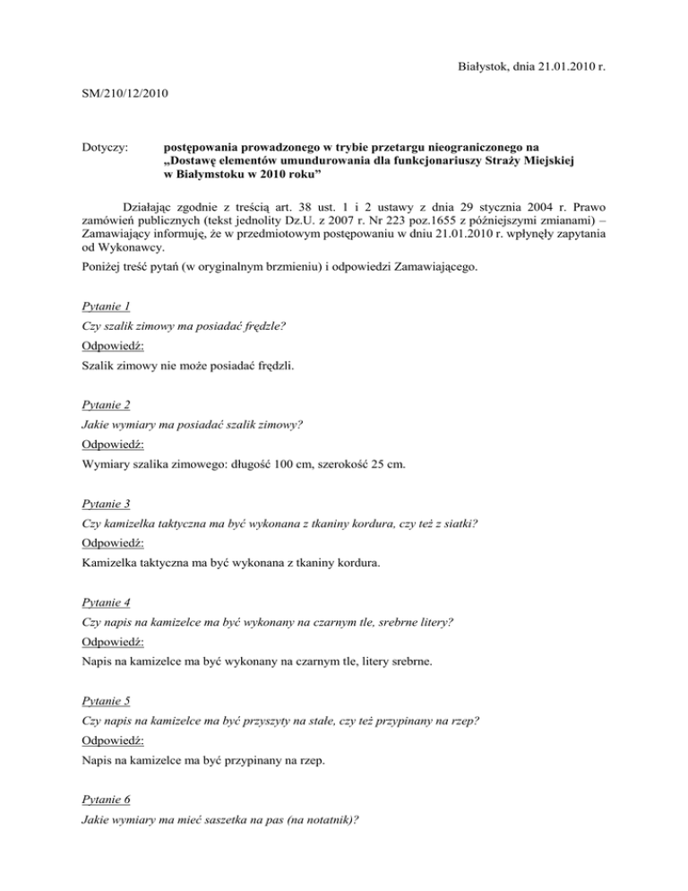 Białystok, dnia 21.01.2010 r. SM/210/12/2010 Dotyczy: postępowania prowadzonego w trybie przetargu nieograniczonego na „Dostawę elementów umundurowania dla funkcjonariuszy Straży Miejskiej w Białymstoku w 2010 roku” Działając zgodnie z treścią art. 38 ust. 1 i 2 ustawy z dnia 29 stycznia 2004 r. Prawo zamówień publicznych (tekst jednolity Dz.U. z 2007 r. Nr 223 poz.1655 z późniejszymi zmianami) – Zamawiający informuję, że w przedmiotowym postępowaniu w dniu 21.01.2010 r. wpłynęły zapytania od Wykonawcy. Poniżej treść pytań (w oryginalnym brzmieniu) i odpowiedzi Zamawiającego. Pytanie 1 Czy szalik zimowy ma posiadać frędzle? Odpowiedź: Szalik zimowy nie może posiadać frędzli. Pytanie 2 Jakie wymiary ma posiadać szalik zimowy? Odpowiedź: Wymiary szalika zimowego: długość 100 cm, szerokość 25 cm. Pytanie 3 Czy kamizelka taktyczna ma być wykonana z tkaniny kordura, czy też z siatki? Odpowiedź: Kamizelka taktyczna ma być wykonana z tkaniny kordura. Pytanie 4 Czy napis na kamizelce ma być wykonany na czarnym tle, srebrne litery? Odpowiedź: Napis na kamizelce ma być wykonany na czarnym tle, litery srebrne. Pytanie 5 Czy napis na kamizelce ma być przyszyty na stałe, czy też przypinany na rzep? Odpowiedź: Napis na kamizelce ma być przypinany na rzep. Pytanie 6 Jakie wymiary ma mieć saszetka na pas (na notatnik)? Odpowiedź: Wymiary saszetki na pas: wysokość 16 cm, szerokość 13 cm, głębokość 5 cm. Pytanie 7 Czy pasek do spodni ma mieć szerokość 30 mm? Odpowiedź: Pasek do spodni ma mieć szerokość 30 mm. Pytanie 8 Czy pasek do spodni ma być obustronnie w kolorze czarnym, tzn. od zewnętrznej i wewnętrznej strony? Odpowiedź: Pasek do spodni powinien być w kolorze czarnym po obu stronach. Pytanie 9 Z jakiego materiału ma być wykonany krawat bezpieczny? Odpowiedź: Krawat bezpieczny powinien być wykonany w 100% z poliestru. Pytanie 10 W jaki sposób ma być zapinany krawat bezpieczny? Odpowiedź: Krawat bezpieczny powinien być zapinany na klips. Pytanie 11 Jaką powinien mieć szerokość krawat bezpieczny? Odpowiedź: Szerokość krawata bezpiecznego w najszerszym miejscu – 7 cm. Pytanie 12 Czy Zamawiający dysponuje zdjęciami w/w wyrobów? Odpowiedź: Zamawiający nie dysponuje zdjęciami w/w wyrobów. Powyższe wyjaśnienia stanowią integralną część specyfikacji istotnych warunków zamówienia i są wiążące dla wszystkich Wykonawców. Komendant Straży Miejskiej w Białymstoku Krzysztof Kolenda