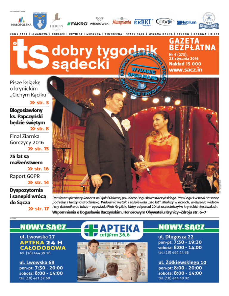 PARTNERZY WYDANIA OWA ZIM N O – TOLICA! AS W W WYDAN SPECJ IE ALNE G A Z E TA B E Z P Ł AT N A Nr 4 (273), 28 stycznia 2016 Nakład 15 000 www.sacz.in ANIE SPEC J YD Pisze książkę o krynickim „Cichym Kąciku” u” KRYN IC NE L A A NOWY SĄCZ | LIMANOWA | GORLICE | KRYNICA | MUSZYNA | PIWNICZNA | STARY SĄCZ | MSZANA DOLNA | GRYBÓW | BOBOWA | BIECZ L str. 3 Błogosławiony ks. Papczyński będzie świętym L str. 8 Finał Ziarnka Gorczycy 2016 L str. 13 75 lat są małżeństwem L str. 16 Dyspozytornia i sanepid wrócą do Sącza L str. 17 REKLAMA FOT. PIOTR GRYŹLAK Raport GOPR L str. 14 Pamiętam pierwszy koncert w Pijalni Głównej po udarze Bogusława Kaczyńskiego. Pan Boguś wszedł na scenę pod rękę z Grażyną Brodzińską. Widownia wstała i zaśpiewała „Sto lat”. Miał łzy w oczach, większość widzów i my dziennikarze także - opowiada Piotr Gryźlak, który od ponad 20 lat uczestniczył w krynickich festiwalach. Wspomnienia o Bogusławie Kaczyńskim, Honorowym Obywatelu Krynicy-Zdroju str. 6-7 www.sacz.in – Twój tygodnik codziennie | DOBRY TYGODNIK SĄDECKI 28 stycznia 2016 2 Z drugiej strony KRYNICA CZWARTEK PIĄTEK SOBOTA NIEDZIELA PONIEDZIAŁEK WTOREK ŚRODA DZIEŃ 10 6 5 7 8 7 7 NOC 5 2 1 2 1 1 2 Żródło: pogodynka.pl, IMiGW TYGODNIÓWKA MARKA STAWOWCZYKA KONKURS Bilety na Skaldów Mamy dla Czytelników dwie podwójne wejściówki na koncert Skaldów w Pijalni-Głównej w Krynicy na godz. 19. w niedzielę 30 stycznia. Wystarczy do piątku do godz. 9. na adres: [email protected] przysłać swoje imię, nazwisko i nr telefonu w temacie wpisując SKALDOWIE. Z wylosowanymi osobami skontaktujemy się telefonicznie. Więcej konkursów znajdziecie na naszym profilu na FB. (J) ZNAJDZIESZ NAS NA REKLAMA LEKTURA NA FERIE Halifax z Wojnarowej Nocą 4/5 sierpnia 1944 r. między Wojnarową a Niecwią w gminie Korzenna, podczas powrotu z operacji zrzutu zaopatrzenia dla Armii Krajowej, został zestrzelony samolot JP-162 „S” ze 148 Dywizjonu RAF. Trzech członków brytyjsko-kanadyjskiej załogi, z kpt. Jamesem McCallem zginęło w płonącym wraku, czterech uratowało się na spadochronach. Schronienia udzieliła im z narażeniem życia miejscowa ludność. Ocaleni ukrywali się w ziemiance u „Ciotki z lasu” - Kunegundy Matusik w Łyczanej, a następnie dołączyli do partyzantów Ludowej Straży Bezpieczeństwa Wojciecha Janczyka „Kosy” i Armii Krajowej. Za tłumacza służył Franciszek Apryasz, który przed wojną wrócił z Ameryki i znał język angielski. Lotnicy szczęśliwie doczekali końca wojny i w kwietniu 1945 r. powrócili do Wielkiej Brytanii i Kanady ku wielkiej radości rodzin, które uważały ich za zabitych. Poległych pochowano obok szosy do Wojnarowej, w pobliżu figury Matki Boskiej, w trumnach wykonanych przez stolarza Wojciecha Taraska. Do późnej jesieni grób strojono kwiatami, co kłuło w oczy żandarmerię niemiecką. Po ekshumacji spoczęli oni w brytyjskiej kwaterze wojskowej na cmentarzu Rakowickim w Krakowie. W 2010 r. wydobyte szczątki samolotu trafiły do krakowskiego Muzeum AK w Krakowie. Po wojnie niektóre elementy z samolotu ludzie wykorzystywali w gospodarstwach, robiąc z nierdzewnej, aluminiowej blachy np. brytfanki i części do maszyn. Historie „naszego” Halifaxa przybliża w książce wydanej w grudniu 2015 r. przez Gminną Bibliotekę Publiczną w Korzennej Wojciech Krajewski, wybitny znawca tematu, kustosz Muzeum Wojska Polskiego w Warszawie, archeolog lotniczy, zajmujący się od lat wyjaśnianiem losów zestrzelonych samolotów i ich załóg. Autor oparł się nie tylko na materiałach archiwalnych i partyzanckich wspomnieniach, ale także na nowych, nieznanych dotąd relacjach żyjących świadków tamtych wydarzeń, do których dotarł w trakcie prowadzonych poszukiwań, m.in. Jana Susa, Marii Ćwik, Aleksandry i Bronisława Kraconiów, Jana Bulandy, Jana Miki, rodziny Łukasików. Ustalił także, że Halifaxa zestrzelił as niemieckiego lotnictwa feldwebel Helmut Konter, mający na koncie 20 zestrzelonych samolotów. Zginął on nad Frankfurtem n. Odrą w marcu 1945 r. W książce obszernie cytowane są też po raz pierwszy udostępnione w języku polskim relacje ocalałych Anglików. (LEŚ) Wydawca: Wydawnictwo DOBRE Sp. z o.o. 33–300 Nowy Sącz, ul. Żywiecka 25. ISSN 2082–209X. Redakcja: „Dobry Tygodnik Sądecki”, tel.18 544 64 41, [email protected] Redaktor naczelny: Wojciech Molendowicz [email protected]. Zastępca redaktora naczelnego: Jolanta Bugajska, [email protected] Redaktor senior: Jerzy Wideł Redaktor naczelny portalu sacz.in: Jakub Toporkiewicz, [email protected] Dyrektor Biura Reklam i Ogłoszeń: Irena Legutko, [email protected], tel. 785 340 410 Biuro Reklam i Ogłoszeń: Beata Ziemba, [email protected], tel.889 020 766 Koordynator Biura Wydawnictwa: Bożena Baran, [email protected], tel.721 066 993. Dyrektor ds. kolportażu: Mateusz Węglowski-Król , tel. 665 270 230. Skład: Piotr Płachta, tel.602522291 Druk: Polska Press Grupa Oddział Poligrafia Drukarnia Sosnowiec. CZY WIESZ, ŻE… Krynica miewała swoje prawdziwe katastrofy? 22 maja 1930 r. w centrum Krynicy doszło do katastrofy lotniczej. Nieopodal obecnego sanatorium kolejowego (dzisiaj ul. Ebersa) rozbił się samolot SPAD 61C1 pilotowany przez mjr. Witolda Prosińskiego. Maszyna należała do 122 Eskadry Myśliwskiej, wchodzącej w skład 2. Pułku Lotniczego w Krakowie. Pilot przeżył katastrofę. Z kolei 1 marca 1993 r. w okolicach Krynicy zadrżała ziemia. Po wstrząsie, mającym siłę 4,5 stopnia w skali Richtera, nastąpiły kolejne nieco słabsze. Epicentrum tego niezwykłego u nas zjawiska znajdowało się w trójkącie: Tylicz – Uście Gorlickie – Wysowa. Było to jedno z najsilniejszych trzęsień ziemi na Sądecczyźnie. (ICZ) KRYN IC NE A AL Moja Krynica TOLICA! AS W W 28 stycznia 2016 DOBRY TYGODNIK SĄDECKI | Twój tygodnik codziennie – www.sacz.in OWA ZIM O –N 3 WYDAN SPECJ IE