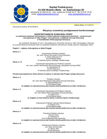 Szpital Pediatryczny 43-300 Bielsko-Biała ul. Sobieskiego 83 sekretariat 33 828 40 40 zam. publiczne 33 828 40 47 fax 33 815 16 30 www.szpitalpediatryczny.pl email: [email protected] Bielsko-Biała, 12.12.2014 r. Oznaczenie sprawy: ZP-M-39/2014 Wszyscy uczestnicy postępowania konkursowego ROZSTRZYGNIĘCIE KONKURSU OFERT na udzielanie świadczeń zdrowotnych w ramach dyŜurów medycznych lekarskich – stacjonarnych chirurgicznych w Izbie Przyjęć / chirurgicznych w Oddziale Chirurgii Dziecięcej z Pododdziałem Otolaryngologii Dziecięcej Na podstawie Rozdziału XV pkt 3 Szczegółowych Warunków Konkursu Ofert Zamawiający informuje, Ŝe w przedmiotowym Konkursie Ofert na udzielanie świadczeń zdrowotnych zostały wybrane następujące oferty: Części I – dyŜury chirurgiczne w Izbie Przyjęć Oferta nr 1 Indywidualna Praktyka Lekarska lek. med. Henryk Zborowski Chirurg Dziecięcy ul. Doliny Miętusiej 3/17 43-316 Bielsko-Biała W zakresie dyŜuru zwykłego i świątecznego Oferta nr 14 Indywidualna Specjalistyczna Praktyka Lekarska lek. med. Jolanta Jakubowska chirurg dziecięcy, specjalista neurolog FEBC Ul. Wyzwolenia 75 43-365 Wilkowice W zakresie dyŜuru zwykłego i świątecznego PoniŜej wyszczególnione oferty złoŜone na dyŜury w zakresie Izby Przyjęć zostają odrzucone: Oferta nr 3 Praktyka Lekarska lek. med. Ewa Wiśniewska Specjalista Chirurgii Dziecięcej Ul. Starzyńskiego 9/10 43-300 Bielsko-Biała ze względu na zaproponowaną zbyt wysoką stawkę godzinową za dyŜur świąteczny Oferta nr 4 Indywidualna Specjalistyczna Praktyka Lekarska lek. med. Beata Zapart Specjalista Chirurg Dziecięcy ul. Zapora 23 f 43-300 Bielsko-Biała ze względu na bark złoŜenia oferty w zakresie dyŜuru świątecznego Oferta nr 6 Indywidualna Praktyka Lekarska Michał MojŜesz Ul. Kolista 41/12 43-300 Bielsko-Biała ze względu na zaproponowaną zbyt wysoką stawkę godzinową za dyŜur świąteczny Oferta nr 7 Prywatna Praktyka Lekarska Henryk Cnota Ul. StraŜacka 4 34-312 Międzybrodzie śywieckie ze względu na zaproponowaną zbyt wysoką stawkę godzinową za dyŜur świąteczny Oferta nr 8 Indywidualna Praktyka Lekarska Lek. Marta Bunarowska Ul. Rolna 18i/4 40-555 Katowice ze względu na zaproponowaną zbyt wysoką stawkę godzinową za dyŜur świąteczny Oferta nr 9 Łukasz Toruński ul. Urodzajna 1A/19 43-300 Bielsko-Biała ze względu na zaproponowaną zbyt wysoką stawkę godzinową za dyŜur świąteczny Oferta nr 10 Indywidualna Praktyka Lekarska Lek. Michał Głowacki Ul. PodchorąŜych 13/24 43-300 Bielsko-Biała ze względu na zaproponowaną zbyt wysoką stawkę godzinową za dyŜur świąteczny Oferta nr 12 Indywidualna Praktyka Lekarska lek. med. Rafał Pach Ul. Południowa 19/62 34-300 śywiec ze względu na zaproponowaną zbyt wysoką stawkę godzinową za dyŜur świąteczny Oferta nr 13 NZOZ MED HD Sp. z o. o. Ul. B. Świerczyny1 41-400 Mysłowice ze względu na zaproponowaną zbyt wysoką stawkę godzinową za dyŜur świąteczny Części II – dyŜury chirurgiczne w Oddziale Chirurgii Dziecięcej z Pododdziałem Otolaryngologii Dziecięcej Oferta nr 14 Indywidualna Specjalistyczna Praktyka Lekarska Lek. med. Jolanta Jakubowska chirurg dziecięcy, specjalista neurolog FEBC Ul. Wyzwolenia 75 43-365 Wilkowice W zakresie dyŜuru zwykłego i świątecznego PoniŜej wyszczególnione oferty złoŜone na dyŜury pełnione w Oddziale Chirurgii Dziecięcej z Pododdziałem Otolaryngologii Dziecięcej zostają odrzucone: Oferta nr 2 Praktyka Lekarska lek. med. Jacek Wiśniewski Specjalista Chirurgii Dziecięcej Ul. Starzyńskiego 9/10 43-300 Bielsko-Biała ze względu na zaproponowaną zbyt wysoką stawkę godzinową za dyŜur świąteczny Oferta nr 3 Praktyka Lekarska lek. med. Ewa Wiśniewska Specjalista Chirurgii Dziecięcej Ul. Starzyńskiego 9/10 43-300 Bielsko-Biała ze względu na zaproponowaną zbyt wysoką stawkę godzinową za dyŜur świąteczny Oferta nr 4 Indywidualna Specjalistyczna Praktyka Lekarska lek. med. Beata Zapart Specjalista Chirurg Dziecięcy ul. Zapora 23 f 43-300 Bielsko-Biała ze względu na bark złoŜenia oferty w zakresie dyŜuru świątecznego Oferta nr 5 Specjalistyczna Praktyka Lekarska Jacek Korzonkiewicz Ul. Kolibrów 6 43-300 Bielsko-Biała ze względu na zaproponowaną zbyt wysoką stawkę godzinową za dyŜur świąteczny Oferta nr 8 Indywidualna Praktyka Lekarska Lek. Marta Bunarowska Ul. Rolna 18i/4 40-555 Katowice ze względu na zaproponowaną zbyt wysoką stawkę godzinową za dyŜur świąteczny Oferta nr 11 Indywidualna Specjalistyczna Praktyka Lekarska lek. med. Mirosław HaręŜlak Ul. Łąkowa 18 43-300 Bielsko-Biała ze względu na zaproponowaną zbyt wysoką stawkę godzinową za dyŜur świąteczny Oferta nr 12 Indywidualna Praktyka Lekarska lek. med. Rafał Pach Ul. Południowa 19/62 34-300 śywiec ze względu na zaproponowaną zbyt wysoką stawkę godzinową za dyŜur świąteczny Oferta nr 13 NZOZ MED HD Sp. z o. o. Ul. B. Świerczyny1 41-400 Mysłowice ze względu na zaproponowaną zbyt wysoką stawkę godzinową za dyŜur świąteczny Z powaŜaniem: Dyrektor Szpitala Pediatrycznego lek. med. Ryszard Odrzywołek