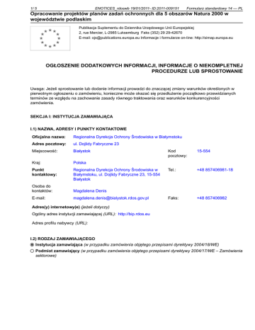 1/ 5 ENOTICES_rdoswb 19/01/2011- ID:2011-009151 Formularz standardowy 14 — PL Opracowanie projektów planów zadań ochronnych dla 5 obszarów Natura 2000 w województwie podlaskim Publikacja Suplementu do Dziennika Urzędowego Unii Europejskiej 2, rue Mercier, L-2985 Luksemburg Faks (352) 29 29-42670 E-mail: [email protected] Informacje i formularze on-line: http://simap.europa.eu OGŁOSZENIE DODATKOWYCH INFORMACJI, INFORMACJE O NIEKOMPLETNEJ PROCEDURZE LUB SPROSTOWANIE Uwaga: Jeżeli sprostowanie lub dodanie informacji prowadzi do znaczącej zmiany warunków określonych w pierwotnym ogłoszeniu o zamówieniu, konieczne może okazać się przedłużenie początkowo przewidzianych terminów ze względu na zachowanie zasady równego traktowania oraz warunków konkurencyjności zamówienia. SEKCJA I: INSTYTUCJA ZAMAWIAJĄCA I.1) NAZWA, ADRESY I PUNKTY KONTAKTOWE Oficjalna nazwa: Regionalna Dyrekcja Ochrony Środowiska w Białymstoku Adres pocztowy: ul. Dojlidy Fabryczne 23 Miejscowość: Białystok Kraj: Polska Punkt kontaktowy: Regionalna Dyrekcja Ochrony Środowiska w Białymstoku, ul. Dojlidy Fabryczne 23, 15-554 Białystok Osoba do kontaktów: Magdalena Denis E-mail: [email protected] Kod pocztowy: 15-554 Tel.: +48 857406981-18 Faks: +48 857406982 Adres(y) internetowy(e) (jeżeli dotyczy) Ogólny adres instytucji zamawiającej (URL): http://bip.rdos.eu Adres profilu nabywcy (URL): I.2) RODZAJ ZAMAWIAJĄCEGO Instytucja zamawiająca (w przypadku zamówienia objętego przepisami dyrektywy 2004/18/WE) Podmiot zamawiający (w przypadku zamówienia objętego przepisami dyrektywy 2004/17/WE – Zamówienia sektorowe) 2/ 5 ENOTICES_rdoswb 19/01/2011- ID:2011-009151 Formularz standardowy 14 — PL Opracowanie projektów planów zadań ochronnych dla 5 obszarów Natura 2000 w województwie podlaskim SEKCJA II: PRZEDMIOT ZAMÓWIENIA II.1) OPIS II.1.1) Nazwa nadana zamówieniu przez instytucję zamawiającą (podano w pierwotnym ogłoszeniu) Opracowanie projektów planów zadań ochronnych dla 5 obszarów Natura 2000 w województwie podlaskim II.1.2) Krôtki opis (podano w pierwotnym ogłoszeniu) Przedmiotem zamówienia jest opracowanie projektów planów zadań ochronnych dla 5 obszarów Natura 2000 w województwie podlaskim: OSO Dolina Górnej Narwi, SOO Ostoja w Dolinie Górnej Narwi, SOO Schrony Brzeskiego Rejonu Umocnionego, SOO Ostoja Suwalska i SOO Jeleniewo II.1.3) Wspólny Słownik Zamówień (CPV) (podano w pierwotnym ogłoszeniu) Słownik główny Główny przedmiot 90700000 Słownik uzupełniający (jeżeli dotyczy) 3/ 5 ENOTICES_rdoswb 19/01/2011- ID:2011-009151 Formularz standardowy 14 — PL Opracowanie projektów planów zadań ochronnych dla 5 obszarów Natura 2000 w województwie podlaskim SEKCJA IV: PROCEDURA IV.1) RODZAJ PROCEDURY IV.1.1) Rodzaj procedury (podano w pierwotnym ogłoszeniu) Otwarta Ograniczona Ograniczona przyspieszona Negocjacyjna Negocjacyjna przyspieszona Dialog konkurencyjny IV.2) INFORMACJE ADMINISTRACYJNE IV.2.1) Numer referencyjny nadany sprawie przez instytucję zamawiającą /podmiot zamawiający (podano w pierwotnym ogłoszeniu, o ile dotyczy) RDOŚ-20-WOF-3231-07/10/md IV.2.2) Dane referencyjne ogłoszenia w przypadku ogłoszeń przesłanych drogą elektroniczną (jeżeli są znane): Pierwotne ogłoszenie przesłane przez: SIMAP OJS eSender Login: ENOTICES_rdoswb Dane referencyjne ogłoszenia: 2010-169655 (rok i numer dokumentu) IV.2.3) Ogłoszenie, którego dotyczy niniejsza publikacja (jeżeli dotyczy) Numer ogłoszenia w Dz.U.: 2010/S 248-379764 z dnia 22/12/2010 IV.2.4) Data wysłania niniejszego ogłoszenia: 20/12/2010 (dd/mm/rrrr) (dd/mm/rrrr) 4/ 5 ENOTICES_rdoswb 19/01/2011- ID:2011-009151 Formularz standardowy 14 — PL Opracowanie projektów planów zadań ochronnych dla 5 obszarów Natura 2000 w województwie podlaskim SEKCJA VI: INFORMACJE UZUPEŁNIAJĄCE VI.1) OGŁOSZENIE DOTYCZY (o ile ma zastosowanie; zaznaczyć tyle punktów, ile jest to konieczne) Procedury niepełnej Sprostowania Informacji dodatkowych VI.2) INFORMACJE NA TEMAT NIEPEŁNEJ PROCEDURY UDZIELENIA ZAMÓWIENIA (o ile ma zastosowanie; zaznaczyć tyle punktów, ile jest to konieczne) Postępowanie o udzielenie zamówienia została przerwane. Postępowanie o udzielenie zamówienia uznano za nieskuteczne. Zamówienia nie udzielono. Zamówienie może być przedmiotem ponownej publikacji. VI.3) INFORMACJE DO POPRAWIENIA LUB DODANIA (o ile dotyczy; należy określić miejsce, w którym tekst lub daty mają być zmienione lub dodane, proszę zawsze podawać odpowiedni numer sekcji i akapitu pierwotnego ogłoszenia) VI.3.1) Zmiana oryginalnej informacji lub publikacja w witrynie TED niezgodna z oryginalnymi informacjami. Zmiana oryginalnej informacji podanej przez instytucję zamawiającą Publikacja w witrynie TED niezgodna z oryginalną informacją, przekazaną przez instytucję zamawiającą W obu przypadkach VI.3.2) Ogłoszenie lub odpowiednia dokumentacja przetargowa W ogłoszeniu pierwotnym W odpowiedniej dokumentacji przetargowej (więcej informacji w odpowiedniej dokumentacji przetargowej) W obu przypadkach (więcej informacji w odpowiedniej dokumentacji przetargowej) VI.3.3) Tekst, który należy poprawić w pierwotnym ogłoszeniu (jeżeli dotyczy) Miejsce, w którym znajduje się zmieniany tekst: Zamiast: Powinno być: _____ _____ _____ VI.3.4) Daty, które należy poprawić w pierwotnym ogłoszeniu (jeżeli dotyczy) Miejsce, w którym znajdują się zmieniane daty: Zamiast: Powinno być: (dd/mm/rrrr) (gg:mm) (dd/mm/rrrr) (gg:mm) IV.3.4) Termin składania ofert lub wniosków o dopuszczenie do udziału w postępowaniu 31/01/2011 12:00 07/02/2011 12:00 IV. 3.8) Warunki otwarcia ofert 31/01/2011 12:30 07/02/2011 12:30 5/ 5 ENOTICES_rdoswb 19/01/2011- ID:2011-009151 Formularz standardowy 14 — PL Opracowanie projektów planów zadań ochronnych dla 5 obszarów Natura 2000 w województwie podlaskim VI.3.5) Adresy i punkty kontaktowe, które należy poprawić (jeżeli dotyczy