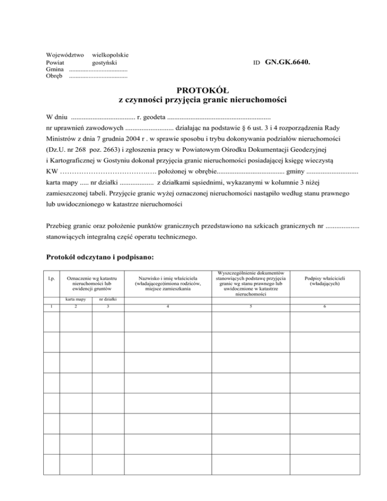 Województwo wielkopolskie Powiat gostyński Gmina .................................... Obręb .................................... ID GN.GK.6640. PROTOKÓŁ z czynności przyjęcia granic nieruchomości W dniu .................................... r. geodeta .......................................................... nr uprawnień zawodowych ........................... działając na podstawie § 6 ust. 3 i 4 rozporządzenia Rady Ministrów z dnia 7 grudnia 2004 r . w sprawie sposobu i trybu dokonywania podziałów nieruchomości (Dz.U. nr 268 poz. 2663) i zgłoszenia pracy w Powiatowym Ośrodku Dokumentacji Geodezyjnej i Kartograficznej w Gostyniu dokonał przyjęcia granic nieruchomości posiadającej księgę wieczystą KW ……………………………….…. położonej w obrębie...................................... gminy ............................. karta mapy ..... nr działki ................... z działkami sąsiednimi, wykazanymi w kolumnie 3 niżej zamieszczonej tabeli. Przyjęcie granic wyżej oznaczonej nieruchomości nastąpiło według stanu prawnego lub uwidocznionego w katastrze nieruchomości Przebieg granic oraz położenie punktów granicznych przedstawiono na szkicach granicznych nr ................... stanowiących integralną część operatu technicznego. Protokół odczytano i podpisano: l.p. 1 Oznaczenie wg katastru nieruchomości lub ewidencji gruntów karta mapy nr działki 2 3 Nazwisko i imię właściciela (władającego)imiona rodziców, miejsce zamieszkania Wyszczególnienie dokumentów stanowiących podstawę przyjęcia granic wg stanu prawnego lub uwidocznione w katastrze nieruchomości 4 5 Podpisy właścicieli (władających) 6 Mimo zawiadomienia nie stawili się .................................................................................................. ............................................................................................................................................................. Opis przyjęcia granic nieruchomości: ................................................................................................................................................................ ................................................................................................................................................................ ................................................................................................................................................................ ................................................................................................................................................................ ................................................................................................................................................................ ................................................................................................................................................................ ................................................................................................................................................................ ........................................................................................................................................................... ...................................... Pieczęć i podpis geodety
