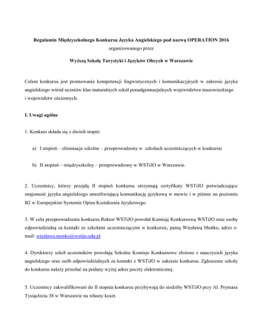 Regulamin Międzyszkolnego Konkursu Języka Angielskiego pod nazwą OPERATION 2016 organizowanego przez Wyższą Szkołę Turystyki i Języków Obcych w Warszawie Celem konkursu jest promowanie kompetencji lingwistycznych i komunikacyjnych w zakresie języka angielskiego wśród uczniów klas maturalnych szkół ponadgimnazjalnych województwa mazowieckiego i województw ościennych. I. Uwagi ogólne 1. Konkurs składa się z dwóch stopni: a) I stopień – eliminacje szkolne – przeprowadzony w szkołach uczestniczących w konkursie b) II stopień – międzyszkolny – przeprowadzony w WSTiJO w Warszawie. 2. Uczestnicy, którzy przejdą II stopień konkursu otrzymają certyfikaty WSTiJO poświadczające znajomość języka angielskiego umożliwiającą komunikację językową w mowie i w piśmie na poziomie B2 w Europejskim Systemie Opisu Kształcenia Językowego. 3. W celu przeprowadzenia konkursu Rektor WSTiJO powołał Komisję Konkursową WSTiJO oraz osobę odpowiedzialną za kontakt ze szkołami uczestniczącymi w konkursie, panią Wiesławą Mońko, adres email: [email protected] 4. Dyrektorzy szkół uczestników powołają Szkolne Komisje Konkursowe złożone z nauczycieli języka angielskiego oraz osób odpowiedzialnych za kontakt z WSTiJO w zakresie konkursu. Zgłoszenie szkoły do konkursu należy przesłać na podany wyżej adres poczty elektronicznej. 5. Uczestnicy zakwalifikowani do II stopnia konkursu przybywają do siedziby WSTiJO przy Al. Prymasa Tysiąclecia 38 w Warszawie na własny koszt. II. Organizacja i przebieg eliminacji szkolnych – stopień I 1. Dyrektorzy szkół biorących udział w konkursie powołają Szkolne Komisje Konkursowe, a nauczyciele języka angielskiego zbiorą od uczniów klas maturalnych deklaracje (ustne) przystąpienia do konkursu. Zgłoszenia do konkursu zostaną przesłane pocztą elektroniczną do WSTiJO do dnia 25.02.2016 r. 2. Zgłoszenia do konkursu zawierać będą: - dane szkoły - liczbę uczestników - zastrzeżony adres poczty e-mail do korespondencji z WSTiJO. 3. WSTiJO prześle do szkół pocztą elektroniczną regulamin konkursu w dniu 15.02.2016 r. 4. I stopień konkursu będzie miał formę testu pisemnego, z zadaniami gramatyczno-leksykalnymi oraz na czytanie ze zrozumieniem, obejmującego takie obszary tematyczne, jak szeroko pojęte zagadnienia z zakresu równouprawnienia kobiet i mężczyzn, przemoc w pracy, rodzinie i życiu społecznym, dyskryminacja płci i dyskryminacja płciowa, dostęp do rynku pracy, itp. Do dnia 09.03.2016 r. WSTiJO prześle na podane adresy poczty e-mail test I stopnia wraz z kluczem odpowiedzi (wyłącznie do użytku Szkolnej Komisji Konkursowej) i formularzem sprawozdawczym. 5. Eliminacje szkolne (I stopień) zostaną przeprowadzone 10.03.2016 r. W tym dniu Szkolne Komisje Konkursowe powielą test konkursowy w liczbie odpowiadającej liczbie uczestników, zachowując reguły poufności, oraz przeprowadzą test I stopnia o godz. 11.00. Czas przeznaczony na rozwiązanie testu: 90 minut. 6. Testy I stopnia sprawdzą Szkolne Komisje Konkursowe, które wypełnią przesłane formularze sprawozdawcze. Do dnia 15 marca 2016 r. WSTiJO otrzyma pocztą elektroniczną wyniki eliminacji szkolnych z danymi szkoły i uczestników oraz liczbą punktów zdobytych przez nich w teście. 7. Dokumentację konkursową, tj. rozwiązane testy I stopnia oraz formularz sprawozdawczy z podpisami członków komisji Szkolna Komisja Konkursowa przechowa do końca roku szkolnego 2015/2016. 8. Do II stopnia konkursu – międzyszkolnego – zakwalifikowani zostaną zwycięscy I etapu z każdej szkoły uczestniczącej w konkursie oraz ci uczestnicy, którzy przeszli kwalifikację do II stopnia. Punktowy próg kwalifikacji do II stopnia ustali Komisja Konkursowa WSTiJO na podstawie wyników uzyskanych przez uczestników, przesłanych w sprawozdaniach. Listy uczestników zaproszonych do etapu międzyszkolnego zostaną przesłane do szkół do dnia 17 marca 2016 r. włącznie. III. Organizacja i przebieg konkursu międzyszkolnego – stopień II 1. Stopień II konkursu odbędzie się w dniu 31 marca 2016 r. o godz. 10.00 w siedzibie WSTiJO w Warszawie i będzie polegał na rozmowie ustnej w języku angielskim z udziałem 2 lub więcej uczestników II etapu jednocześnie. Oceniana będzie biegłość w posługiwaniu się językiem angielskim w wypowiedzi i rozmowie na zadany temat. Oceniane będą wyłącznie osoby mówiące, potrafiące zaprezentować swoje możliwości; odpowiedzi zdawkowe, krótkie, parowyrazowe nie zapewnią pozytywnej oceny wystąpienia. Przyjmuje się, że każdy uczestnik II stopnia konkursu jest zobligowany do ciągłej wypowiedzi w języku angielskim trwającej co najmniej 0,5 min. 2. Przejście II stopnia konkursu zapewni uzyskanie co najmniej 6 punktów w 10-punktowej skali oceny. Osoby, które pomyślnie zakończą udział w II stopniu uznane będą za zwycięzców konkursu. 3. WSTiJO prześle końcowe wyniki do szkół, z których pochodzić będą zwycięzcy konkursu do dnia 5 kwietnia 2015 r. 4. Spośród zwycięzców konkursu wyłonionych zostanie 10 laureatów, którzy zostaną nagrodzeni i wyróżnieni na ceremonii wręczenia nagród. V. Postanowienia końcowe 1. Z chwilą przystąpienia do konkursu uczestnicy akceptują zasady zawarte w niniejszym regulaminie. 2. Prace konkursowe nie podlegają zwrotowi. 3. Regulamin konkursu będzie dostępny na stronie internetowej WSTiJO. 4. Osoby zgłaszające się do konkursu wyrażają zgodę na przetwarzanie ich danych osobowych do celów konkursowych. 5. Osoby nagrodzone oraz ich opiekunowie – nauczyciele wyrażają zgodę na zamieszczenie swojego imienia i nazwiska oraz danych szkoły na stronie internetowej organizatora. 6. W sprawach nieuregulowanych w niniejszym regulaminie decyzje podejmują organizatorzy konkursu.