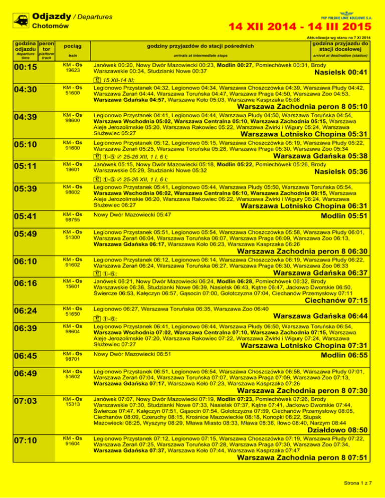 ^ Odjazdy / Departures 14 XII 2014 - 14 III 2015 Chotomów Aktualizacja wg stanu na 7 XI 2014 godzina peron odjazdu tor departure time platform track pociąg godziny przyjazdów do stacji pośrednich godzina przyjazdu do stacji docelowej train arrivals at intermediate stops arrival at destination (station) 00:15 KM - Os 19623 04:30 KM - Os 51600 Legionowo Przystanek 04:32, Legionowo 04:34, Warszawa Choszczówka 04:39, Warszawa Płudy 04:42, Warszawa Żerań 04:44, Warszawa Toruńska 04:47, Warszawa Praga 04:50, Warszawa Zoo 04:53, Warszawa Gdańska 04:57, Warszawa Koło 05:03, Warszawa Kasprzaka 05:06 04:39 KM - Os 98600 Legionowo Przystanek 04:41, Legionowo 04:44, Warszawa Płudy 04:50, Warszawa Toruńska 04:54, Warszawa Wschodnia 05:02, Warszawa Centralna 05:10, Warszawa Zachodnia 05:15, Warszawa Aleje Jerozolimskie 05:20, Warszawa Rakowiec 05:22, Warszawa Żwirki i Wigury 05:24, Warszawa Służewiec 05:27 Warszawa Lotnisko Chopina 05:31 05:10 KM - Os 91600 05:11 KM - Os 19601 Legionowo Przystanek 05:12, Legionowo 05:15, Warszawa Choszczówka 05:19, Warszawa Płudy 05:22, Warszawa Żerań 05:25, Warszawa Toruńska 05:28, Warszawa Praga 05:30, Warszawa Zoo 05:34 Warszawa Gdańska 05:38 ~ 1-5 / 25-26 XII, 1 I, 6 I; Janówek 05:15, Nowy Dwór Mazowiecki 05:18, Modlin 05:22, Pomiechówek 05:26, Brody Warszawskie 05:29, Studzianki Nowe 05:32 Nasielsk 05:36 05:39 KM - Os 98602 Legionowo Przystanek 05:41, Legionowo 05:44, Warszawa Płudy 05:50, Warszawa Toruńska 05:54, Warszawa Wschodnia 06:02, Warszawa Centralna 06:10, Warszawa Zachodnia 06:15, Warszawa Aleje Jerozolimskie 06:20, Warszawa Rakowiec 06:22, Warszawa Żwirki i Wigury 06:24, Warszawa Służewiec 06:27 Warszawa Lotnisko Chopina 06:31 05:41 KM - Os 98755 Nowy Dwór Mazowiecki 05:47 05:49 KM - Os 51300 Legionowo Przystanek 05:51, Legionowo 05:54, Warszawa Choszczówka 05:58, Warszawa Płudy 06:01, Warszawa Żerań 06:04, Warszawa Toruńska 06:07, Warszawa Praga 06:09, Warszawa Zoo 06:13, Warszawa Gdańska 06:17, Warszawa Koło 06:23, Warszawa Kasprzaka 06:26 06:10 KM - Os 91602 06:16 KM - Os 15601 Legionowo Przystanek 06:12, Legionowo 06:14, Warszawa Choszczówka 06:19, Warszawa Płudy 06:22, Warszawa Żerań 06:24, Warszawa Toruńska 06:27, Warszawa Praga 06:30, Warszawa Zoo 06:33 Warszawa Gdańska 06:37 ~ 1-6; Janówek 06:21, Nowy Dwór Mazowiecki 06:24, Modlin 06:28, Pomiechówek 06:32, Brody Warszawskie 06:36, Studzianki Nowe 06:39, Nasielsk 06:43, Kątne 06:47, Jackowo Dworskie 06:50, Świercze 06:53, Kałęczyn 06:57, Gąsocin 07:00, Gołotczyzna 07:04, Ciechanów Przemysłowy 07:11 06:24 KM - Os 51650 Legionowo 06:27, Warszawa Toruńska 06:35, Warszawa Zoo 06:40 06:39 KM - Os 98604 Legionowo Przystanek 06:41, Legionowo 06:44, Warszawa Płudy 06:50, Warszawa Toruńska 06:54, Warszawa Wschodnia 07:02, Warszawa Centralna 07:10, Warszawa Zachodnia 07:15, Warszawa Aleje Jerozolimskie 07:20, Warszawa Rakowiec 07:22, Warszawa Żwirki i Wigury 07:24, Warszawa Służewiec 07:27 Warszawa Lotnisko Chopina 07:31 06:45 KM - Os 98701 Nowy Dwór Mazowiecki 06:51 06:49 KM - Os 51602 Legionowo Przystanek 06:51, Legionowo 06:54, Warszawa Choszczówka 06:58, Warszawa Płudy 07:01, Warszawa Żerań 07:04, Warszawa Toruńska 07:07, Warszawa Praga 07:09, Warszawa Zoo 07:13, Warszawa Gdańska 07:17, Warszawa Koło 07:23, Warszawa Kasprzaka 07:26 07:03 KM - Os 15313 Janówek 07:07, Nowy Dwór Mazowiecki 07:19, Modlin 07:23, Pomiechówek 07:26, Brody Warszawskie 07:30, Studzianki Nowe 07:33, Nasielsk 07:37, Kątne 07:41, Jackowo Dworskie 07:44, Świercze 07:47, Kałęczyn 07:51, Gąsocin 07:54, Gołotczyzna 07:59, Ciechanów Przemysłowy 08:05, Ciechanów 08:09, Czeruchy 08:15, Krośnice Mazowieckie 08:18, Konopki 08:22, Stupsk Mazowiecki 08:25, Wyszyny 08:29, Mława Miasto 08:33, Mława 08:36, Iłowo 08:40, Narzym 08:44 Janówek 00:20, Nowy Dwór Mazowiecki 00:23, Modlin 00:27, Pomiechówek 00:31, Brody Warszawskie 00:34, Studzianki Nowe 00:37 Nasielsk 00:41 ~ 15 XII-14 III; Warszawa Zachodnia peron 8 05:10 ~ 1-5 / 25-26 XII, 1 I, 6 I; Modlin 05:51 Warszawa Zachodnia peron 8 06:30 Ciechanów 07:15 ~ 1-6; Warszawa Gdańska 06:44 Modlin 06:55 Warszawa Zachodnia peron 8 07:30 Działdowo 08:50 07:10 KM - Os 91604 Legionowo Przystanek 07:12, Legionowo 07:15, Warszawa Choszczówka 07:19, Warszawa Płudy 07:22, Warszawa Żerań 07:25, Warszawa Toruńska 07:28, Warszawa Praga 07:30, Warszawa Zoo 07:34, Warszawa Gdańska 07:37, Warszawa Koło 07:44, Warszawa Kasprzaka 07:47 Warszawa Zachodnia peron 8 07:51 Strona 1 z 7 ^ Odjazdy / Departures 14 XII 2014 - 14 III 2015 Chotomów Aktualizacja wg stanu na 7 XI 2014 godzina peron odjazdu tor departure time platform track pociąg godziny przyjazdów do stacji pośrednich godzina przyjazdu do stacji docelowej train arrivals at intermediate stops arrival at destination (station) 07:21 KM - Os 19603 07:23 KM - Os 51652 07:39 KM - Os 98606 07:45 KM - Os 98703 Nowy Dwór Mazowiecki 07:51 07:49 KM - Os 51604 Legionowo Przystanek 07:51, Legionowo 07:54, Warszawa Choszczówka 07:58, Warszawa Płudy 08:01, Warszawa Żerań 08:04, Warszawa Toruńska 08:07, Warszawa Praga 08:09, Warszawa Zoo 08:13, Warszawa Gdańska 08:17, Warszawa Koło 08:23, Warszawa Kasprzaka 08:26 08:03 KM - Os 19605 Janówek 08:08, Nowy Dwór Mazowiecki 08:11, Modlin 08:15, Pomiechówek 08:18, Brody Warszawskie 08:22, Studzianki Nowe 08:25 Nasielsk 08:29 08:32 KM - Os 91606 08:39 KM - Os 98608 Legionowo Przystanek 08:34, Legionowo 08:36, Warszawa Choszczówka 08:41, Warszawa Płudy 08:44, Warszawa Żerań 08:46, Warszawa Toruńska 08:49, Warszawa Praga 08:51, Warszawa Zoo 08:55, Warszawa Gdańska 08:59, Warszawa Koło 09:05, Warszawa Kasprzaka 09:08 Warszawa Zachodnia peron 8 09:12 ~ 1-5 / 25-26 XII, 1 I, 6 I; Legionowo Przystanek 08:41, Legionowo 08:44, Warszawa Płudy 08:50, Warszawa Toruńska 08:54, Warszawa Wschodnia 09:02, Warszawa Centralna 09:10, Warszawa Zachodnia 09:15, Warszawa Aleje Jerozolimskie 09:20, Warszawa Rakowiec 09:22, Warszawa Żw
