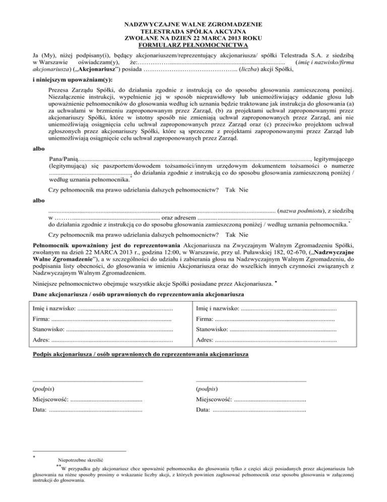 NADZWYCZAJNE WALNE ZGROMADZENIE TELESTRADA SPÓŁKA AKCYJNA ZWOŁANE NA DZIEŃ 22 MARCA 2013 ROKU FORMULARZ PEŁNOMOCNICTWA Ja (My), niżej podpisany(i), będący akcjonariuszem/reprezentujący akcjonariusza/ spółki Telestrada S.A. z siedzibą w Warszawie oświadczam(y), że:……………....................................................................... (imię i nazwisko/firma akcjonariusza) („Akcjonariusz”) posiada …………………………………….. (liczba) akcji Spółki, i niniejszym upoważniam(y): Prezesa Zarządu Spółki, do działania zgodnie z instrukcją co do sposobu głosowania zamieszczoną poniżej. Niezałączenie instrukcji, wypełnienie jej w sposób nieprawidłowy lub uniemożliwiający oddanie głosu lub upoważnienie pełnomocników do głosowania według ich uznania będzie traktowane jak instrukcja do głosowania (a) za uchwałami w brzmieniu zaproponowanym przez Zarząd, (b) za projektami uchwał zaproponowanymi przez akcjonariuszy Spółki, które w istotny sposób nie zmieniają uchwał zaproponowanych przez Zarząd, ani nie uniemożliwiają osiągnięcia celu uchwał zaproponowanych przez Zarząd oraz (c) przeciwko projektom uchwał zgłoszonych przez akcjonariuszy Spółki, które są sprzeczne z projektami zaproponowanymi przez Zarząd lub uniemożliwiają osiągnięcie celu uchwał zaproponowanych przez Zarząd. albo Pana/Panią................................................................................................................... ............................, legitymującego (legitymującą) się paszportem/dowodem tożsamości/innym urzędowym dokumentem tożsamości o numerze .................................................., do działania zgodnie z instrukcją co do sposobu głosowania zamieszczoną poniżej / według uznania pełnomocnika.* Czy pełnomocnik ma prawo udzielania dalszych pełnomocnictw? Tak Nie albo ............................................................................................................................................ (nazwa podmiotu), z siedzibą w ………..................................................... oraz adresem ............................................................................................... do działania zgodnie z instrukcją co do sposobu głosowania zamieszczoną poniżej / według uznania pełnomocnika. * Czy pełnomocnik ma prawo udzielania dalszych pełnomocnictw? Tak Nie Pełnomocnik upoważniony jest do reprezentowania Akcjonariusza na Zwyczajnym Walnym Zgromadzeniu Spółki, zwołanym na dzień 22 MARCA 2013 r., godzina 12:00, w Warszawie, przy ul. Puławskiej 182, 02-670, („Nadzwyczajne Walne Zgromadzenie”), a w szczególności do udziału i zabierania głosu na Nadzwyczajnym Walnym Zgromadzeniu, do podpisania listy obecności, do głosowania w imieniu Akcjonariusza oraz do wszelkich innych czynności związanych z Nadzwyczajnym Walnym Zgromadzeniem. Niniejsze pełnomocnictwo obejmuje wszystkie akcje Spółki posiadane przez Akcjonariusza. Dane akcjonariusza / osób uprawnionych do reprezentowania akcjonariusza Imię i nazwisko: ........................................................... Imię i nazwisko: ........................................................... Firma: .......................................................................... Firma: .......................................................................... Stanowisko: .................................................................. Stanowisko: .................................................................. Adres: ........................................................................... Adres: ........................................................................... Podpis akcjonariusza / osób uprawnionych do reprezentowania akcjonariusza __________________________________ __________________________________ (podpis) (podpis) Miejscowość: ............................................ Miejscowość: ............................................ Data: ......................................................... Data: ......................................................... Niepotrzebne skreślić W przypadku gdy akcjonariusz chce upoważnić pełnomocnika do głosowania tylko z części akcji posiadanych przez akcjonariusza lub głosowania na różne sposoby prosimy o wskazanie liczby akcji, z których powinien zagłosować pełnomocnik oraz sposobu głosowania w załączonej instrukcji do głosowania. ZWRACAMY UWAGĘ, ŻE W PRZYPADKU ROZBIEŻNOŚCI POMIĘDZY DANYMI AKCJONARIUSZA WSKAZANYMI W PEŁNOMOCNICTWIE A DANYMI ZNAJDUJĄCYMI SIĘ NA LIŚCIE AKCJONARIUSZY SPORZĄDZONEJ W OPARCIU O WYKAZ OTRZYMANY OD PODMIOTU PROWADZĄCEGO DEPOZYT PAPIERÓW WARTOŚCIOWYCH (KRAJOWY DEPOZYT PAPIERÓW WARTOŚCIOWYCH S.A.) I PRZEKAZANEGO SPÓŁCE ZGODNIE Z ART. 4063 KODEKSU SPÓŁEK HANDLOWYCH AKCJONARIUSZ MOŻE NIE ZOSTAĆ DOPUSZCZONY DO UCZESTNICTWA W ZWYCZAJNYM WALNYM ZGROMADZENIU. ZWRACAMY UWAGĘ, ŻE SPÓŁKA NIE NAKŁADA OBOWIĄZKU UDZIELANIA PEŁNOMOCNICTWA NA POWYŻSZYM FORMULARZU. PONADTO SPÓŁKA NIE NAKŁADA OBOWIĄZKU UDZIELANIA PEŁNOMOCNICTWA PRZY WYKORZYSTANIU ŚRODKÓW KOMUNIKACJI ELEKTRONICZNEJ. SPÓŁKA ZASTRZEGA, ŻE AKCJONARIUSZ WYKORZYSTUJĄCY ELEKTRONICZNE ŚRODKI KOMUNIKACJI PONOSI WYŁĄCZNE RYZYKO ZWIĄZANE Z WYKORZYSTANIEM TEJ FORMY. ZWRACAMY UWAGĘ, ŻE ZGODNIE Z ART. 87 UST. 1 PKT 4) W ZW. Z 90 UST. 3 USTAWY O OFERCIE PUBLICZNEJ I WARUNKACH WPROWADZANIA INSTRUMENTÓW FINANSOWYCH DO ZORGANIZOWANEGO SYSTEMU OBROTU ORAZ O SPÓŁKACH PUBLICZNYCH („USTAWA O OFERCIE PUBLICZNEJ”) NA PEŁNOMOCNIKU, KTÓREMU NIE UDZIELONO PISEMNEJ WIĄŻĄCEJ INSTRUKCJI CO DO SPOSOBU GŁOSOWANIA, CIĄŻĄ OBOWIĄZKI INFORMACYJNE OKREŚLONE W ART. 69 USTAWY O OFERCIE PUBLICZNEJ W SZCZEGÓLNOŚCI POLEGAJĄCE NA OBOWIĄZKU ZAWIADOMIENIA KOMISJI NADZORU FINANSOWEGO ORAZ SPÓŁKI O OSIĄGNIĘCIU LUB PRZEKROCZENIU PRZEZ DANEGO PEŁNOMOCNIKA PROGU 5%, 10%, 15%, 20%, 25%, 33%, 50%, 75% OG