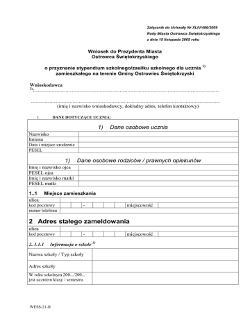 Załącznik do Uchwały Nr XLIV/486/2005 Rady Miasta Ostrowca Świętokrzyskiego z dnia 15 listopada 2005 roku Wniosek do Prezydenta Miasta Ostrowca Świętokrzyskiego o przyznanie stypendium szkolnego/zasiłku szkolnego dla ucznia zamieszkałego na terenie Gminy Ostrowiec Świętokrzyski 1) Wnioskodawca 2) :................................................................................................................................................... ...................................................................................................................................................... (imię i nazwisko wnioskodawcy, dokładny adres, telefon kontaktowy) DANE DOTYCZĄCE UCZNIA: I. 1) Dane osobowe ucznia Nazwisko Imiona Data i miejsce urodzenie PESEL 1) Dane osobowe rodziców / prawnych opiekunów Imię i nazwisko ojca PESEL ojca Imię i nazwisko matki PESEL matki 1..1 ulica Miejsce zamieszkania kod pocztowy numer telefonu - miejscowość 2 Adres stałego zameldowania ulica kod pocztowy 2..1.1.1 - Informacja o szkole 3) Nazwa szkoły / Typ szkoły Adres szkoły W roku szkolnym 200.../200... jest uczniem klasy / semestru WESS-21-II miejscowość II. UZASADNIENIE WNIOSKU 1. PoŜądana forma stypendium szkolnego ( Proszę dokonać wyboru poŜądanej formy wstawiając znak X do odpowiedniego okienka ): - zakup podręczników szkolnych - zakup lektur, słowników itp. - zakup wyposaŜenia szkolnego - zakup pomocy edukacyjnych - pokrycie kosztów udziału w zajęciach edukacyjnych - pokrycie kosztów związanych z pobieraniem nauki poza miejscem zamieszkania - pokrycie innych wydatków edukacyjnych: ............................................................................ ............................................................................ ............................................................................ (naleŜy podać jakich) 2. Sytuacja rodzinna ucznia ( uwzględnić wszystkie osoby spokrewnione lub niespokrewnione pozostające w faktycznym związku, wspólnie zamieszkujące i gospodarujące) Lp. Imię i nazwisko Data urodzenia Miejsce pracy nauki Stopień pokrewieństwa 1 2 3 4 5 6 7 8 9 10 3. Kwota miesięcznego dochodu ( netto ) 4) rodziny uzyskanego w miesiącu poprzedzającym miesiąc złoŜenia wniosku 3.1. Źródła oraz kwota miesięcznego dochodu (netto) rodziny uzyskanego w miesiącu poprzedzającym miesiąc złoŜenia wniosku : 1) wynagrodzenie ze stosunku pracy (netto) ..........................zł 2) działalność gospodarcza wykonywana osobiście na zasadach : a) ogólnych ......................... zł b) ryczałtu ewidencjonowanego ......................... zł ......................... zł 3) dochody z gospodarstwa rolnego(5) 4) emerytura/ renta/ renta strukturalna/ renta socjalna (netto) ......................... zł ......................... zł 5) świadczenie rehabilitacyjne 6) świadczenia rodzinne: WESS-21-II a) zasiłek rodzinny oraz dodatki do zasiłku rodzinnego b) zasiłek pielęgnacyjny c) świadczenie pielęgnacyjne 7) zasiłek dla bezrobotnych 8) zasiłki z pomocy społecznej 9) alimenty 10) dodatek mieszkaniowy 11) inne dochody Łącznie ........................ zł ........................ zł ........................ zł ........................ zł ........................ zł ........................ zł ........................ zł ........................ zł ......................... zł, WyŜej wymienione dochody naleŜy potwierdzić zaświadczeniami o ich wysokości: zaświadczeniami z ZUS o wysokości netto renty lub emerytury, zaświadczeniami wydanymi przez Miejski Ośrodek Pomocy Społecznej 3. 2. Wydatki rodziny: alimenty świadczone na rzecz innych osób w miesiącu poprzedzającym złoŜenie wniosku wyniosły ......................... zł. ......... gr. WyŜej wymienione wydatki naleŜy potwierdzić wyrokiem sądu lub zaświadczeniem. 3.3. Dochód miesięczny 6) na 1 osobę w rodzinie wyniósł ................................. zł. (Od sumy dochodów naleŜy odjąć sumę wydatków i wynik podzielić przez liczbę osób wymienionych w II. pkt 2.) 4. Opis trudnej sytuacji materialnej wynikającej z niskich dochodów na osobę w rodzinie lub będącej następstwem zdarzenia losowego ( wskazać w zaleŜności od rodzaju oczekiwanej pomocy w szczególności, czy w rodzinie występuje: bezrobocie, niepełnosprawność, cięŜka lub długotrwała choroba, wielodzietność, brak umiejętności wypełniania funkcji opiekuńczo – wychowawczych, alkoholizm, narkomania oraz czy rodzina jest niepełna lub jakie zdarzenie losowe miało miejsce i jaka w jego wyniku jest sytuacja materialna wnioskodawcy) ......................................................................................................................................................................................................... ......................................................................................................................................................................................................... ........................................................................................................................................................................................................ ......................................................................................................................................................................................................... ......................................................................................................................................................................................................... ........................................................................................................................................................................................................ ....................................................................................................................................