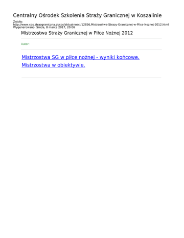 Centralny Ośrodek Szkolenia Straży Granicznej w Koszalinie Źródło: http://www.cos.strazgraniczna.pl/cos/aktualnosci/12856,Mistrzostwa-Strazy-Granicznej-w-Pilce-Noznej-2012.html Wygenerowano: Środa, 8 marca 2017, 20:06 Mistrzostwa Straży Granicznej w Piłce Nożnej 2012 Autor: Mistrzostwa SG w piłce nożnej - wyniki końcowe. Mistrzostwa w obiektywie.