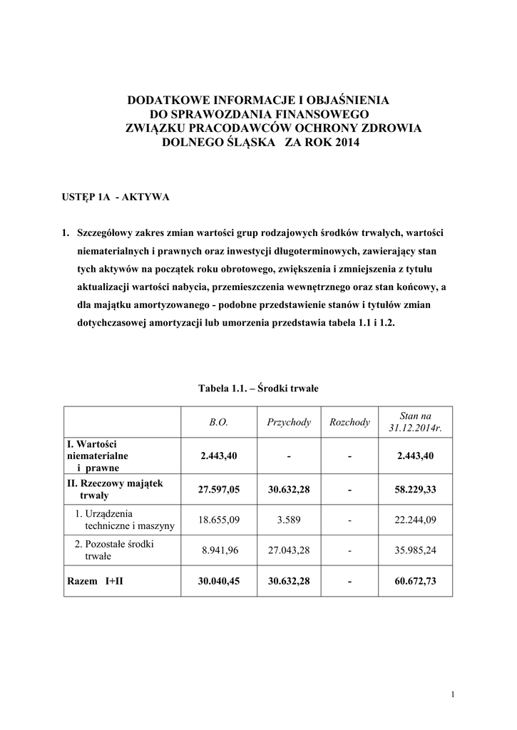 DODATKOWE INFORMACJE I OBJAŚNIENIA DO SPRAWOZDANIA FINANSOWEGO ZWIĄZKU PRACODAWCÓW OCHRONY ZDROWIA DOLNEGO ŚLĄSKA ZA ROK 2014 USTĘP 1A - AKTYWA 1. Szczegółowy zakres zmian wartości grup rodzajowych środków trwałych, wartości niematerialnych i prawnych oraz inwestycji długoterminowych, zawierający stan tych aktywów na początek roku obrotowego, zwiększenia i zmniejszenia z tytułu aktualizacji wartości nabycia, przemieszczenia wewnętrznego oraz stan końcowy, a dla majątku amortyzowanego - podobne przedstawienie stanów i tytułów zmian dotychczasowej amortyzacji lub umorzenia przedstawia tabela 1.1 i 1.2. Tabela 1.1. – Środki trwałe I. Wartości niematerialne i prawne II. Rzeczowy majątek trwały 1. Urządzenia techniczne i maszyny 2. Pozostałe środki trwałe Razem I+II B.O. Przychody Rozchody Stan na 31.12.2014r. 2.443,40 - - 2.443,40 27.597,05 30.632,28 - 58.229,33 18.655,09 3.589 - 22.244,09 8.941,96 27.043,28 - 35.985,24 30.040,45 30.632,28 - 60.672,73 1 Tabela 1.2. – Umorzenie środków trwałych B.O. I. Wartości niematerialne i prawne II. Rzeczowy majątek trwały Umorzenie w Umorzenie na okresie Zmniejszenia 31.12.2014r. sprawozdawczym 2.443,40 - - 2.443,40 22.836,95 32.060,28 - 22.836,95 1. Urządzenia techniczne i maszyny 13.894,99 5.017,00 - 13.894,99 2. Pozostałe środki trwałe 8.941,96 27.043,28 - 8.941,96 25.280,35 32.060,28 - 25.280,35 Razem I+II Tabela 1.3. – Inwestycje długoterminowe B.O. Zwiększenie Zmniejszenie B.Z. Udziały w spółce z o.o. MC2 - 6.000,00 - 6.000,00 Dopłata do kapitału zapasowego spółki z o.o. MC2 - - 4.000,00 (120 udziałów*50zł) 4,000,00 2. Wartość gruntów użytkowanych wieczyście Związek nie posiada gruntów w użytkowaniu wieczystym. 3. Wartość nie amortyzowanych lub nie umarzanych przez Stowarzyszenie środków trwałych, używanych na podstawie umów najmu, dzierżawy i innych umów, w tym z tytułu umów leasingu. Na podstawie umowy najmu Związek wykorzystuje na swoją działalność statutową lokal przy ul. Żelaznej 34 lokal 310,310A. 53-428 Wrocław. 4. Podział należności według pozycji bilansu o pozostałym od dnia bilansowego, przewidywanym umową, okresie spłaty. Należności długoterminowe w bilansie nie występują. 2 5. Dane o odpisach aktualizujących wartość należności, ze wskazaniem stanu na początek roku obrotowego, zwiększeń, wykorzystaniu, rozwiązaniu i stanu na koniec roku obrotowego. W 2014 roku nie dokonano odpisów aktualizujących wartości należności. 6. Wykaz istotnych pozycji czynnych i biernych rozliczeń międzyokresowych. Międzyokresowe rozliczenie kosztów w wysokości 20.963,08 zł dotyczy kosztów które będą rozliczone w 2015r a dotyczą: - projektu 2.1.2 ZZG 4.180,67 zł - projektu 2.1.2 ZZL 5.855,60 zł - projektu 2.1.2 FS 10.926,81 zł USTĘP 1B - PASYWA 1. Dane o funduszach własnych. Fundusz własny Związku wynosił: - na dzień 31.12.2009 roku 65,523,77 zł - na dzień 31.12.2010 r ( - 17.616,05 zł strata za 2010r) 47.907,72 zł. - na dzień 31.12.2011r (- 21.786,72 zł strata za 2011r) 26.121,00 zł - na dzień 31.12.2012r (+ 23.565,93 zł. zysk za 2012r) 49.686,93 zł - na dzień 31.12.2013r (+ 25.323,98 zł. zysk za 2013r) 75.010,91 zł W 2014 roku Związek osiągnął nadwyżkę przychodów nad kosztami w wysokości 5.426,05 zł która zwiększy fundusz własny. 2. Podział zobowiązań krótkoterminowych według pozycji bilansu o pozostałym od dnia bilansowego, przewidywanym umową, okresie spłaty. W bilansie Związku występują zobowiązania krótkoterminowe o okresie spłaty do 12 m-cy: z tytułu dostaw i usług z tytułu podatków, składek ubezpieczeniowych z tytułu należnych kosztów przejazdu razem 50.143,07 zł 489,87 zł 947,97 zł -----------------51.580,91 zł USTĘP 2 – WYJAŚNIENIA DO RACHUNKU WYNIKÓW. 1. Struktura przychodów z działalności statutowej W 2014 roku Związek osiągnął przychody ogółem 3. 254.692,50 zł 3 z tego: a) Przychody z działalności statutowej w tym: - składki członkowskie - wydanie gazetki o zdrowiu - prowizje od grup zakupowych - re-faktury za udział w konferencji osób dodatkowych - przygotowanie raportu o dotacje b) Pozostałe przychody operacyjne w tym: - dotacje i dofinansowania wykorzystane w 2014 roku - czynsz najmu lokalu 528.953,22 zł 411.488,50 zł 8.594 zł 98.210,72 zł 660.00 zł 10.000,00 zł 2.725.739,28 zł 2.725.169,28 zł 570 zł ad 1. Na realizacje projektów w 2014 roku Związek otrzymał dotacje i dofinansowania na kwotę 3.405.530,71 zł z czego wykorzystano w 2014r 2. 725.169,28 zł - zwrócono niewykorzystane środki a) do projektu 2.1.2 ZZG 5.190,52 zł b) do projektu 8.2.1 PONADNARODOWY 24.073,11 zł c) do projektu 2.1.1 ZZL 26.933,60 zł d) do projektu 2.1.2 FS LOKOMOTYWA 7.977,06 zł - pozostała kwota do wykorzystania w następnym roku 616.187,14 zł na realizacje: a) projektu 2.1.2 ZZG b) projektu 8.2.1 PONADNARODOWY c) projektu 2.1.2 ZZL d) projektu 2.1.2 FS LOKOMOTYKWA 141.230,77 zł 31.766,97 zł 154.022,17 zł 289.167,23 zł W 2014 roku wykorzystano dotacje w wysokości 2.725.169,28 zł na następujące projekty: - Projekt POKL 2.1.2/2014/S „Zarzadzanie zmianą gospodarczą w przedsiębiorstwach branży medycznej od 01.09.2014 do 31.07.2015 roku w celu rozwoju partnerstwa dla zwiększenia adaptacyjności. 41.117,47 zł - Projekt PONAD POKL 08.02-35/12 ponadnarodowy „Jednostki naukowe + przedsiębiorcy = rozwój współpracy w zakresie genetyki na Dolnym Śląsku „ finansowany przez Urząd Marszałkowski Województwa Dolnośląskiego realizowany w kresie od 01.07.2013 do 31.12.2014 roku w celu wsparcia dla współpracy sfery nauki i przedsiębiorstw dolnośląskich 763.831,63 zł - Projekt 2.1.2 ZZL „Zarządzanie bez tajemnic. Wdrożenie standardów zarządzania zasobami ludzkimi w firmach branży medycznej „ finansowany przez Polska Agencję Rozwoju Przedsiębiorczości realizowany w okresie od 01.11.2013 do 31.07.2015 roku 4 w celu ro