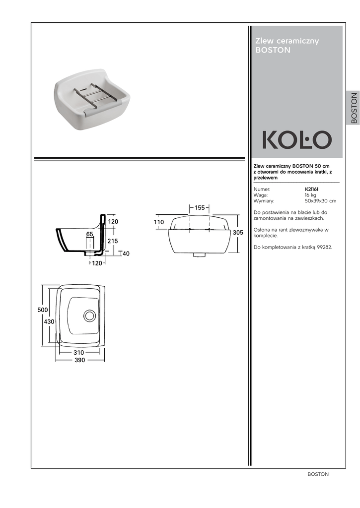 BOSTON Zlew ceramiczny BOSTON Zlew ceramiczny BOSTON 50 cm z otworami do mocowania kratki, z przelewem ________________________________ Numer: Waga: Wymiary: K21161 16 kg 50x39x30 cm Do postawienia na blacie lub do zamontowania na zawieszkach. Osłona na rant zlewozmywaka w komplecie. Do kompletowania z kratką 99282. BOSTON