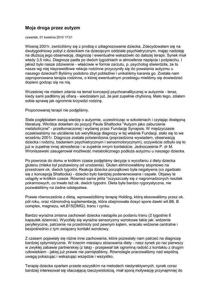 Moja droga przez autyzm czwartek, 01 kwietnia 2010 17:01 Wiosną 2001r. zwróciliśmy się z prośbą o zdiagnozowanie dziecka. Zdecydowałam się na dwutygodniowy pobyt z dzieckiem na dziecięcym oddziale psychiatrycznym, mając nadzieję na dłuższą jego obserwację, diagnozę i ewentualne wskazówki do dalszej terapii. Synek miał wtedy 3,5 roku. Diagnoza padła po dwóch tygodniach w atmosferze napięcia i pośpiechu. I jakież było nasze zdziwienie - właściwie w formie zarzutu, p. psycholog stwierdziła, że to nasze wg niej nieprawidłowe relacje rodzinne przyczyniły się do powstania autyzmu u naszego dziecka!!! Byliśmy podobno zbyt pobłażliwi i unikaliśmy karania go. Została nam zaproponowana terapia rodzinna, o której ewentualnym przebiegu mieliśmy się dowiedzieć dopiero godząc się na nią. Wcześniej nie miałam zdania na temat koncepcji psychoanalitycznej w autyzmie - teraz, kiedy sami padliśmy jej ofiarą - wiedziałam już, że jest zupełnie chybioną. Mało tego, zdałam sobie sprawę jak ogromnie krzywdzi rodzinę. Proponowanej terapii nie podjęliśmy. Stale pogłębiałam swoją wiedzę o autyzmie, uczestnicząc w szkoleniach i czytając dostępną literaturę. Wkrótce dotarłam do pozycji Paula Shattocka "Autyzm jako zaburzenie metaboliczne" - przetłumaczonej i wydanej przez Fundację Synapsis. W międzyczasie oczekiwaliśmy na uściślenie lub weryfikację diagnozy w tej właśnie Fundacji, stało się to we wrześniu 2001r. Diagnoza została potwierdzona (poprzedzona wywiadem, obserwacją dziecka i rodziny, badaniem psychiatrycznym i sensomotorycznym), oczywiście odbyło się to już w zupełnie innej atmosferze i w zupełnie innym kontekście. Jednocześnie P. dr M. Wroniszewski zasugerował możliwość metabolicznego podłoża autyzmu u naszego dziecka. Po powrocie do domu w krótkim czasie podjęliśmy decyzje o wycofaniu z diety dziecka glutenu (mleka był pozbawiony od urodzenia). Gluten eliminowaliśmy stopniowo na przestrzeni ok. dwóch tygodni. Reakcja dziecka początkowo była negatywna (co zgadzało się z koncepcją Shattocka) - dziecko było bardziej podenerwowane i ospałe. Objawy te ustąpiły w krótkim czasie. Również same jelita "oczyszczały się z nagromadzonych resztek pokarmowych, co trwało też ok. dwóch tygodni. Dieta była bardzo rygorystyczna, nie pozwalaliśmy na żadne odstępstwa. Prawie równocześnie z dietą, wprowadziliśmy terapię Holding, którą stosowaliśmy przez ok. pół roku, oraz różnorodną suplementację, która obejmowała dosyć spore dawki wit.B6, B complex, magnezu, wit.B15(DMG), tranu i cynku. Bardzo wyraźna zmiana zachowań dziecka nastąpiła po podaniu tranu (2 tygodnie 6 kapsułek dziennie). Wycofały się wyraźne sensoryzmy wzrokowe takie jak: widzenie peryferyczne, patrzenie na przedmioty pod pewnym kątem, wracało widzenie centralne i bezpośrednio z tym związany kontakt wzrokowy. Z czasem pojawiały się różne inne zachowania, które pozwalały nam patrzeć na diagnozę bardziej optymistycznie. W trzecim miesiącu stosowania diety - nasz synek po raz pierwszy w zwykłej zabawie partnerskiej (z tatą) - przejawiał tak ogromną radość z kontaktu z drugim człowiekiem - jakiej już prawie nie pamiętaliśmy. Równolegle pracowaliśmy nad wspólną uwagą pokazując i wskazując wszędzie i wszystko. Terapię dziecka oparłam przede wszystkim na metodach niedyrektywnych, synek coraz bardziej interesował się otaczającą rzeczywistością, miał sporą motywację przynajmniej do niektórych zabaw. Z czasem relacja "wymiany" staje się coraz bardziej wyraźna, odczuwamy coraz większą psychiczna więź z naszym dzieckiem. Zaczął dostrzegać innych ludzi (wita się i żegna z naszymi znajomymi przez podanie ręki i kontakt wzrokowy). Na uroczystościach rodzinnych, czy podczas wizyt znajomych - "czuje" się jego obecność. Zupełnie zanikło "patrzenie przez". Pojawiło się inne spojrzenie, wyraźnie nakierowane na osoby. Przeżywamy już sytuacje porozumiewania wzrokowego. Po określonych zadaniach, wykonując je - wzrokiem szuka potwierdzenia. To zupełnie dla nas nowe, ale jakże radosne doświadczenia. W rozwoju mowy, niestety nie było żadnych znaczących postępów. Pomimo artykułowania różnych dźwięków, słów, w mowie nie było komunikatów! Praktycznie mowa nie była mu do niczego potrzebna. Zresztą w dalszym ciągu jej nie rozumiał. Ponieważ przejawiał bardzo dobrą percepcję wzrokową, ze zdziwieniem odkryłam u niego ogromna łatwość czytania globalnego. Uważałam, że kluczem do mojego dziecka jest komunikacja, ponieważ nie mogłam oprzeć się na jej werbalnej formie, ani na obrazkowej, bo takiej nie posiadałam rozpoczęliśmy naukę czytania globalnego wg G. Domana. Wcześniej jednak starałam się odszukać, bądź narysować graficzną prezentację wyrazu, aby wiedział, co czyta. Połączenie obu percepcji okazało się właściwym posunięciem - to właśnie obrazek i słuchowe odzwierciedlenie wyciąga nasze dziecko z dźwiękowego chaosu. W tej chwili nazywa przedmioty, osoby, czynności z najbliższego otoczenia. Pojawia się coraz więcej mowy spontanicznej. Ma również za sobą pierwsze kontakty z innymi dziećmi. O nietolerancji glutenu, możemy się w każdej chwili przekonać. Po jego podaniu w jakiekolwiek formie - dziecko reaguje rozdrażnieniem i histerią. Zachowanie naszego dziecka w całej rozciągłości potwierdza teorie opioidalną P. Shattocka. Przed nami jeszcze wiele problemów, lata treningów (społecznego, komunikacji, mowy, i innych), ale wprowadzenie diety i suplementacji z całą pewnością spowodowało, że pracujemy już z innym dzieckiem, z dzieckiem, które już nie jest samotne, nie patrzy już "szklanym wzrokiem", jest już "z nami", z którym coraz lepiej się współpracuje i współdziała. Jego "skorupka " już pękła - rodzi się dla nas na nowo. Alicja Badowska, mama 4,5 letniego autystycznego Karol