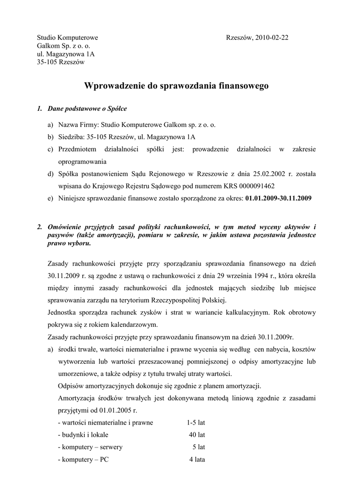 Studio Komputerowe Galkom Sp. z o. o. ul. Magazynowa 1A 35-105 Rzeszów Rzeszów, 2010-02-22 Wprowadzenie do sprawozdania finansowego 1. Dane podstawowe o Spółce a) Nazwa Firmy: Studio Komputerowe Galkom sp. z o. o. b) Siedziba: 35-105 Rzeszów, ul. Magazynowa 1A c) Przedmiotem działalności spółki jest: prowadzenie działalności w zakresie oprogramowania d) Spółka postanowieniem Sądu Rejonowego w Rzeszowie z dnia 25.02.2002 r. została wpisana do Krajowego Rejestru Sądowego pod numerem KRS 0000091462 e) Niniejsze sprawozdanie finansowe zostało sporządzone za okres: 01.01.2009-30.11.2009 2. Omówienie przyjętych zasad polityki rachunkowości, w tym metod wyceny aktywów i pasywów (także amortyzacji), pomiaru w zakresie, w jakim ustawa pozostawia jednostce prawo wyboru. Zasady rachunkowości przyjęte przy sporządzaniu sprawozdania finansowego na dzień 30.11.2009 r. są zgodne z ustawą o rachunkowości z dnia 29 września 1994 r., która określa między innymi zasady rachunkowości dla jednostek mających siedzibę lub miejsce sprawowania zarządu na terytorium Rzeczypospolitej Polskiej. Jednostka sporządza rachunek zysków i strat w wariancie kalkulacyjnym. Rok obrotowy pokrywa się z rokiem kalendarzowym. Zasady rachunkowości przyjęte przy sprawozdaniu finansowym na dzień 30.11.2009r. a) środki trwałe, wartości niematerialne i prawne wycenia się według cen nabycia, kosztów wytworzenia lub wartości przeszacowanej pomniejszonej o odpisy amortyzacyjne lub umorzeniowe, a także odpisy z tytułu trwałej utraty wartości. Odpisów amortyzacyjnych dokonuje się zgodnie z planem amortyzacji. Amortyzacja środków trwałych jest dokonywana metodą liniową zgodnie z zasadami przyjętymi od 01.01.2005 r. - wartości niematerialne i prawne - budynki i lokale - komputery – serwery - komputery – PC 1-5 lat 40 lat 5 lat 4 lata - środki transportu 3 lata - inne środki trwałe 3 lata Środki trwałe o wartości nieprzekraczającej kwoty 1 000,00 PLN odnoszone są jednorazowo w koszty. b) należności krótkoterminowe wykazywane są w bilansie w wartości netto (pomniejszonej o odpisy aktualizacyjne). Należności wykazuje się w wartości wymagającej do zapłaty. Odpisy aktualizacyjne tworzone są z uwzględnieniem stopnia ryzyka jakie wiąże się z dana należnością. c) materiały i towary są wyceniane według rzeczywistych cen zakupu; Spółka przyjęła następujące zasady ustalania wartości rozchodu: − rozchód towarów z magazynu następuje według rzeczywistych cen zakupu, d) półprodukty i produkcję w toku (jeżeli występuje) na dzień bilansowy wycenia się w wysokości bezpośrednich kosztów wytworzenia, e) zobowiązania długoterminowe i krótkoterminowe wycenione są w kwocie wymagającej zapłaty, f) spółka nie tworzy rezerw na nagrody jubileuszowe, g) w przypadku wystąpienia przejściowych różnic miedzy wykazywaną w księgach rachunkowych wartością aktywów i pasywów, a ich wartością podatkową oraz wystąpienia straty podatkowej możliwej do odliczenia, jednostka tworzy rezerwę i ustala aktywa z tytułu odroczonego podatku dochodowego od osób prawnych; wysokość rezerw i aktywów z tytułu odroczonego podatku dochodowego ustala się przy uwzględnieniu stawek podatku dochodowego obowiązujących w roku powstania obowiązku podatkowego. 3. Kontynuowanie działalności. W dniu 30.11.2009 roku nastąpiło połączenie spółek Studio Komputerowe Galkom sp. z o. o. i ABG S.A. poprzez przeniesienie całego majątku spółki przejmowanej tj. Galkom sp. z o. o. na spółkę przejmująca ABG SA ............................................... .................................................... .................................................... (podpis osoby sporządzającej) (miejscowość i data sporządzenia) (kierownik jednostki) Studio Komputerowe Galkom Sp. z o. o. ul. Magazynowa 1A 35-105 Rzeszów Rzeszów, 2010-02-22 Informacja dodatkowa do sprawozdania finansowego za rok 2009 1. Informacje i objaśnienia do bilansu. 1) Szczegółowy zakres zmian wartości grup rodzajowych środków trwałych, wartości niematerialnych i prawnych oraz inwestycji długoterminowych, zawierający stan tych aktywów na początek roku obrotowego, zwiększenia, zmniejszenia z tytułu: aktualizacji wartości, nabycia, przemieszczenia wewnętrznego oraz stan końcowy, a dla majątku amortyzowanego - podobne przedstawienie stanów i tytułów zmian dotychczasowej amortyzacji lub umorzenia. Nazwa grupy składników aktywów Stan na 01.01.2009 trwałych Wartości niematerialne i prawne Inne wartości niematerialne i prawne Rzeczowe aktywa trwałe Budynki i lokale Urządzenia techniczne i maszyny Środki transportu Pozostałe środki trwałe Razem Nazwa grupy składników aktywów trwałych Wartość nabycia Zwiększenia Zmniejszenia Stan na 30.11.2009 1 618 296,35 701 573,77 427 298,46 1 892 571,66 1 618 296,35 701 573,77 427 298,46 1 892 571,66 1 311 404,21 192 005,26 447 325,41 4 360,00 449 837,59 - 1 308 892,03 196 365,26 517 815,09 508 353,74 27 210,91 415 754,50 103 519,93 345 853,73 441 506,07 578 254,51 93 230,12 2 929 700,56 1 148 899,18 463,93 877 136,05 92 766,19 3 201 463,69 Umorzenie Stan na 01.01.2009 Zwiększenia Wartość netto Zmniejszenia Stan na 30.11.2009 Stan na 01.01.2009 Stan na 30.11.2009 Wartości niematerialne i prawne 1 613 629,05 210 407,76 427 298,46 1 396 738,35 4 667,30 495 833,31 Inne wartości niematerialne i prawne 1 613 629,05 210 407,76 427 298,46 1 396 738,35 4 667,30 495 833,31 Rzeczowe aktywa trwałe 869 808,02 183 564,60 372 652,27 680 720,35 441 596,19 628 171,68 Budynki i lokale 20 399,91 17 745,80 38 145,71 171 605,35 158 219,55 - Urządzenia techniczne i maszyny 411 499,03 40 978,27 100 801,75 351 675,55 106 316,06 89 830,52 Środki transportu 361 836,67 120 956,43 271 386,59 211 406,51 146 517,07 366 848,00 17 157,71 13 273,61 Pozostałe środki trwałe Razem 76 072,41 3 884,10 463,93 79 492,58 2 483 437,07 3