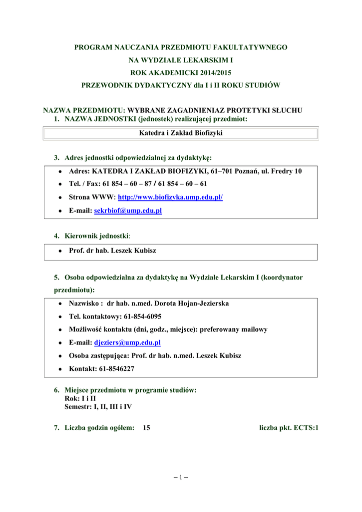 PROGRAM NAUCZANIA PRZEDMIOTU FAKULTATYWNEGO NA WYDZIALE LEKARSKIM I ROK AKADEMICKI 2014/2015 PRZEWODNIK DYDAKTYCZNY dla I i II ROKU STUDIÓW NAZWA PRZEDMIOTU: WYBRANE ZAGADNIENIAZ PROTETYKI SŁUCHU 1. NAZWA JEDNOSTKI (jednostek) realizującej przedmiot: Katedra i Zakład Biofizyki 3. Adres jednostki odpowiedzialnej za dydaktykę: Adres: KATEDRA I ZAKŁAD BIOFIZYKI, 61–701 Poznań, ul. Fredry 10 Tel. / Fax: 61 854 – 60 – 87 / 61 854 – 60 – 61 Strona WWW: http://www.biofizyka.ump.edu.pl/ E-mail: [email protected] 4. Kierownik jednostki: Prof. dr hab. Leszek Kubisz 5. Osoba odpowiedzialna za dydaktykę na Wydziale Lekarskim I (koordynator przedmiotu): Nazwisko : dr hab. n.med. Dorota Hojan-Jezierska Tel. kontaktowy: 61-854-6095 Możliwość kontaktu (dni, godz., miejsce): preferowany mailowy E-mail: [email protected] Osoba zastępująca: Prof. dr hab. n.med. Leszek Kubisz Kontakt: 61-8546227 6. Miejsce przedmiotu w programie studiów: Rok: I i II Semestr: I, II, III i IV 7. Liczba godzin ogółem: 15 liczba pkt. ECTS:1 ‒1‒ Jednostki uczestniczące w nauczaniu przedmiotu Katedra i Zakład Biofizyki Semestr zimowy liczba godzin Ćwiczenia W Ć S kategoria - - - Razem: 15 15 8. Zakres wiedzy (zgodnie z Rozporządzeniem Ministra Nauki i Szkolnictwa Wyższego z dnia 9 maja 2012 r. w sprawie standardów kształcenia dla kierunków Studiów: lekarskiego) B.W7. B.W8. B.W9. B.W25. B.W28. zna fizykochemiczne i molekularne podstawy działania narządów zmysłów; zna fizyczne podstawy nieinwazyjnych metod obrazowania; zna fizyczne podstawy wybranych technik terapeutycznych, w tym ultradźwięków i naświetlań; zna czynność i mechanizmy regulacji wszystkich narządów i układów organizmu człowieka, w tym układu: krążenia, oddechowego, moczowego; zna mechanizmy starzenia się organizmu; zna podstawowe ilościowe parametry opisujące wydolność poszczególnych układów i narządów, w tym ; zakres normy i czynniki demograficzne wpływające na wartość parametrów; B.W30. zna związek między czynnikami zaburzającymi stan równowagi procesów biologicznych a zmianami fizjologicznymi i patofizjologicznymi; F.W12 zna zagadnienia z zakresu laryngologii, foniatrii i audiologii , w tym: e) zasady postępowania diagnostycznego i terapeutycznego w zaburzeniach słuchu, głosu oraz mowy; B.W29. 9. Umiejętności (zgodnie z Rozporządzeniem Ministra Nauki i Szkolnictwa Wyższego z dnia 9 maja 2012 r. w sprawie standardów kształcenia dla kierunków Studiów: lekarskiego) B.U6. B.U11. D.U1. D.U3. przewiduje kierunek procesów biochemicznych; korzysta z baz danych, w tym internetowych i wyszukuje potrzebna informację za pomocą dostępnych narzędzi; uwzględnia w procesie postępowania terapeutycznego subiektywne potrzeby i oczekiwania pacjenta wynikające z uwarunkowań społeczno-kulturowych; wybiera takie leczenie, które minimalizuje konsekwencje społeczne dla chorego; D.U10. stosuje w podstawowym stopniu psychologiczne interwencje motywujące i wspierające; ‒2‒ D.U16. F.U26. rozpoznaje własne ograniczenia, dokonuje samooceny deficytów i potrzeb edukacyjnych, planuje własną aktywność edukacyjną. przeprowadza orientacyjne badanie słuchu. 10. SYLABUS SYLABUS Nazwa przedmiotu/modułu Wydział Nazwa kierunku studiów Poziom kształcenia Forma studiów Język przedmiotu WYBRANE ZAGADNIENIAZ PROTETYKI SŁUCHU Lekarski I lekarski stacjonarny j.polski obowiązkowy Rodzaj przedmiotu fakultatywny 1 2 3 4 5 6 7 8 9 10 11 12 Rok studiów/semestr I II III IV V VI Liczba godzin zajęć dydaktycznych z podziałem na formy prowadzenia zajęć 15h- seminaria Założenia i cele przedmiotu Celem kształcenia studentów w ramach zajęć fakultatywnych z protetyki słuchu jest wyposażenie ich w podstawowa wiedzę teoretyczną oraz praktyczne umiejętności dotyczące nieinwazyjnej diagnostyki peryferyjnego układu słuchowego, prawidłowego doboru i dopasowania nowoczesnych pomocy słuchowych z uwzględnieniem metod klasycznych jak i najnowszych trendów i osiągnięć nauki. Nabyte przez studentów kwalifikacje pozwolą im w przyszłości profesjonalnie pomagać osobom z problemami słuchowymi oraz osobom, dla których zmysł słuchu jest podstawowym zmysłem dalekosiężnym (niewidomym i słabowidzącym). Student na zajęciach fakultatywnych z protetyki słuchu powinien również zdobyć podstawowe umiejętności interpretacji rezultatów metod diagnostycznych stosowanych w protetyce słuchu. Duży nacisk położono na samodzielne czytanie i interpretowanie wyników w trakcie ćwiczeń co powinno przygotować studentów do formułowania problemów i ich rozwiązywania w oparciu o dostępną wiedzę. Symbol efektów kształcenia zgodnie ze standardami B.W7. B.W8. B.W9. B.W25. B.W28. OPIS KIERUNKOWYCH EFEKTÓW KSZTAŁCENIA WIEDZA (ZGODNIE ZE SZCZEGÓŁOWYMI EFEKTAMI KSZTAŁCENIA) zna fizykochemiczne i molekularne podstawy działania narządów zmysłów zna fizyczne podstawy nieinwazyjnych metod obrazowania zna fizyczne podstawy wybranych technik terapeutycznych, w tym ultradźwięków i naświetlań zna czynność i mechanizmy regulacji wszystkich narządów i układów organizmu człowieka, w tym układu: krążenia, oddechowego, moczowego zna mechanizmy starzenia się organizmu ‒3‒ Metody weryfikacji osiągnięcia zamierzonych efektów kształcenia: B.W29. B.W30. F.W12 B.U6. B.U11. D.U1. D.U3. D.U10. D.U16. F.U26. zna podstawowe ilościowe parametry opisujące wydolność poszczególnych układów i narządów, w tym ; zakres normy i czynniki demograficzne wpływające na wartość parametrów zna związek między czynnikami zaburzającymi stan równowagi procesów biologicznych a zmianami fizjologicznymi i patofizjologicznymi zna zagadnienia z zakresu laryngologii, foniatrii i audiologii , w tym: e) zasady postępowania diagnostycznego i terapeutycznego w zaburzeniach słuchu, głosu oraz mowy UMIEJĘTNOŚCI (ZGODNIE ZE SZCZEGÓŁOWYMI EFEKTAMI KSZTAŁCENIA) przewiduje kierunek
