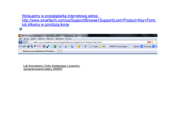 Wpisujemy w przeglądarkę internetową adres: http://www.smarttech.com/us/Support/Browse+Support/Lost+Product+Key+Form lub klikamy w poniższą ikonę Lub korzystamy z linku dostępnego z poziomu oprogramowania tablicy SMART Wpisujemy numer seryjny naszej tablicy oraz adres email Tu wpisujemy nr fabryczny tablicy Tu wpisujemy swój adres e-mail Zatwierdzamy Kolejna strona zawiera już nasz numer klucza do programu Notebook NB-XXXXX-XXXXX-XXXXX-XXXXX NB-XXXXX-XXXXX-XXXXX-XXXXX Na wpisany adres email otrzymujemy również list z naszym kluczem NB-XXXXX-XXXXX-XXXXX-XXXXX Kiedy znamy już nasz klucz aktywacyjny uruchamiamy program Notebook i wybieramy Wprowadź licencję 1. Klucz możemy przepisać lub przekopiować (zaznacz, Ctrl + C) i wkleić we wskazane miejsce (Ctrl + V). 2. Dalej wybieramy Dodaj. 3. Na zakończenie akceptujemy warunki umowy, z którą się zapoznaliśmy. 4. Wybieramy Dalej. WAŻNE! w czasie tych czynności nasz komputer musi mieć połączenie z siecią Internet. 1 2 4 3 Poprawnie wykonany proces aktywacji sygnalizowany jest poniższym komunikatem. NB-XXXXX-XXXXX-XXXXX-XXXXX