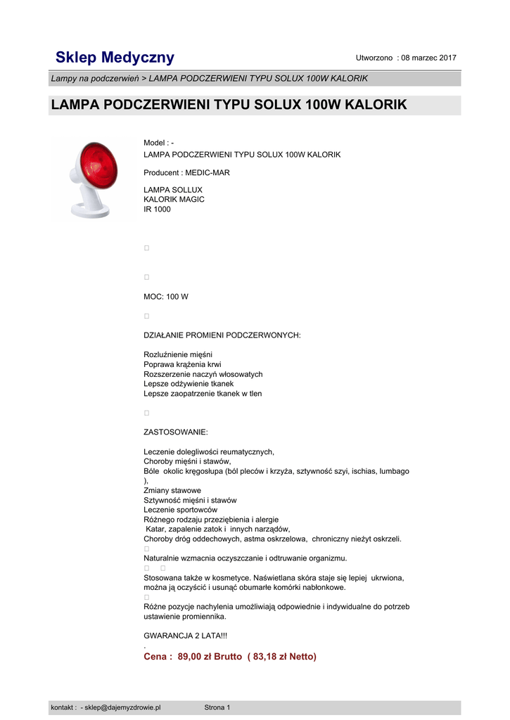 Sklep Medyczny Utworzono : 08 marzec 2017 Lampy na podczerwień > LAMPA PODCZERWIENI TYPU SOLUX 100W KALORIK LAMPA PODCZERWIENI TYPU SOLUX 100W KALORIK Model : LAMPA PODCZERWIENI TYPU SOLUX 100W KALORIK Producent : MEDIC-MAR LAMPA SOLLUX KALORIK MAGIC IR 1000 � � MOC: 100 W � DZIAŁANIE PROMIENI PODCZERWONYCH: Rozluźnienie mięśni Poprawa krążenia krwi Rozszerzenie naczyń włosowatych Lepsze odżywienie tkanek Lepsze zaopatrzenie tkanek w tlen � ZASTOSOWANIE: Leczenie dolegliwości reumatycznych, Choroby mięśni i stawów, Bóle okolic kręgosłupa (ból pleców i krzyża, sztywność szyi, ischias, lumbago ), Zmiany stawowe Sztywność mięśni i stawów Leczenie sportowców Różnego rodzaju przeziębienia i alergie Katar, zapalenie zatok i innych narządów, Choroby dróg oddechowych, astma oskrzelowa, chroniczny nieżyt oskrzeli. � Naturalnie wzmacnia oczyszczanie i odtruwanie organizmu. � � Stosowana także w kosmetyce. Naświetlana skóra staje się lepiej ukrwiona, można ją oczyścić i usunąć obumarłe komórki nabłonkowe. � Różne pozycje nachylenia umożliwiają odpowiednie i indywidualne do potrzeb ustawienie promiennika. GWARANCJA 2 LATA!!! . Cena : 89,00 zł Brutto ( 83,18 zł Netto) kontakt : - [email protected] Strona 1 Sklep Medyczny Utworzono : 08 marzec 2017 Lampy na podczerwień > LAMPA PODCZERWIENI TYPU SOLUX 100W KALORIK LAMPA PODCZERWIENI TYPU SOLUX 100W KALORIK Dostępność: Produkt dostępny w naszym sklepie od 21 październik 2010 kontakt : - [email protected] Strona 2